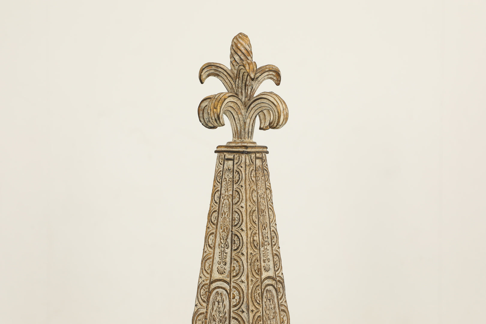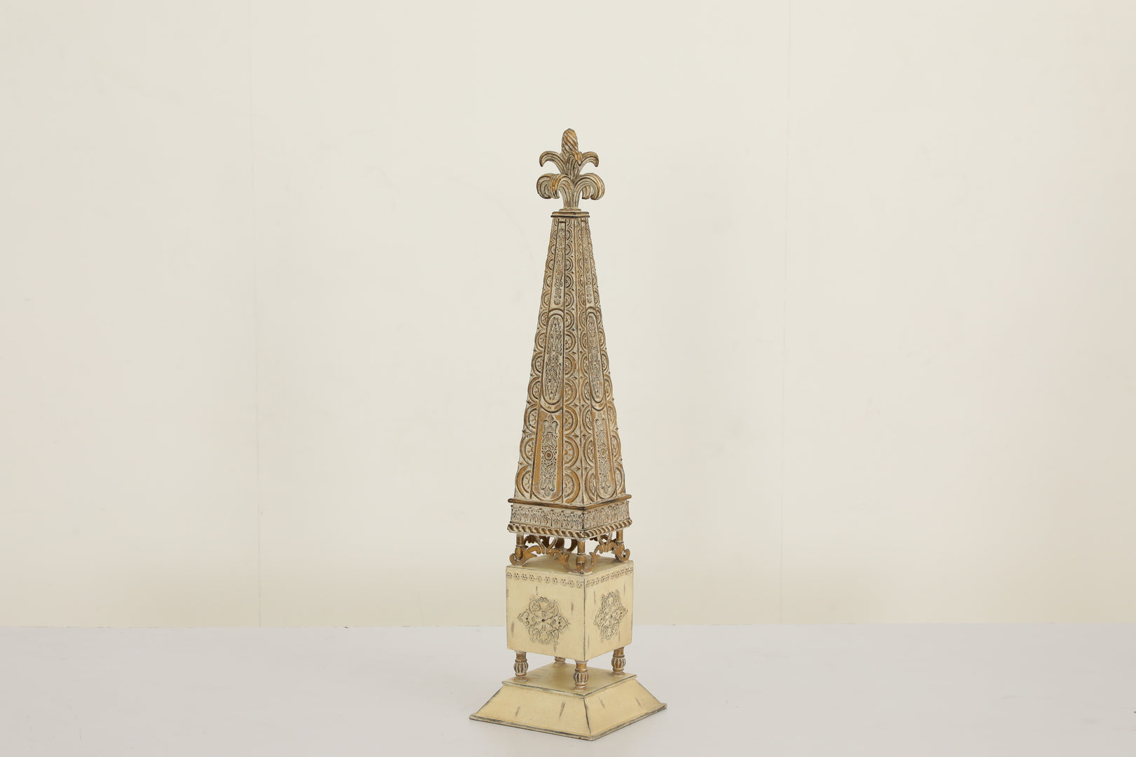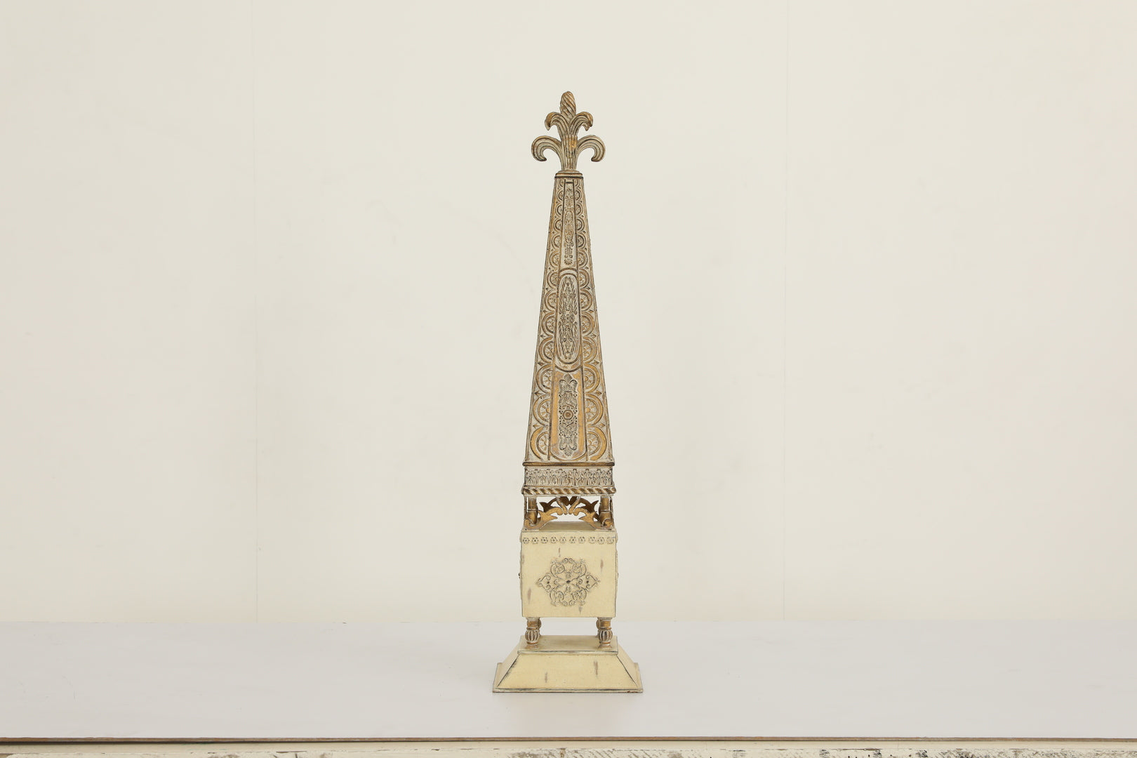 مسلة زخرفية فريدة بتصميم آسر على الطراز الكلاسيكي الفاخر، مصنوعة من مزيج من الخشب والراتنج والمعدن بلمسة نهائية عتيقة. تعكس هذه القطعة المميزة ذوقًا رفيعًا، إذ تتميز بهيكل هرمي متدرج مزين بنقوش بارزة تضفي عليها فخامة استثنائية. ويتوجها رمز زهرة الزنبق، معبرًا عن طابع ملكي ومكملاً أناقتها.