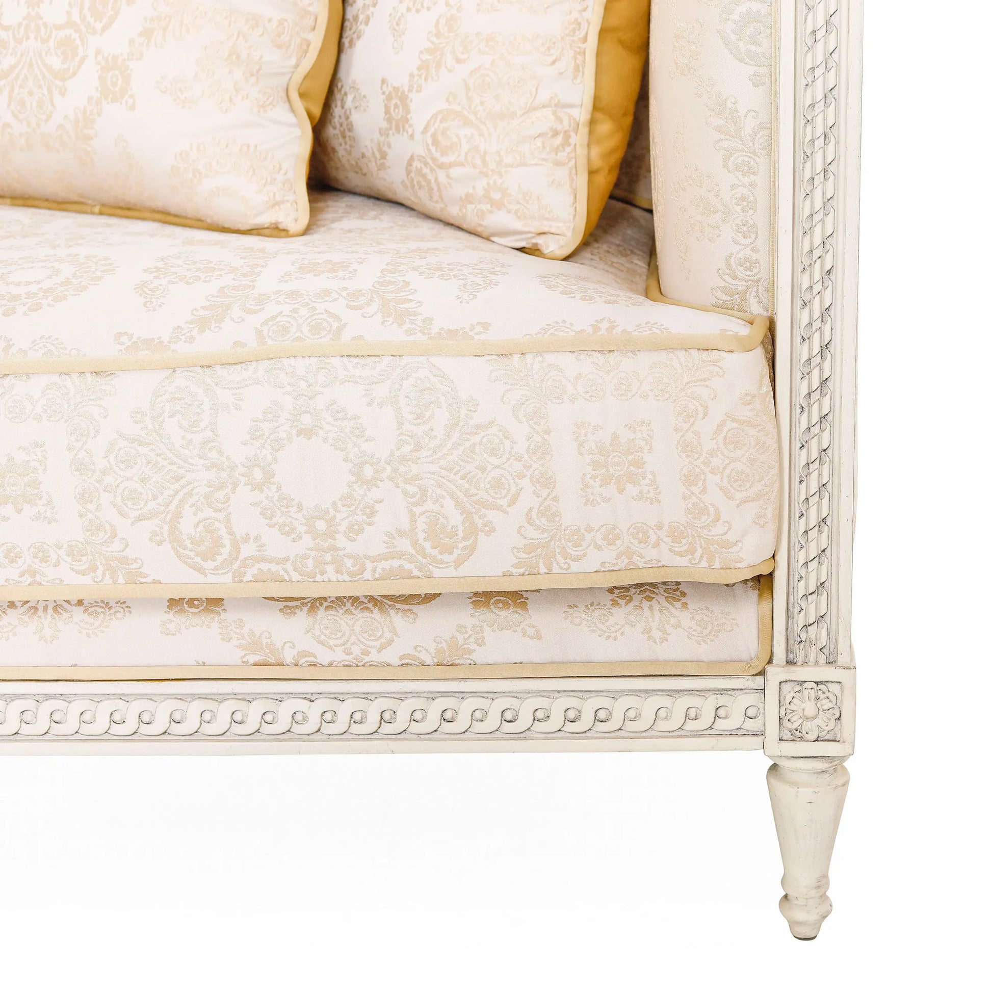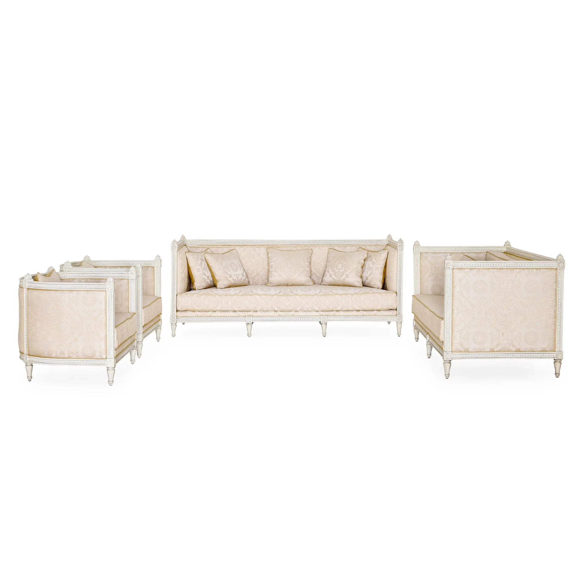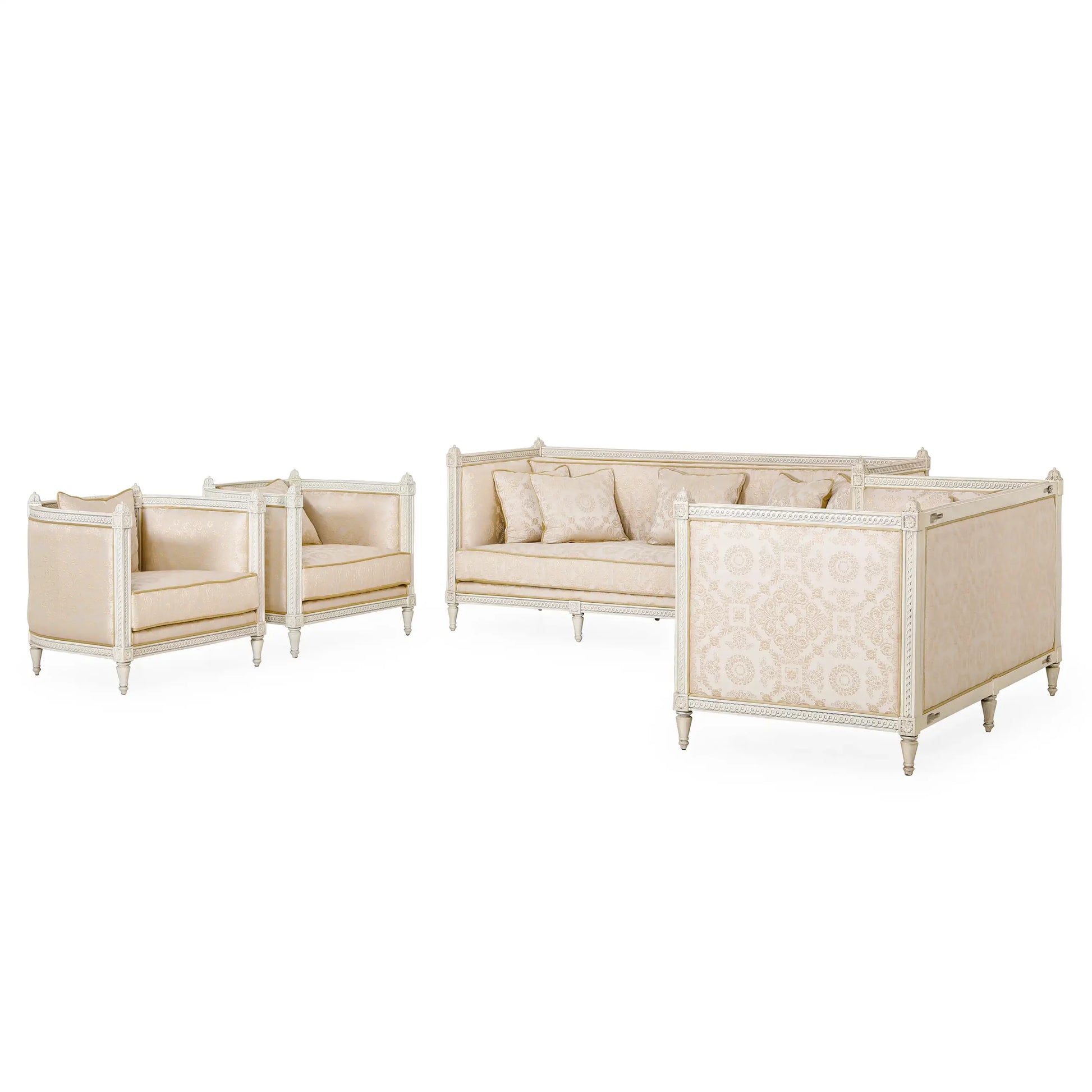 أريكة Dockie وLoveseat وكرسي (مجموعة من 4) الأرائك والكراسي ذات أذرع عالية. مصنوع من خشب الماهوجني بلمسة نهائية بيضاء عتيقة. تصميم عتيق، يتم نحت اليد في الأعلى والأسفل مع وريدات منحوتة يدويًا في أعلى وأسفل الحدود. تفاصيل التنجيد: ظهر ثابت، مقعد فضفاض ووسائد منجدة بتطريز زاري دمشقي على الساتان. الأريكة: العرض 220 × العمق 91 × الارتفاع 93 سم. مقعد الحب: الكرسي:يشارك