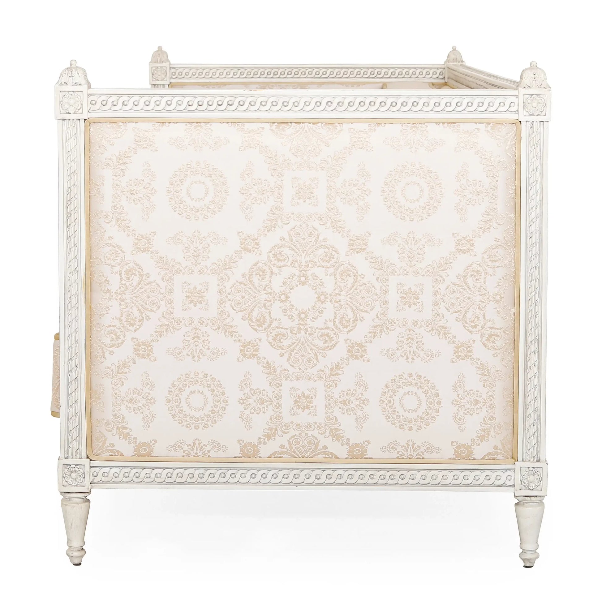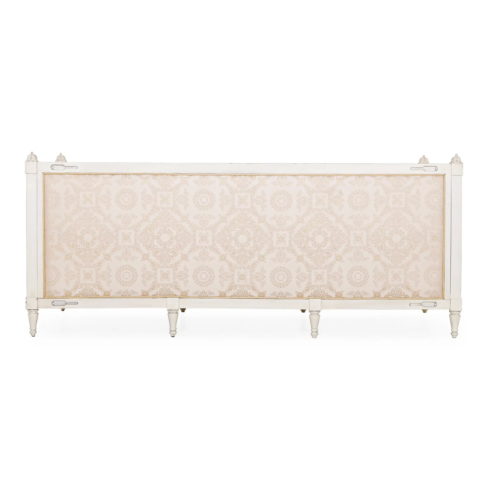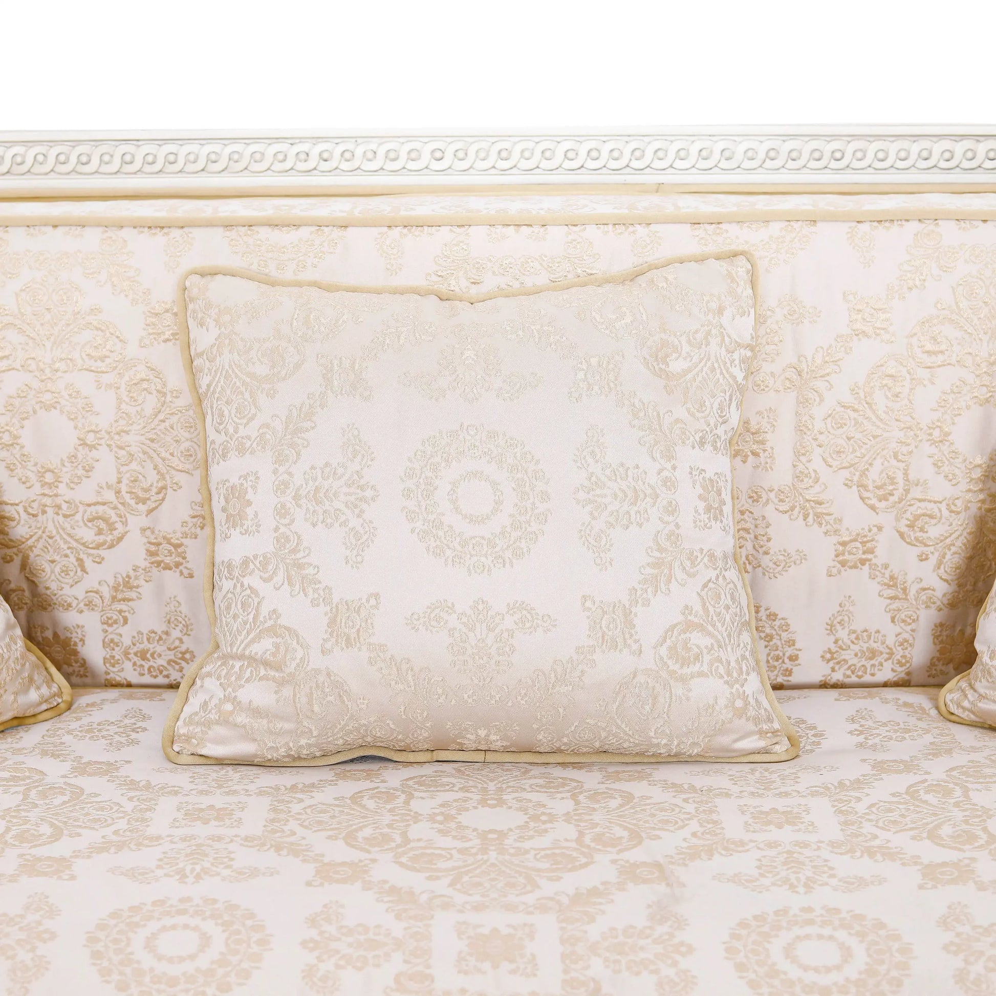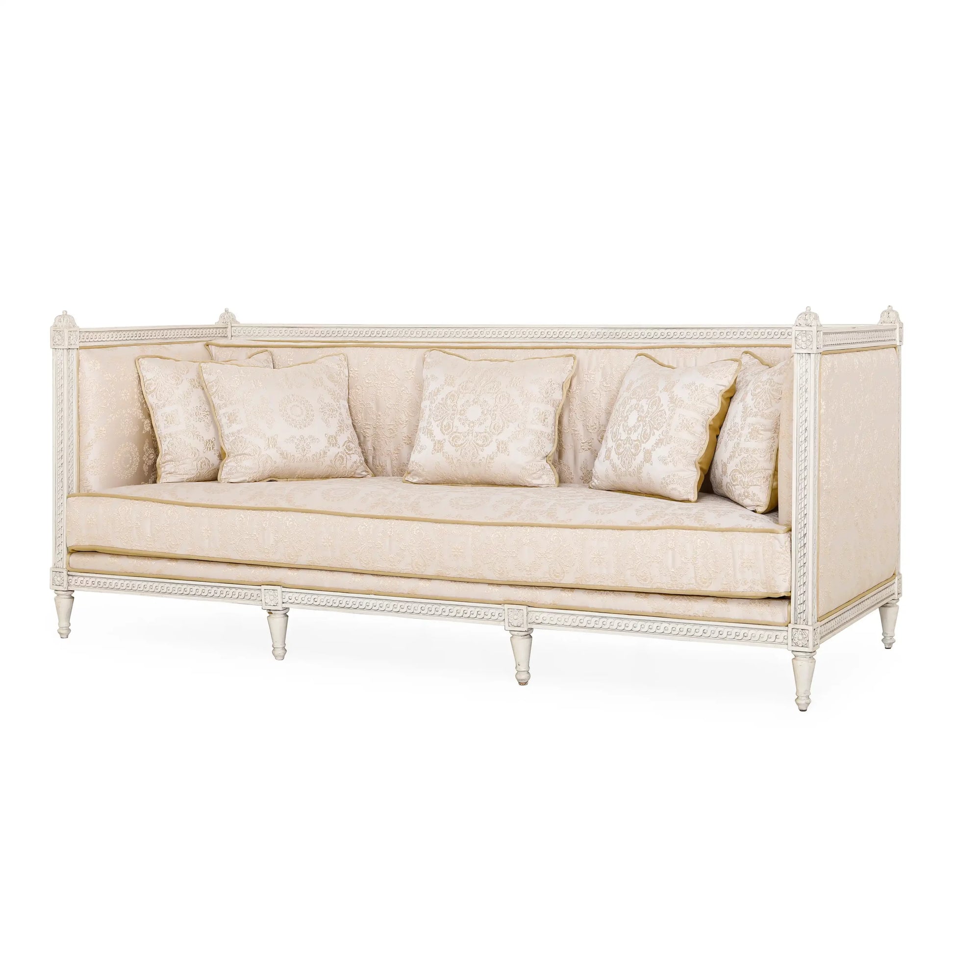 أريكة Dockie وLoveseat وكرسي (مجموعة من 4) الأرائك والكراسي ذات أذرع عالية. مصنوع من خشب الماهوجني بلمسة نهائية بيضاء عتيقة. تصميم عتيق، يتم نحت اليد في الأعلى والأسفل مع وريدات منحوتة يدويًا في أعلى وأسفل الحدود. تفاصيل التنجيد: ظهر ثابت، مقعد فضفاض ووسائد منجدة بتطريز زاري دمشقي على الساتان. الأريكة: العرض 220 × العمق 91 × الارتفاع 93 سم. مقعد الحب: الكرسي:يشارك