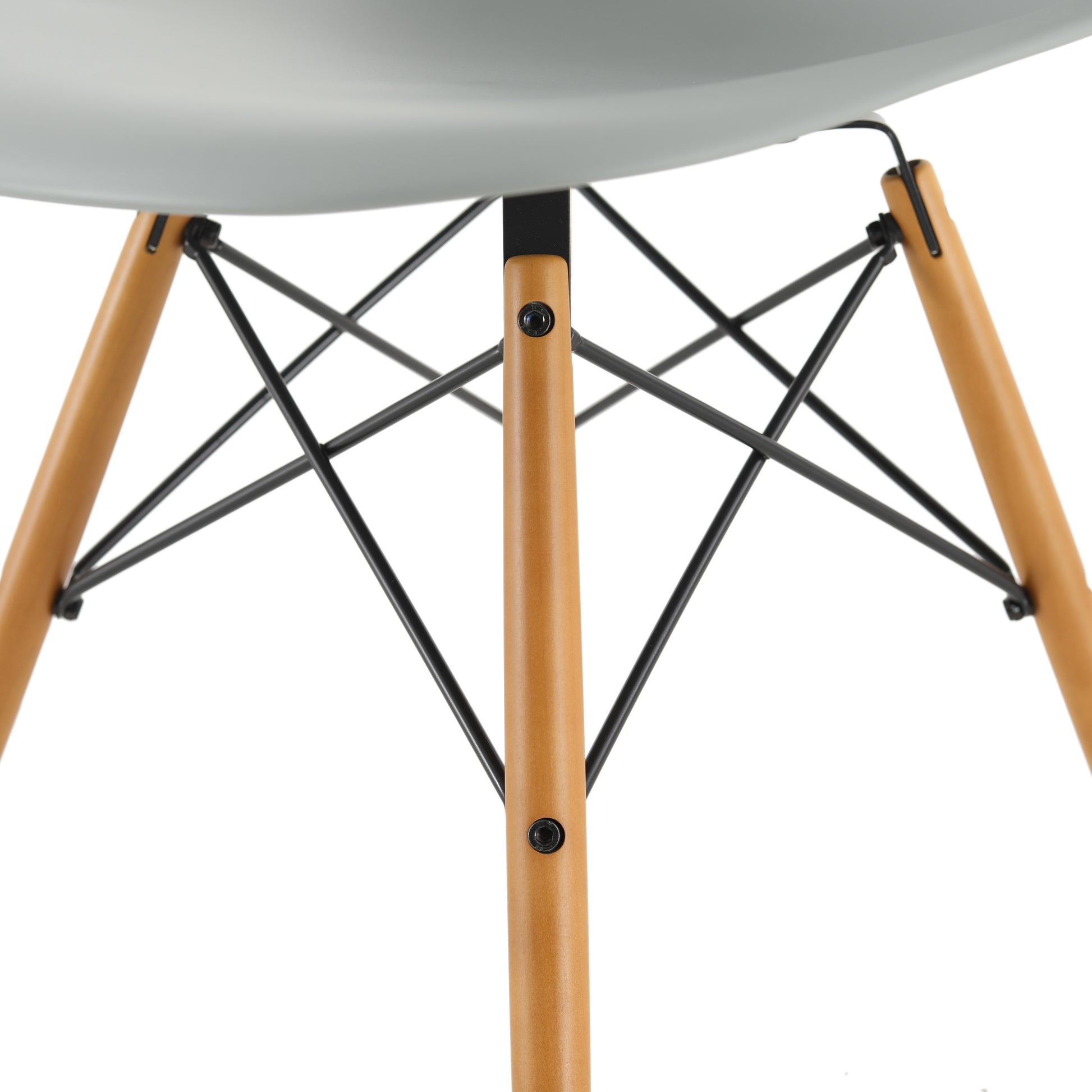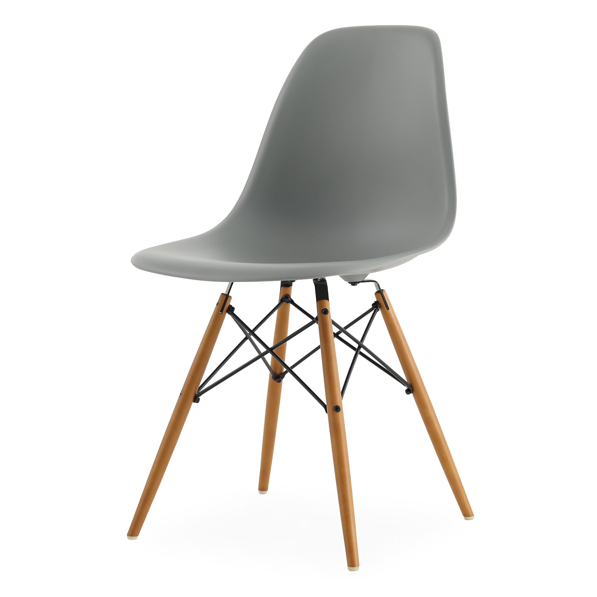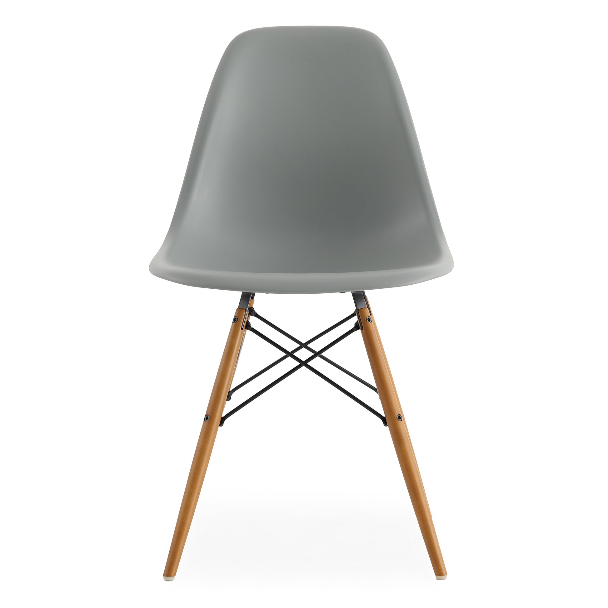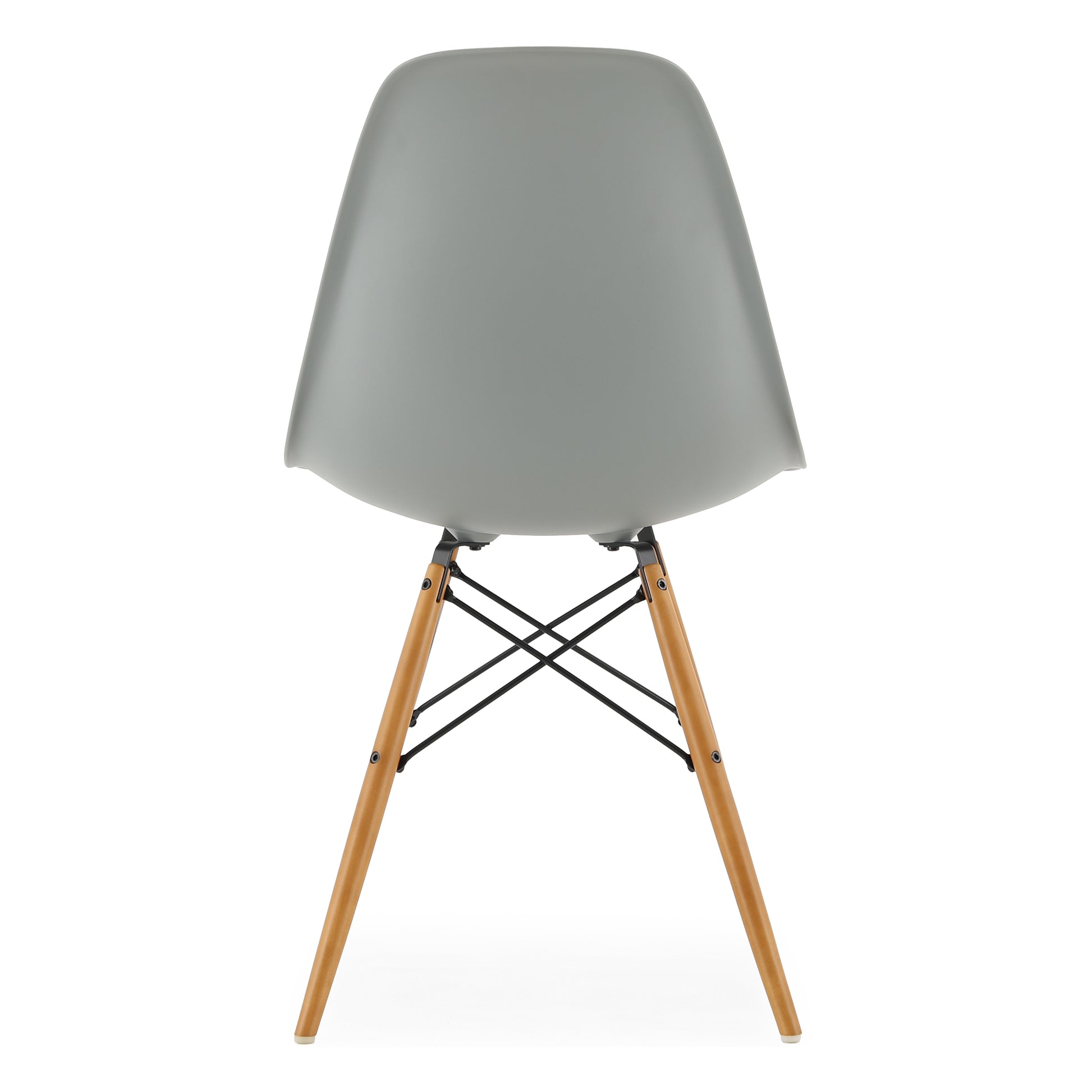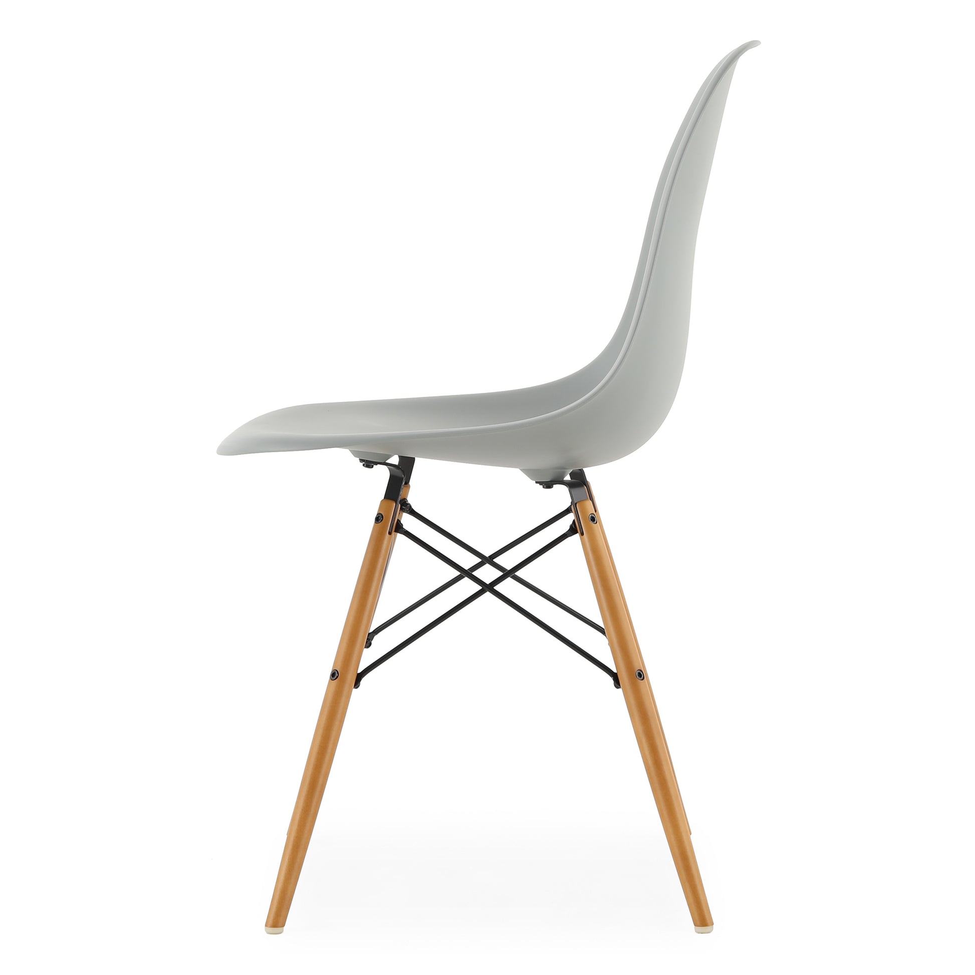 كرسي جانبي بلاستيكي من Vitra Eames بقاعدة خشبية مع دعامات متقاطعة غير قابلة للتكديس بالنسبة لقاعدة خشبية للكرسي الجانبي بارتفاع تناول الطعام (DSW)، قام تشارلز وراي إيمز بدمج هيكل المقعد ذو الشكل العضوي مع قاعدة خشبية ذات أربع أرجل. يضفي هذا المزيج من البلاستيك والخشب على التصميم الكلاسيكي دفءًا معينًا وجاذبية غير رسمية. يمكن تجهيز أغطية المقاعد بوسائد مقاعد أو تنجيد كامل بمجموعة واسعة من ألوان القماش، مما يتيح العديد من التكوينات الفردية.