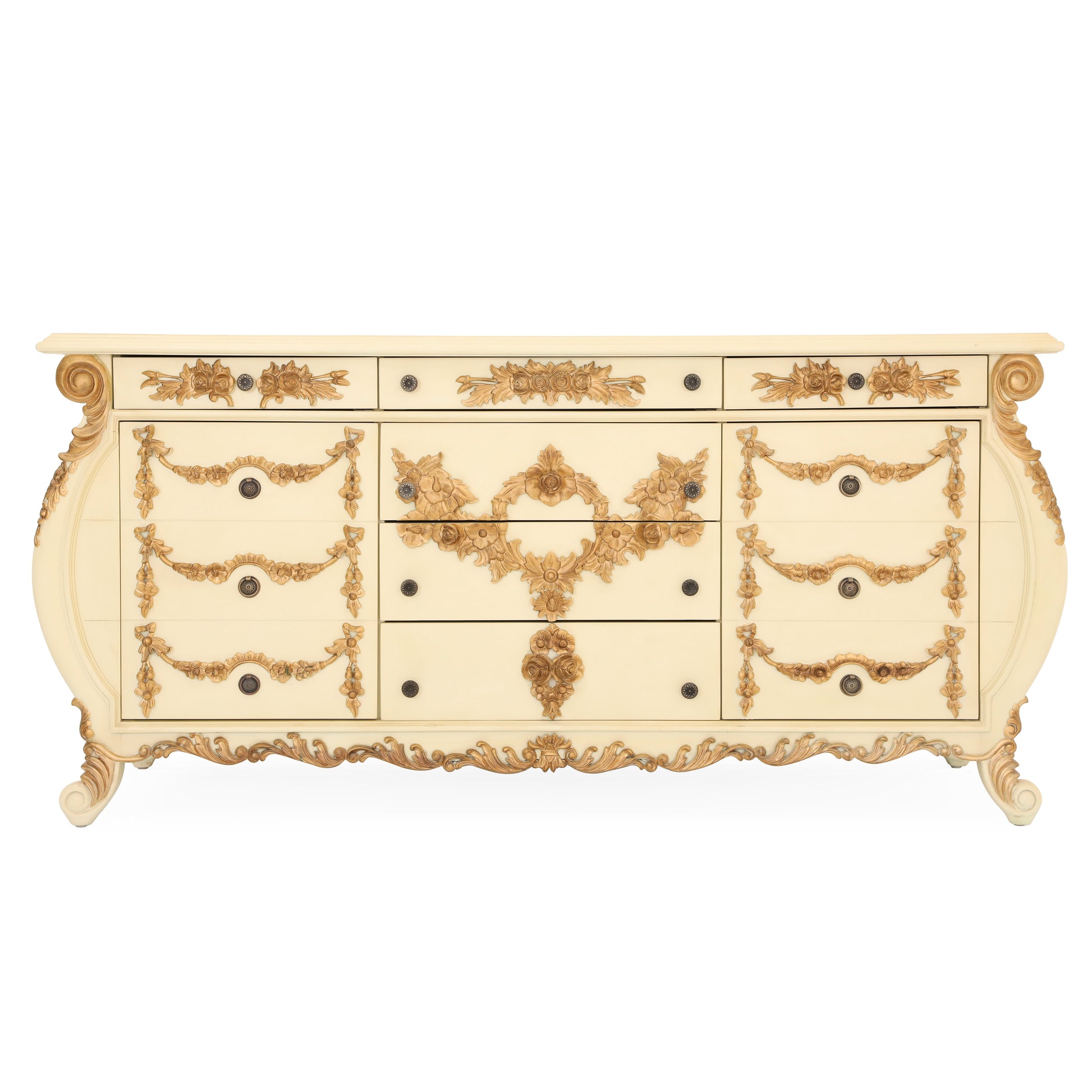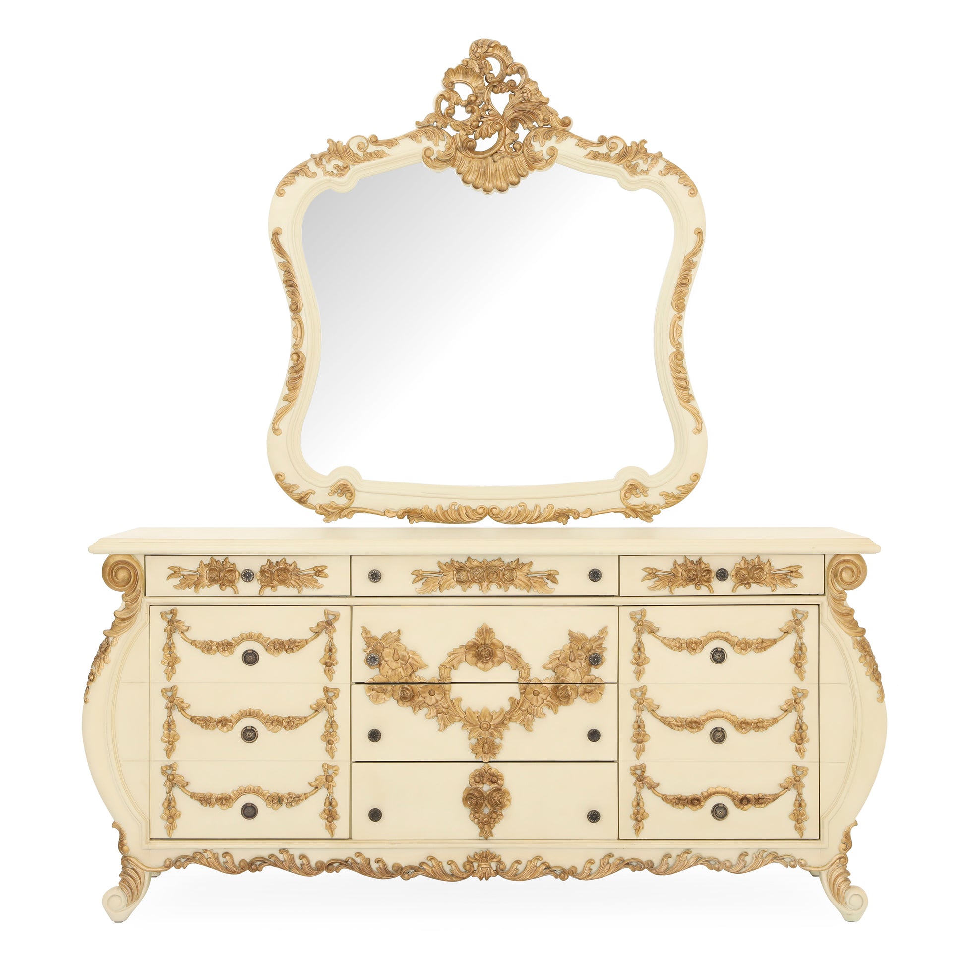 Emile King bed room. Made by mahogany wood. Hand carving. Antique ivory and gold finish.