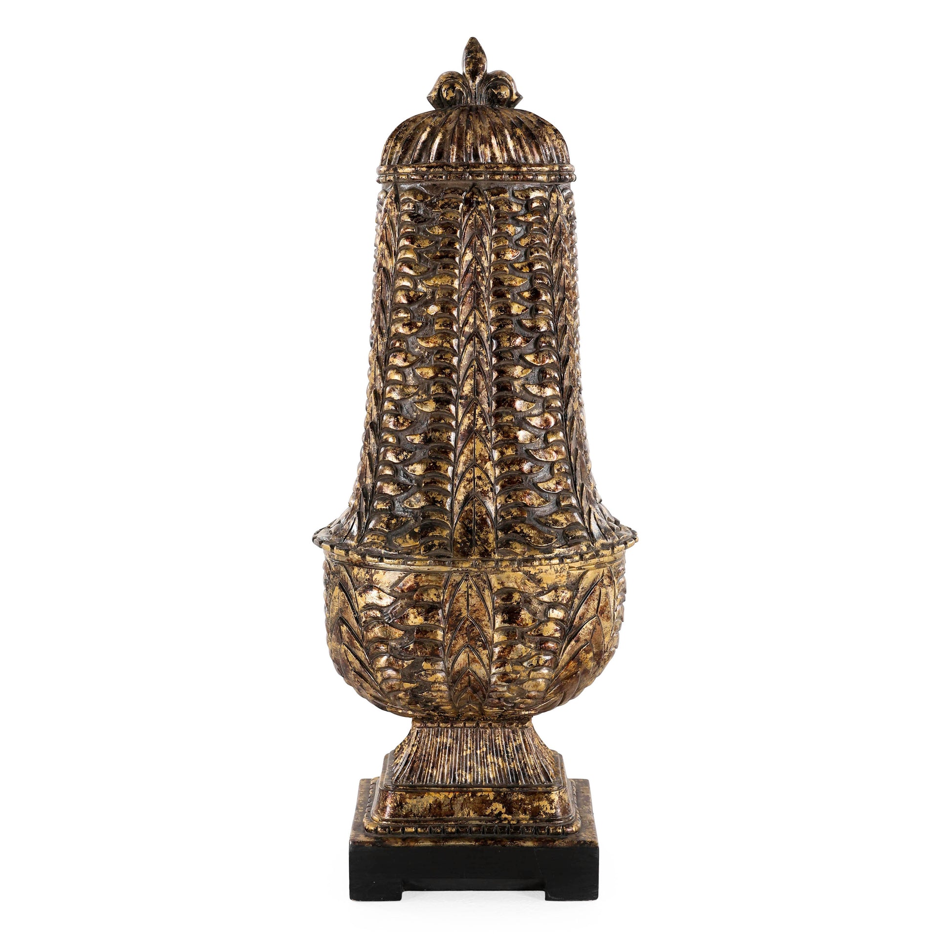 جرة خشبية فاخرة بتصميم فريد مستوحى من زهرة التوليب. تتميز بنقوش يدوية متقنة تغطيها بالكامل بلون ذهبي عتيق، مما يضفي عليها طابعًا تراثيًا. تستقر الجرة على قاعدة متينة ومتناسقة تعزز ثباتها وتكمل أناقتها. إنها قطعة ديكور استثنائية تضفي لمسة فخمة على المساحات الراقية.