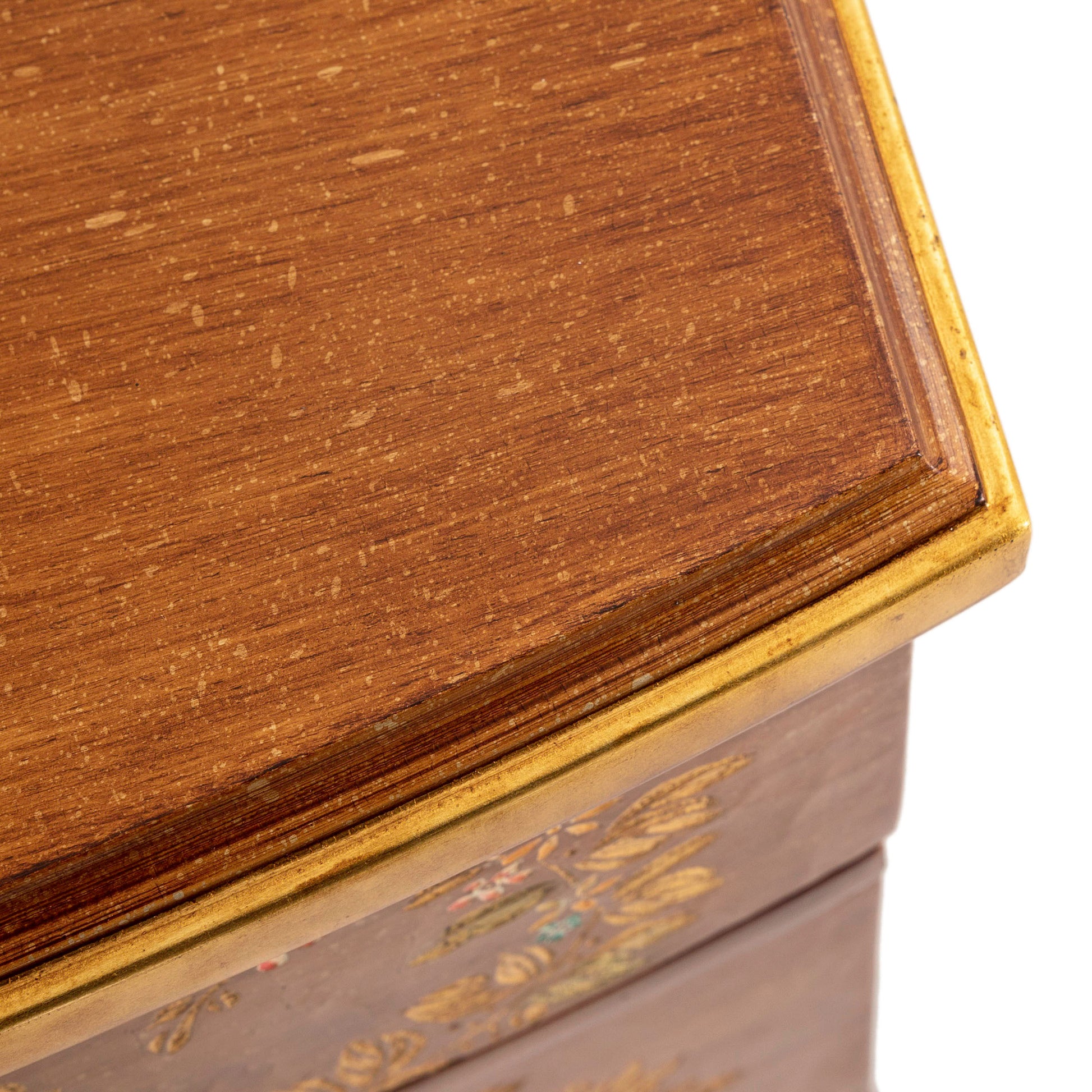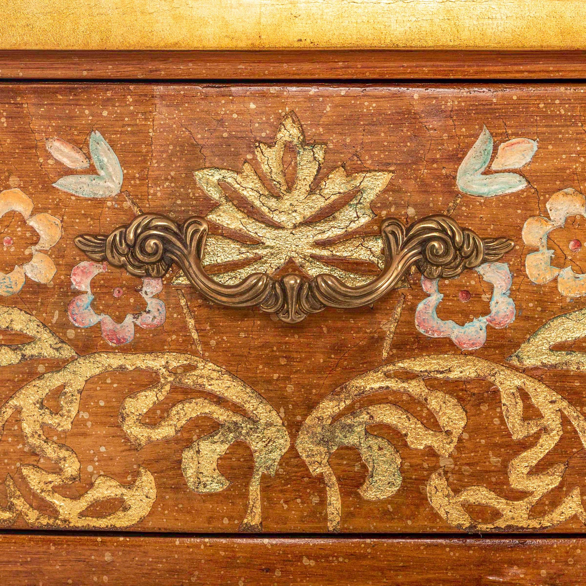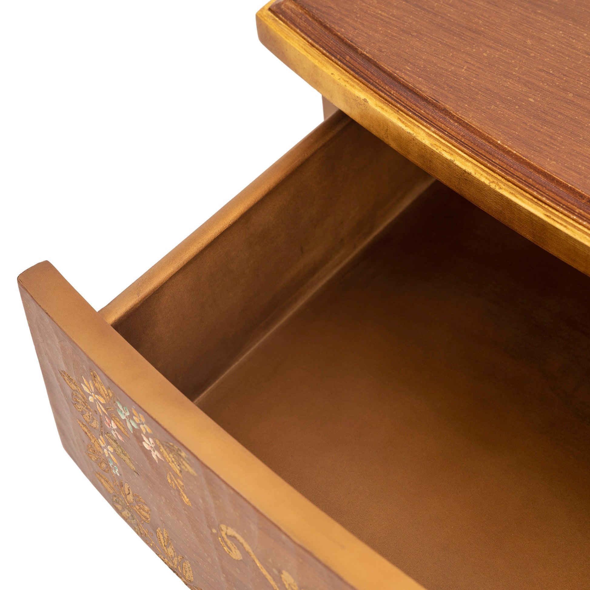 مرآة مميزة بتصميم كلاسيكي أنيق، تعكس براعة فائقة وجمالاً فنياً راقياً. تتميز بإطار خشبي منحوت يدوياً بتفاصيل انسيابية منحنية تضفي عليها طابعاً أنيقاً، مطلية بلون بني عتيق ومزينة برسومات زهور إبرة الراعي وزخارف بألوان زاهية تضفي عليها حيوية استثنائية. هذه المرآة جزء من طقم غرفة نوم متكامل يشمل لوحاً أمامياً أنيقاً للسرير، وطاولتين جانبيتين، وطاولة تزيين مع كرسي.