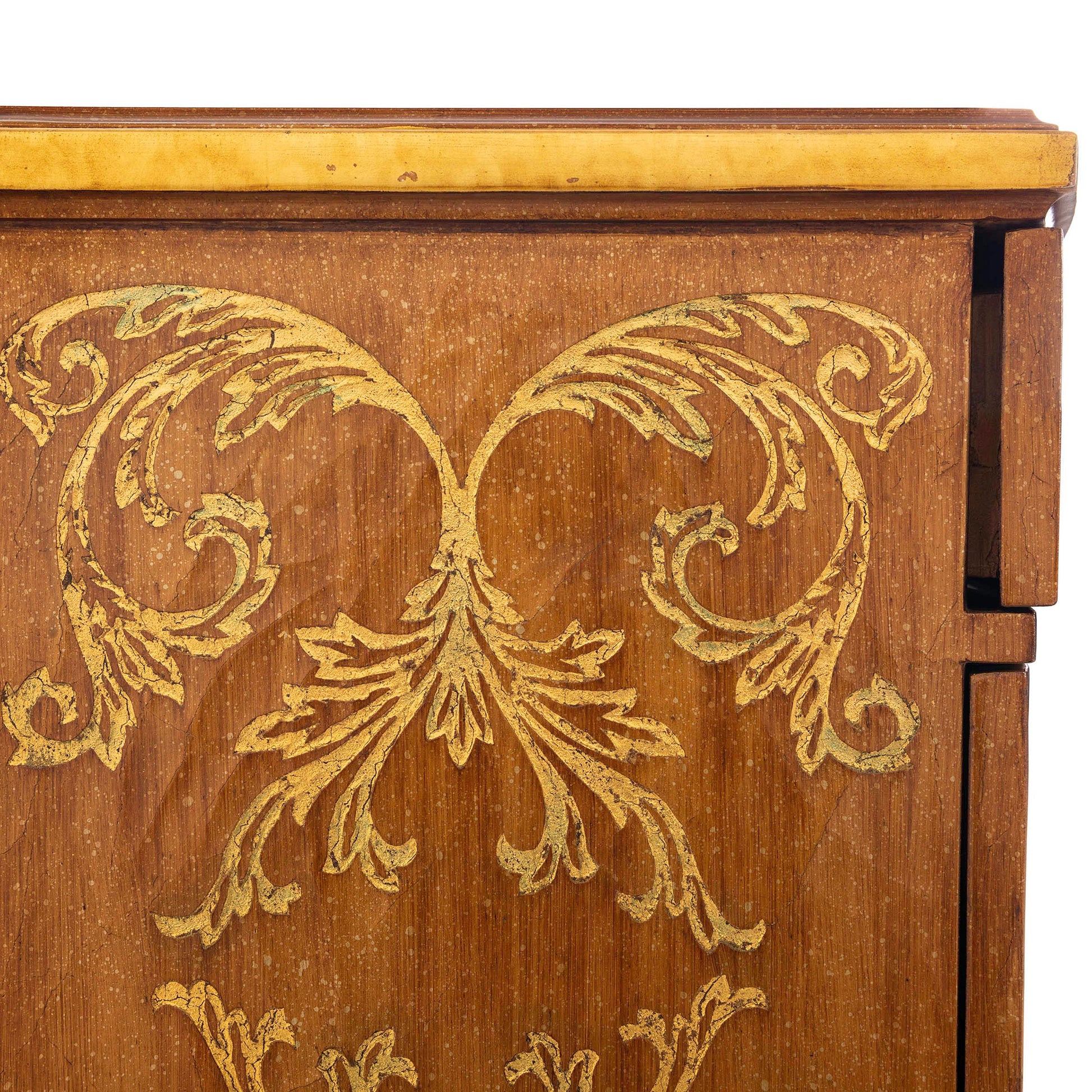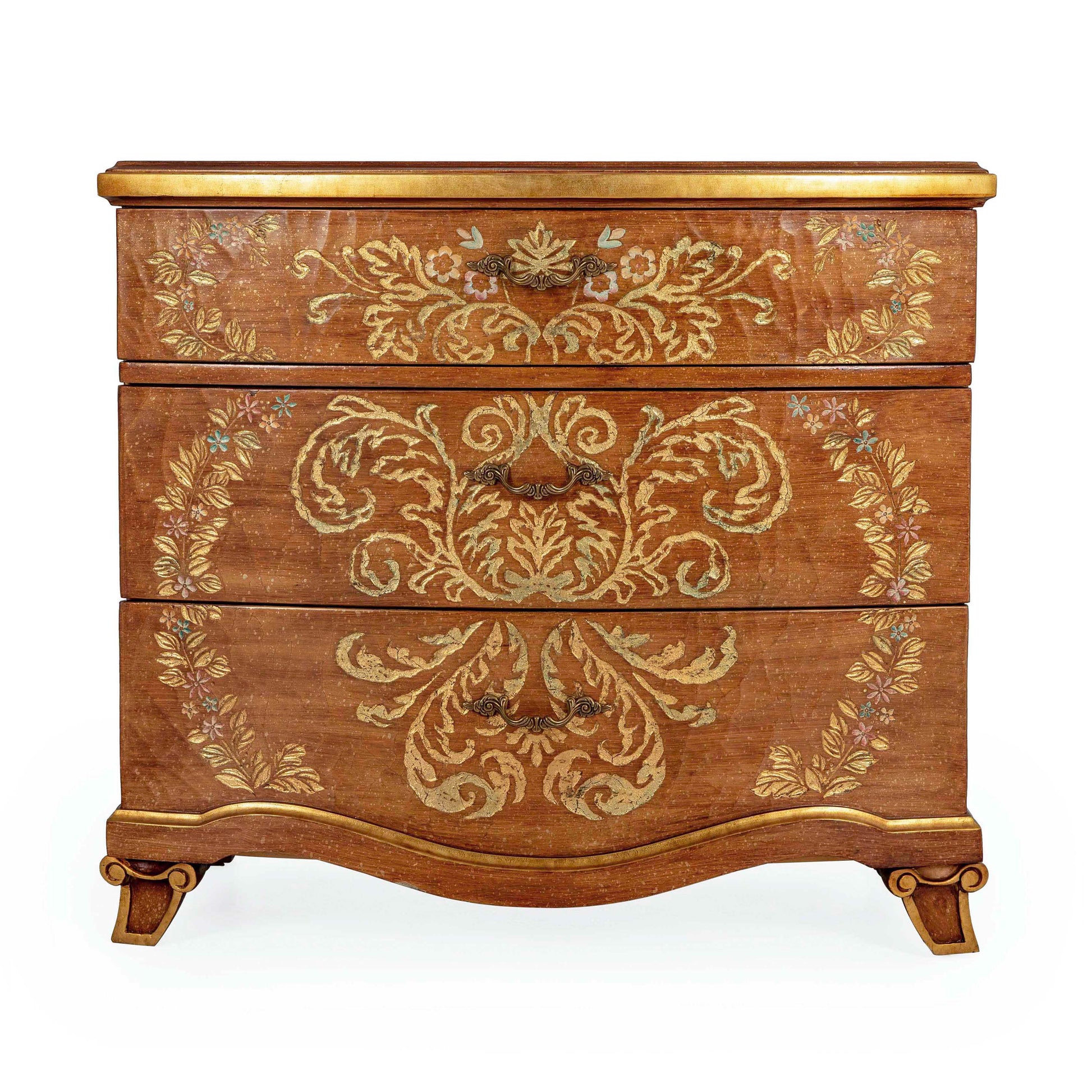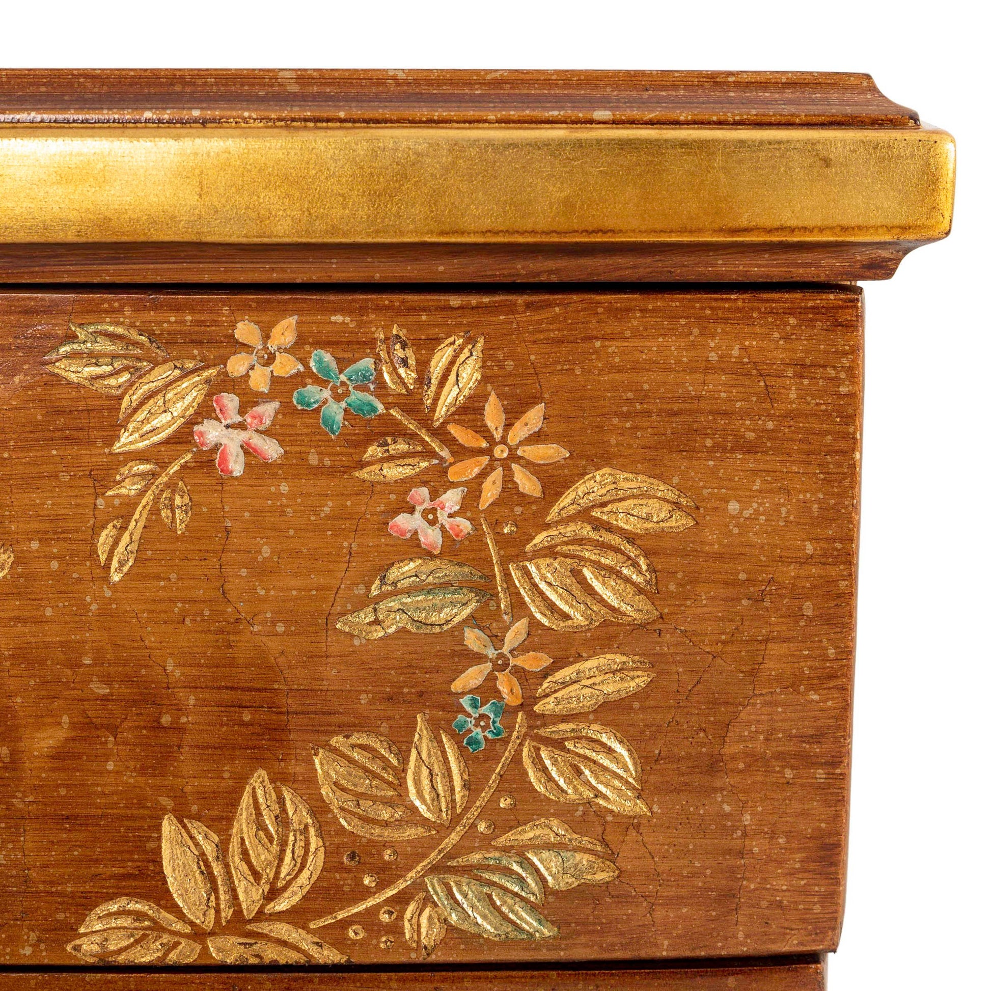 مرآة مميزة بتصميم كلاسيكي أنيق، تعكس براعة فائقة وجمالاً فنياً راقياً. تتميز بإطار خشبي منحوت يدوياً بتفاصيل انسيابية منحنية تضفي عليها طابعاً أنيقاً، مطلية بلون بني عتيق ومزينة برسومات زهور إبرة الراعي وزخارف بألوان زاهية تضفي عليها حيوية استثنائية. هذه المرآة جزء من طقم غرفة نوم متكامل يشمل لوحاً أمامياً أنيقاً للسرير، وطاولتين جانبيتين، وطاولة تزيين مع كرسي.