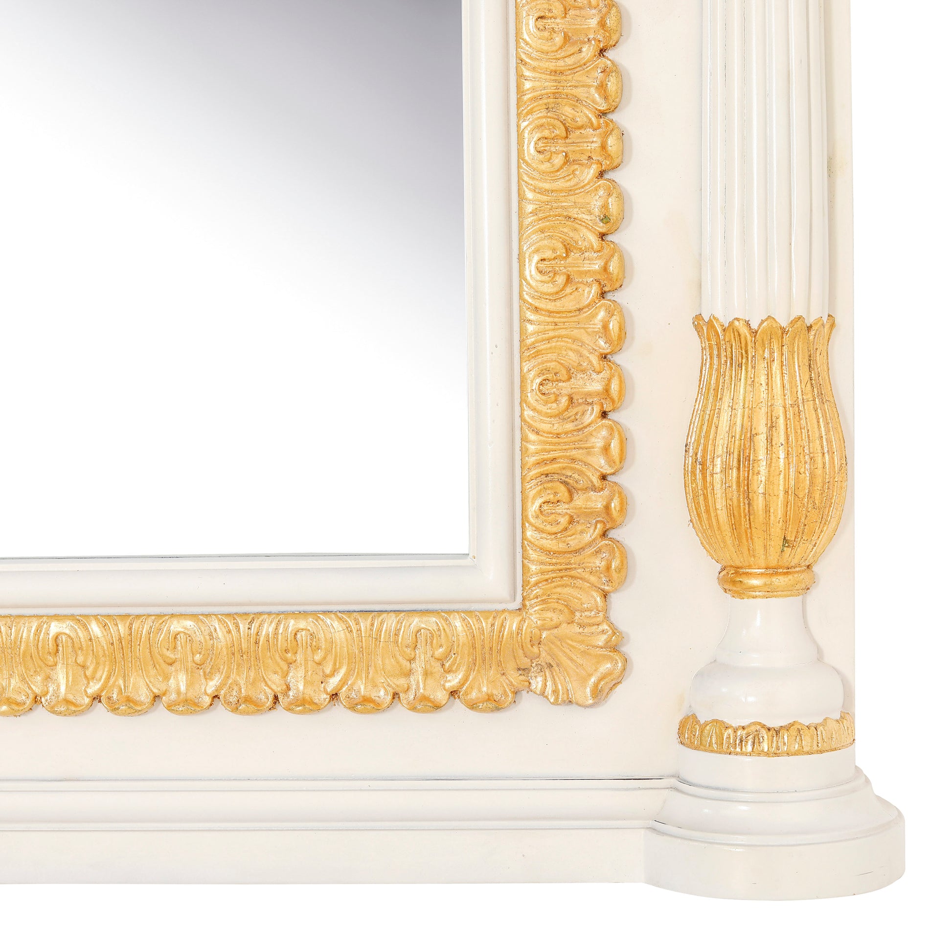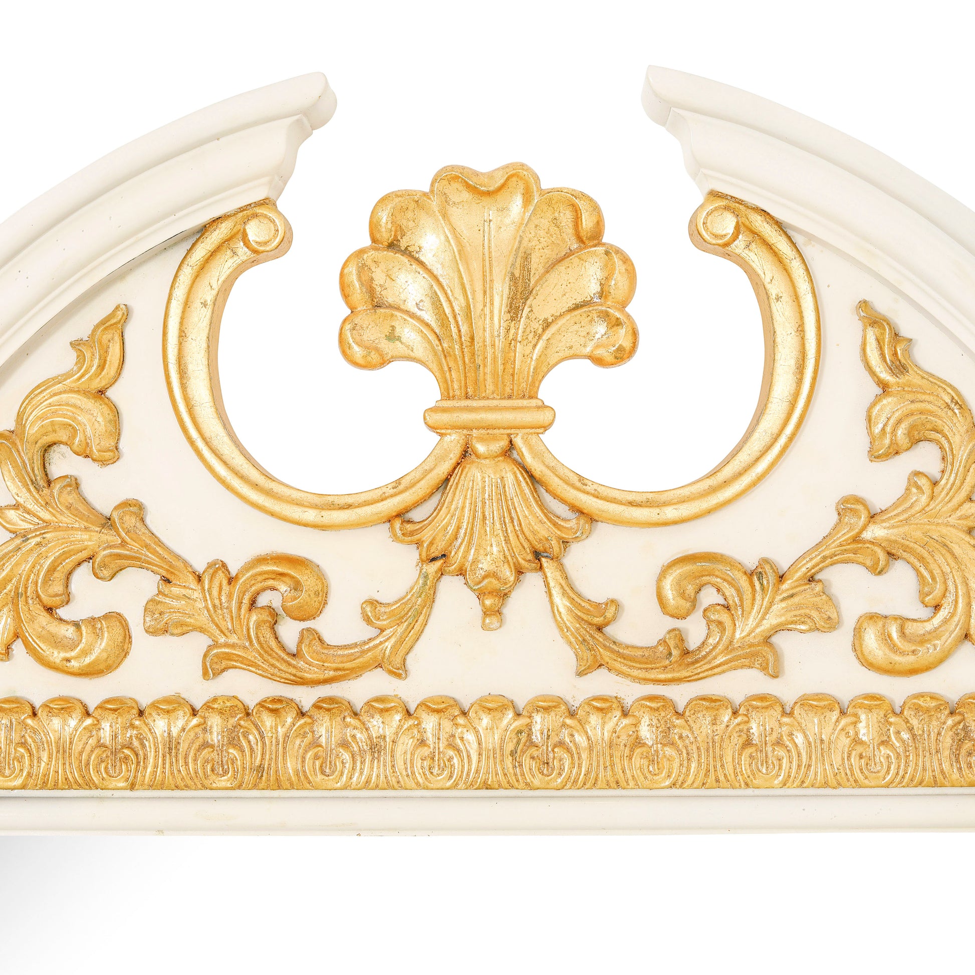 مرآة فاخرة بتصميم كلاسيكي أنيق، تتميز بإطار خشبي منحوت يدويًا باللون الأبيض العتيق مع لمسات ذهبية على النقوش تضفي عليها طابعًا ملكيًا. يعلوها تاج مزخرف يعزز فخامة التصميم. كما تم دمج زجاج مرآة مشطوف الحواف لإضافة عمق ولمسة إضافية من الرقي. تُعد هذه المرآة قطعة متناسقة ضمن طقم كامل مع طاولة كونسول فاخرة، مما يجعلها إضافة مثالية للمداخل الراقية أو المساحات الكلاسيكية الفاخرة.