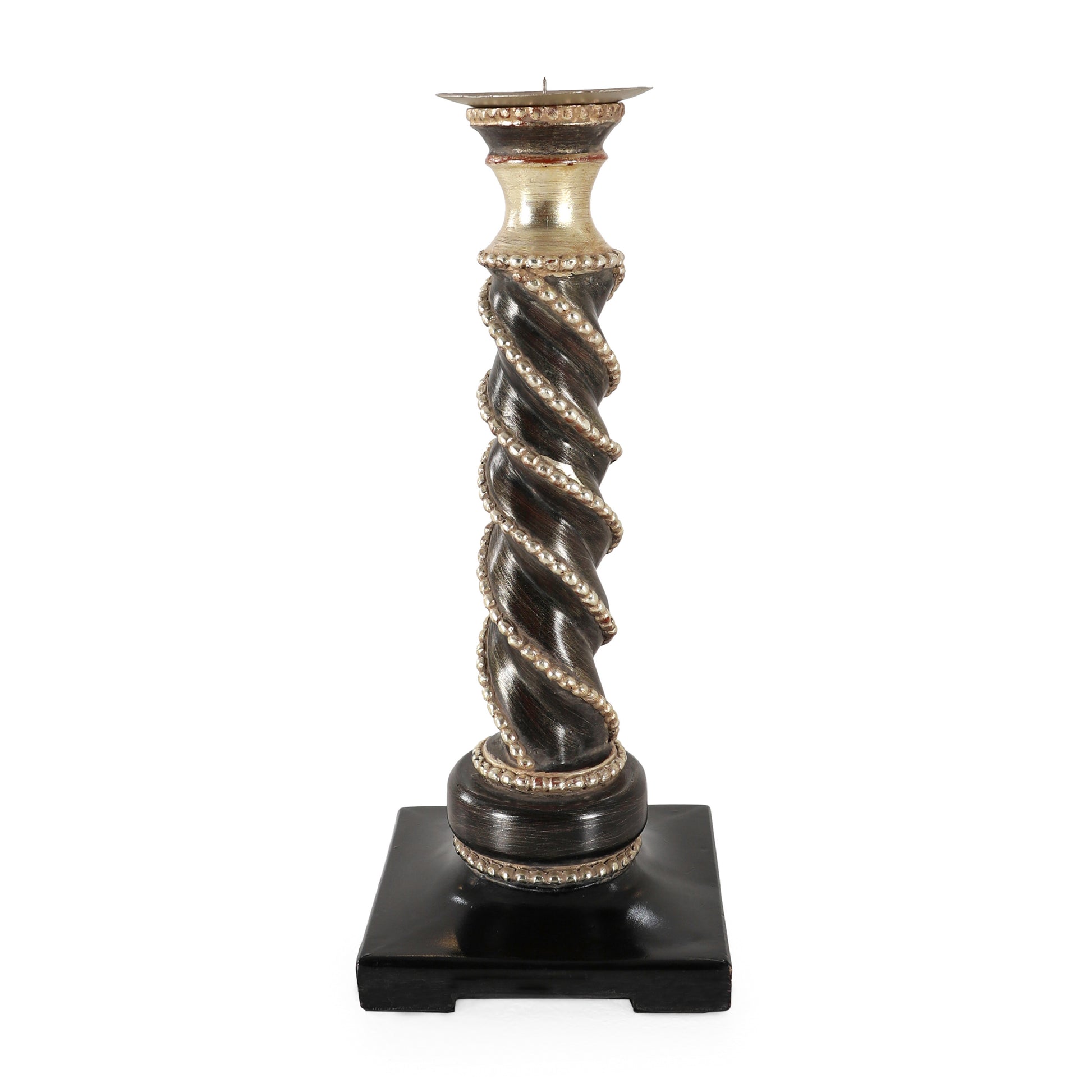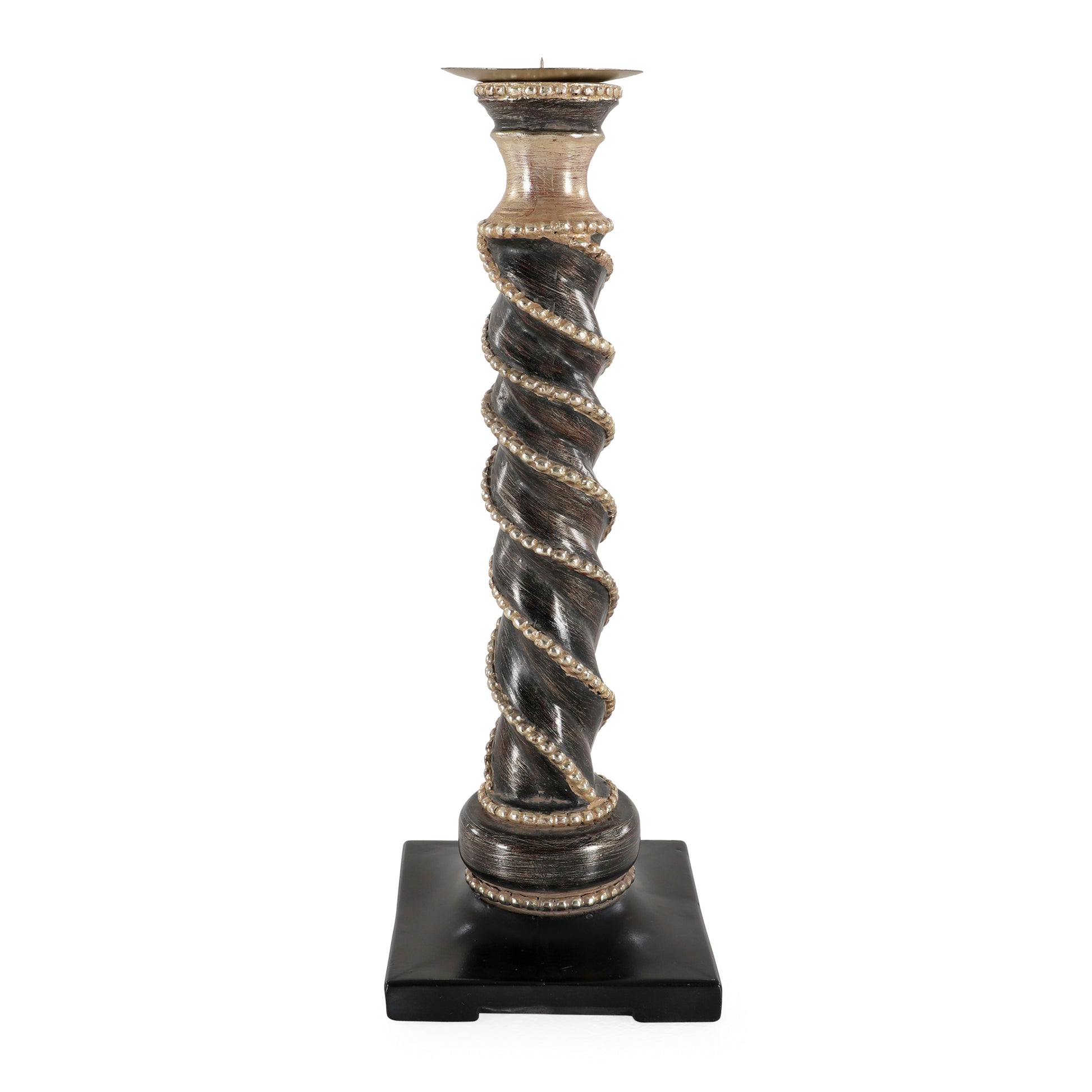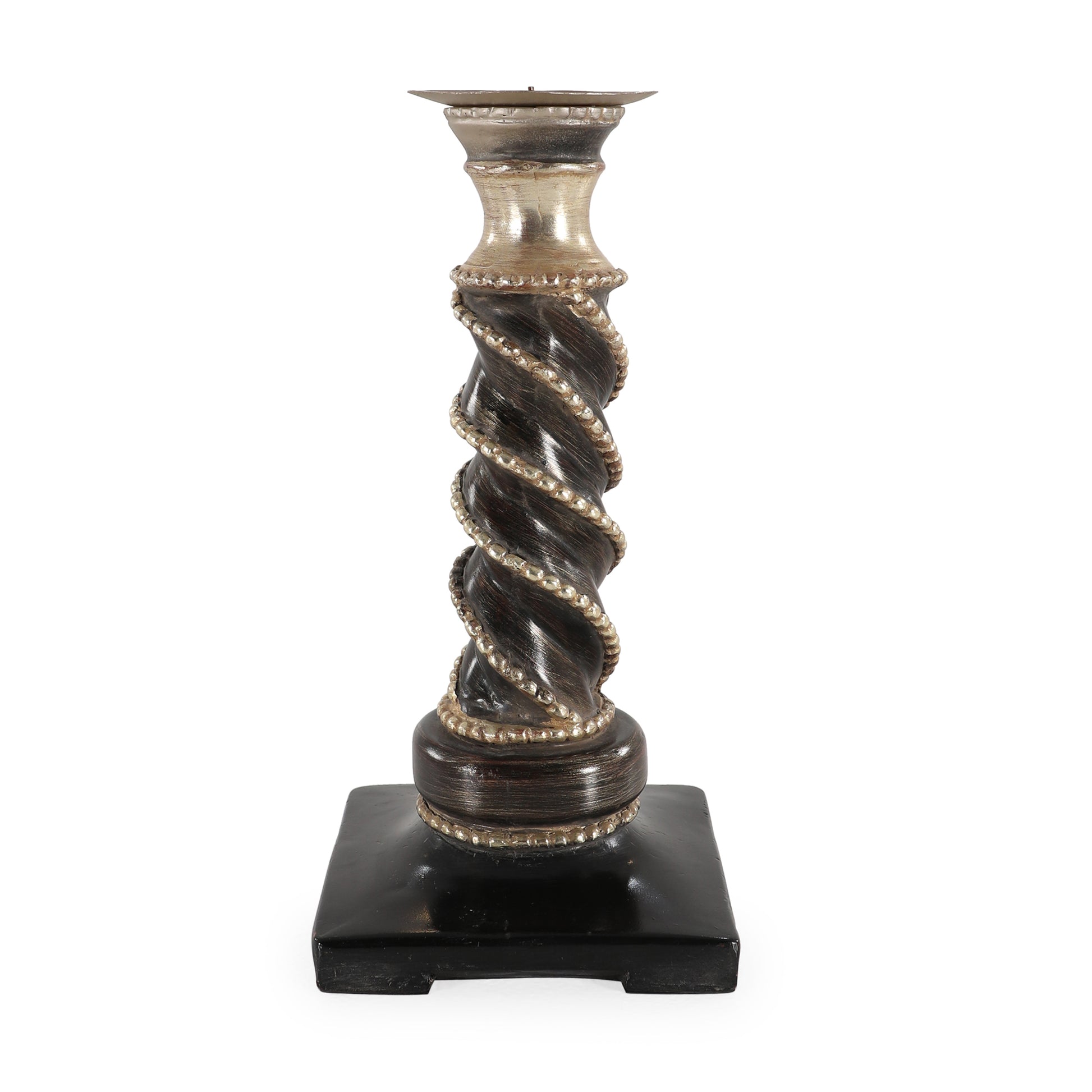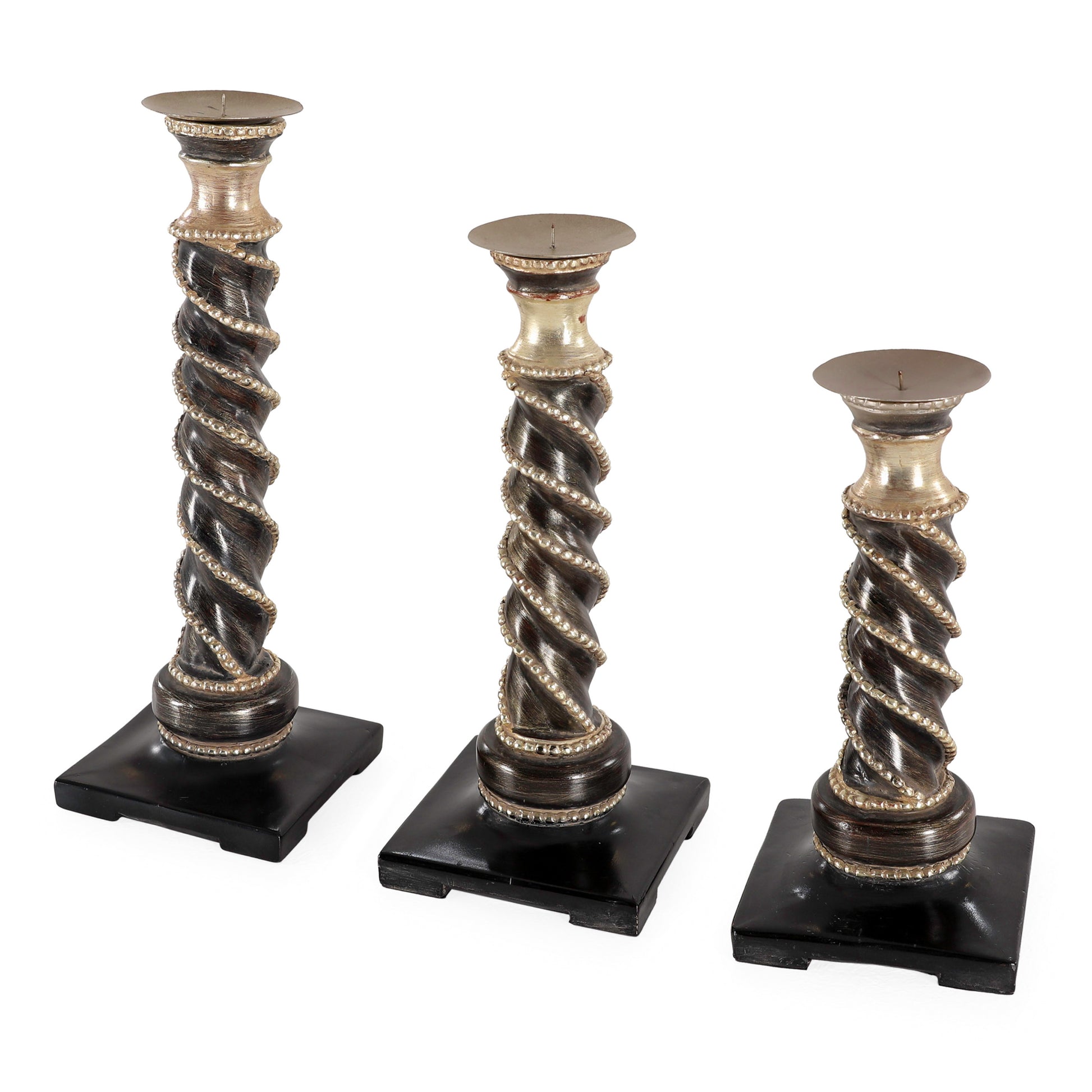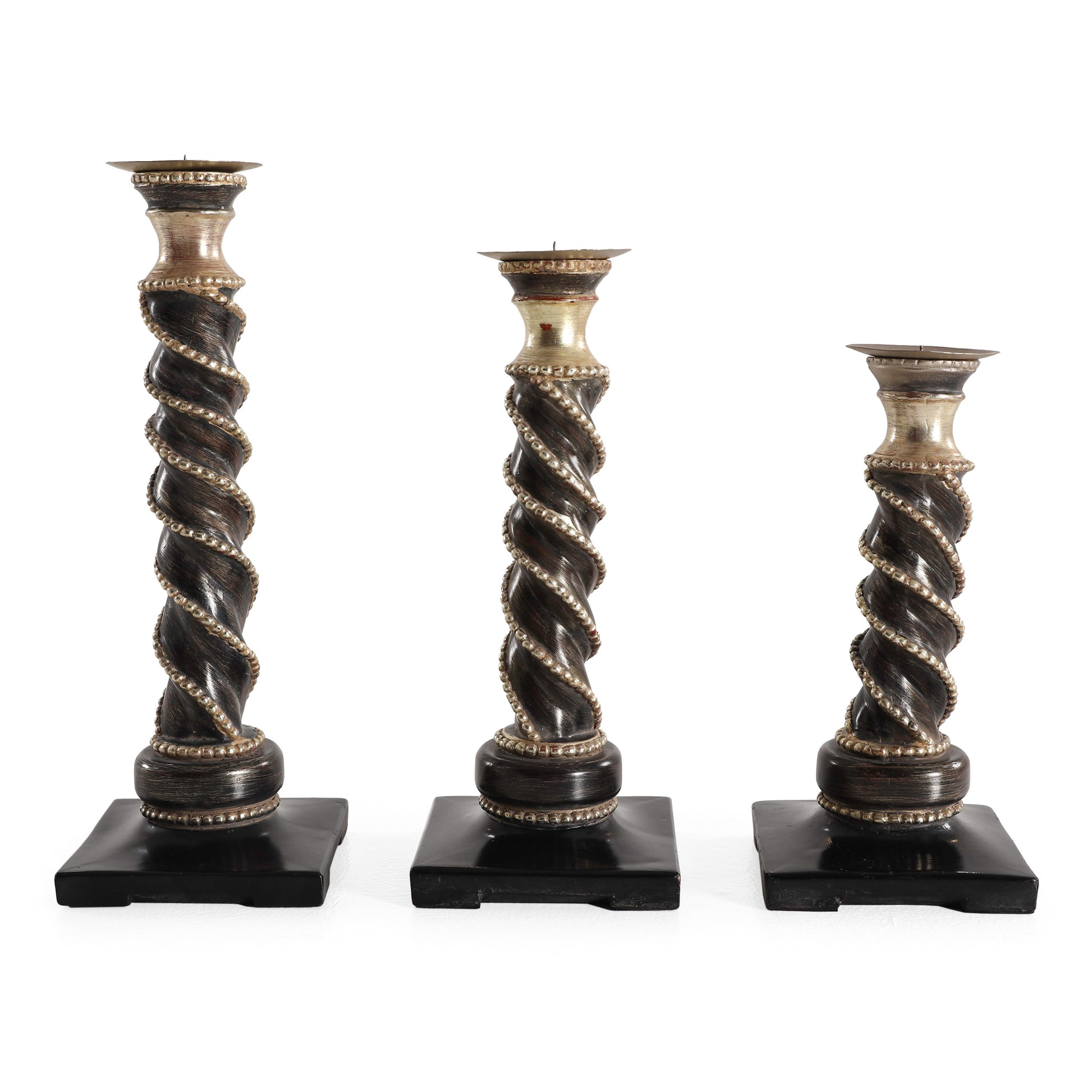 طقم فاخر من ثلاث شمعدانات بأحجام متدرجة. يتميز كل شمعدان بتصميم عمودي ملتوي يضفي عليه مظهرًا أنيقًا وفريدًا. مصنوع من مزيج راقٍ من الخشب والنحاس والراتنج، بطلاء بني عتيق ولمسات ذهبية، يعكس الطقم طابعًا كلاسيكيًا راقيًا. كل قطعة مزينة بحبل خرزي ملفوف لمزيد من التفاصيل الفنية، وترتكز على قاعدة مربعة متينة تمنحها الثبات والفخامة. يُعد هذا الطقم إضافة مثالية لإبراز جمال الزوايا، وطاولات العرض، والمساحات الكلاسيكية الراقية.