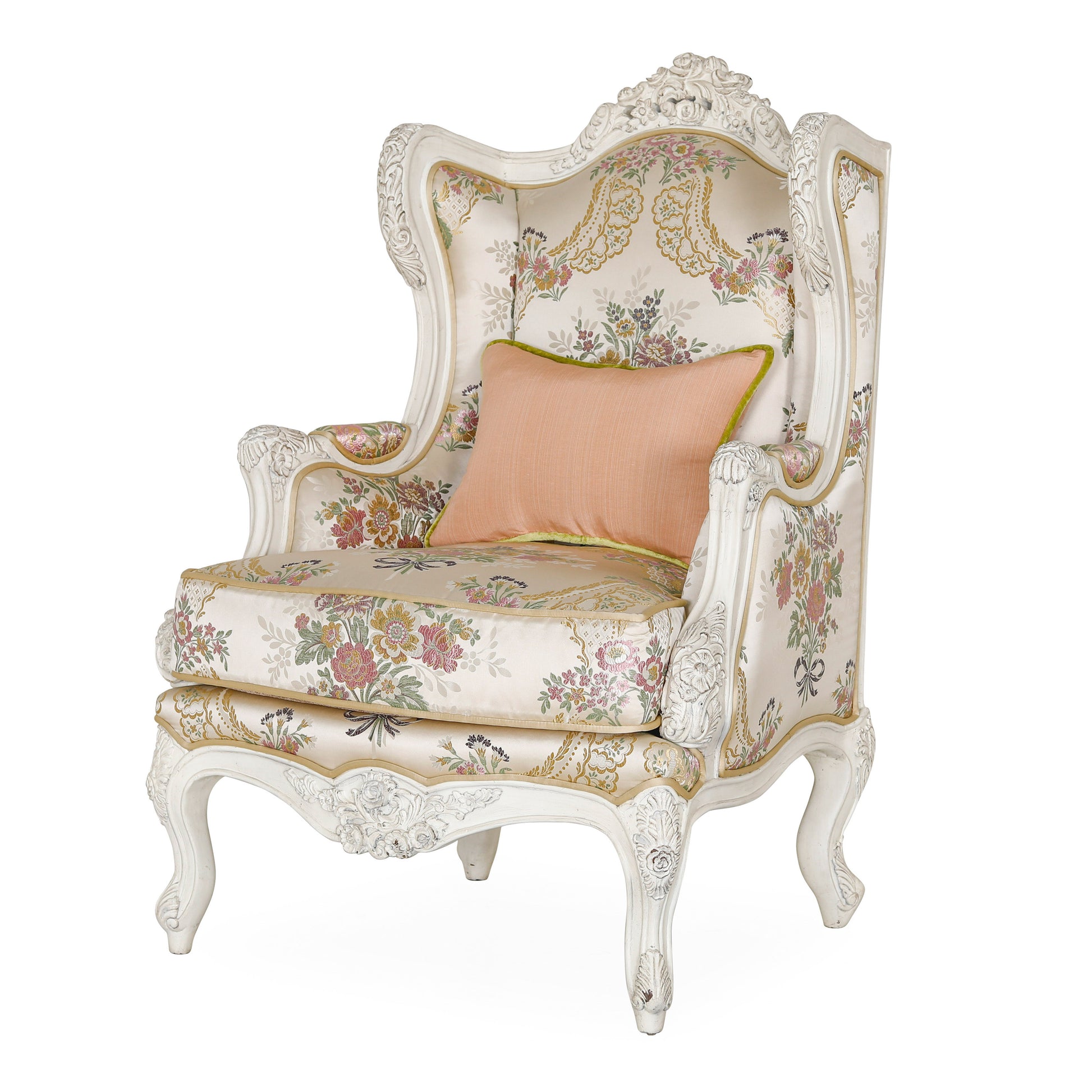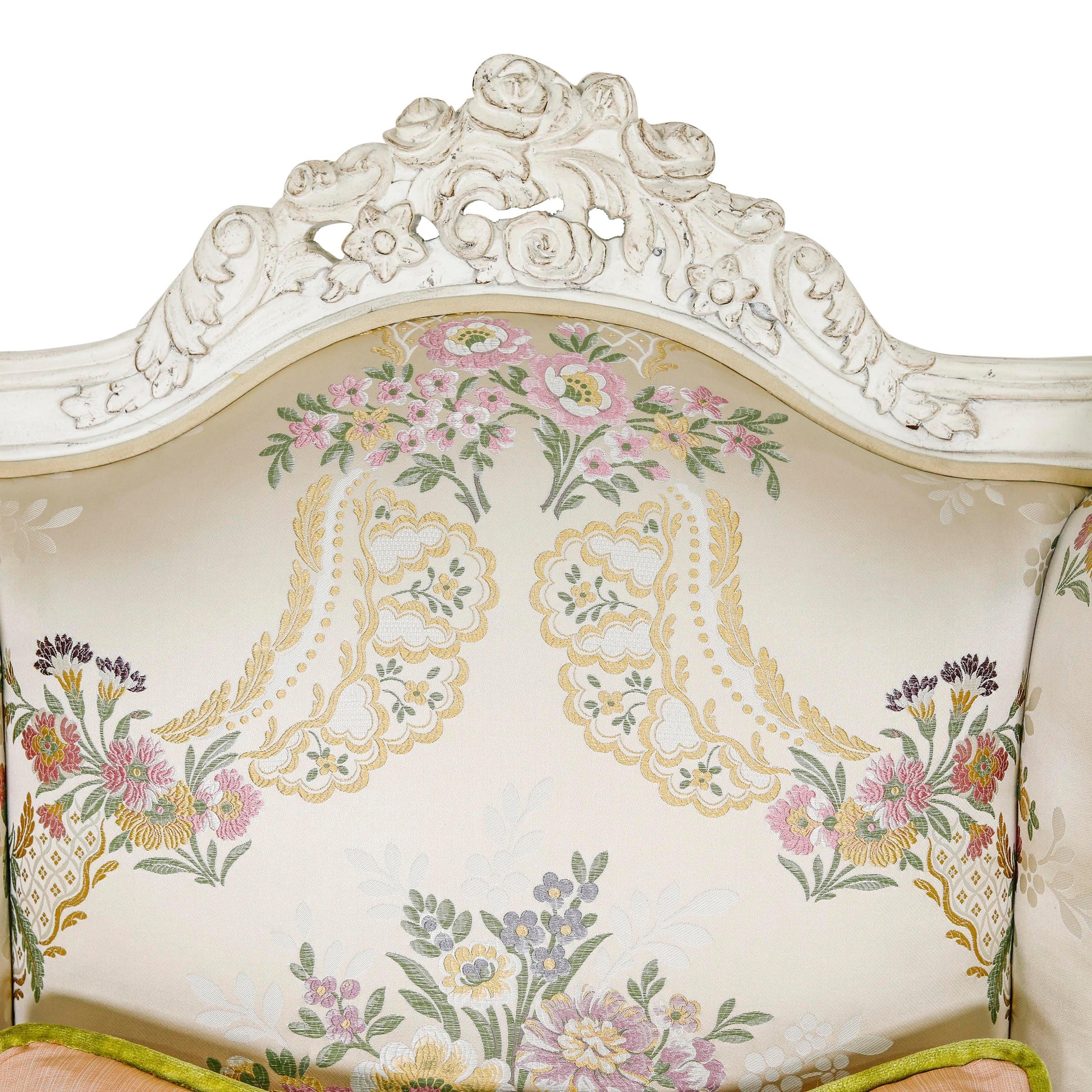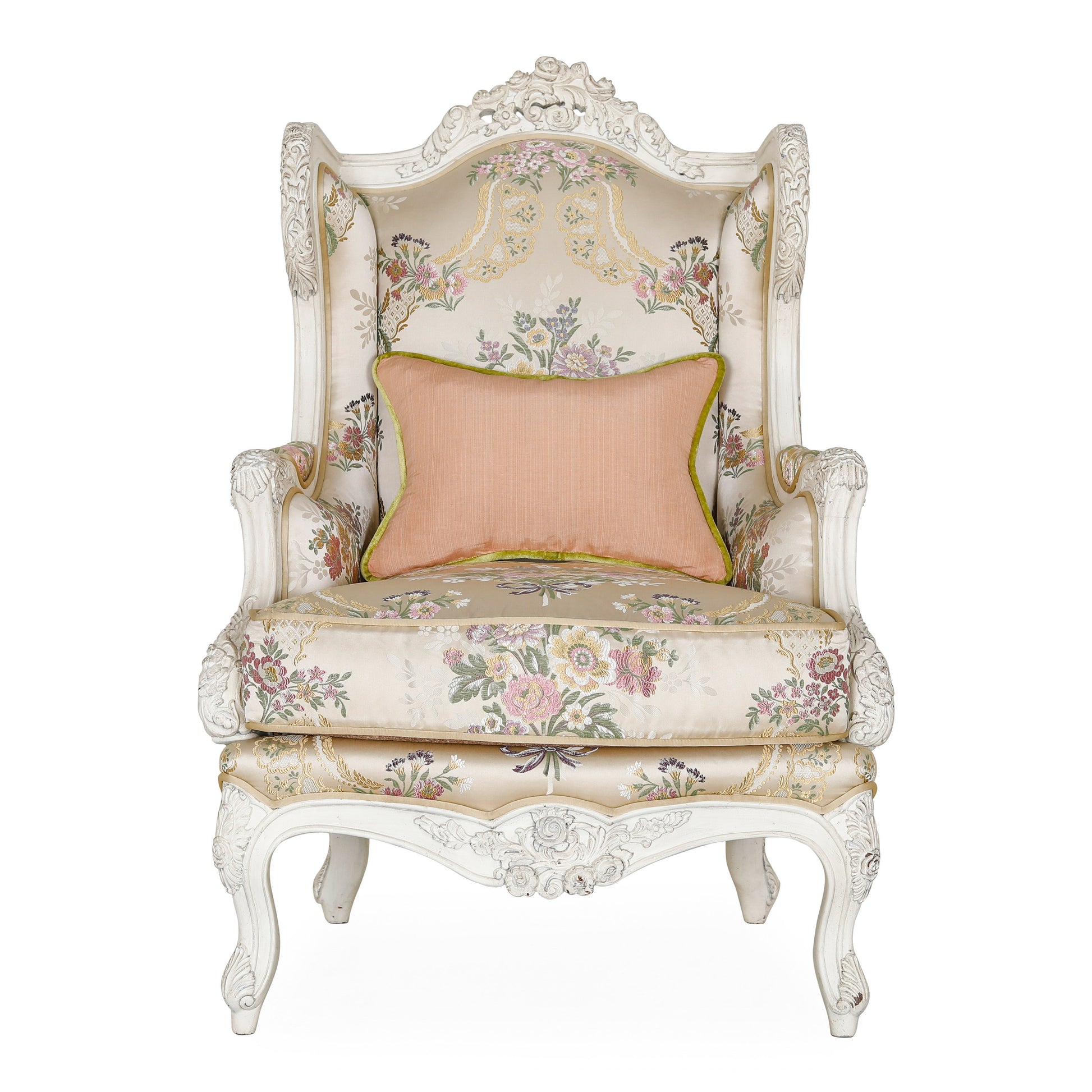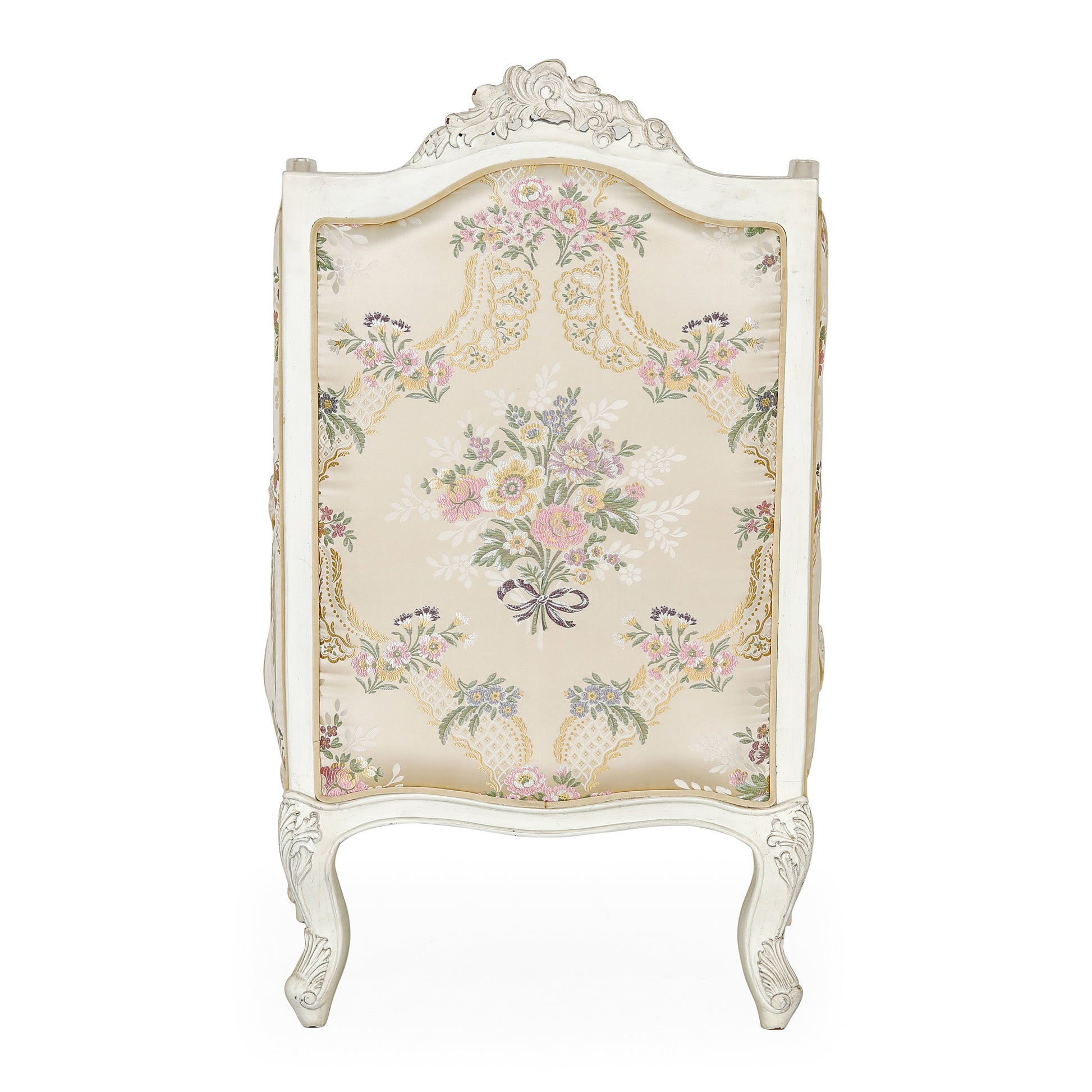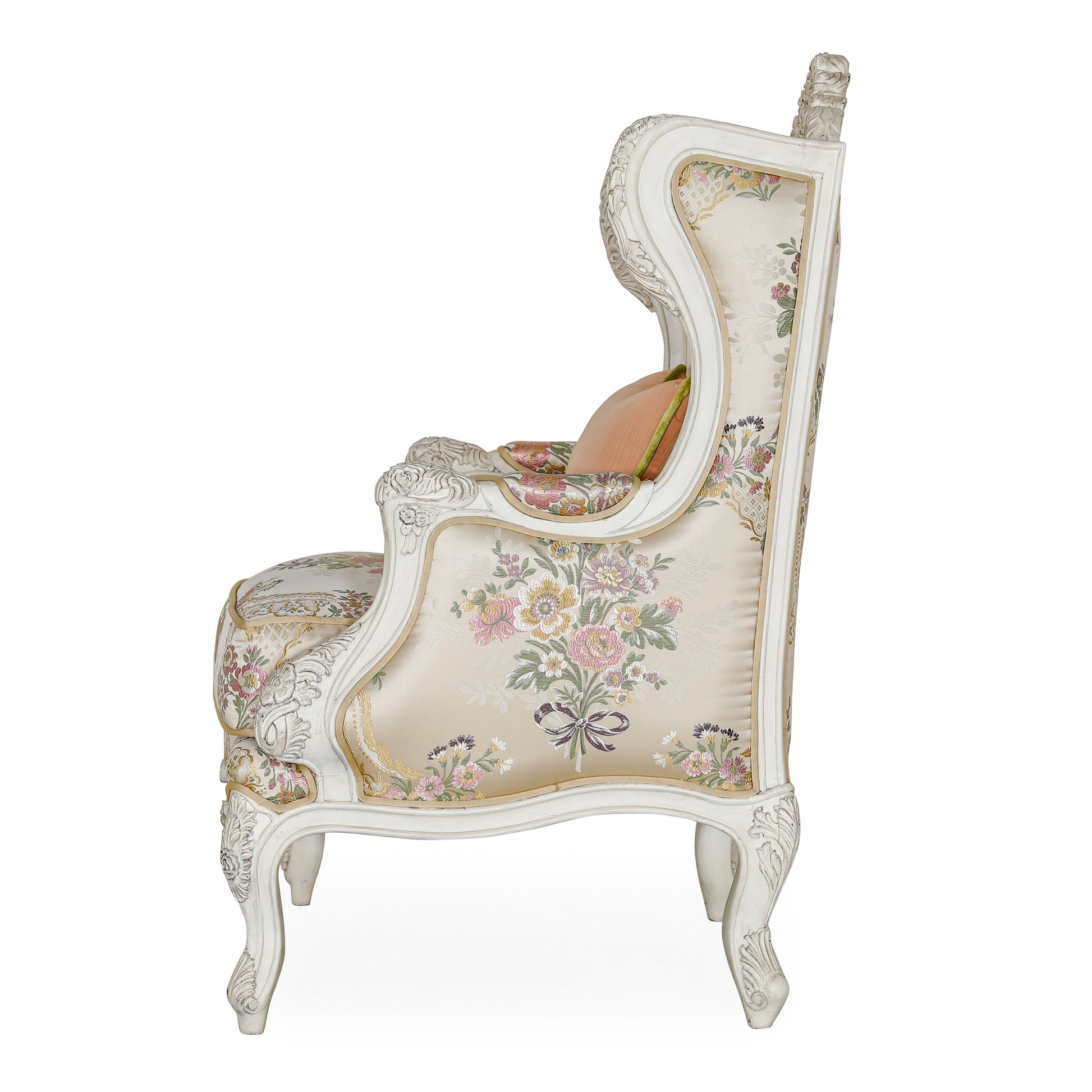 كرسي فاخر بتصميم كلاسيكي يعكس الأناقة الملكية والذوق الرفيع. يتميز بإطار متين من خشب الماهوجني بلون أبيض عاجي، وحوافه مزينة بنقوش يدوية دقيقة. مُنجّد بقماش إيطالي فاخر منسوج بنقوش زهرية بألوان زاهية، مما يضفي لمسة فنية ونعومة فائقة. يتضمن وسادة لمزيد من الراحة، بينما توفر الأرجل المنحنية والمساند الأنيقة توازناً مثالياً بين الفخامة والراحة. هذا الكرسي قطعة مميزة تضفي على الغرفة مظهراً فريداً، وهو مثالي لعشاق القطع الكلاسيكية والفنية.