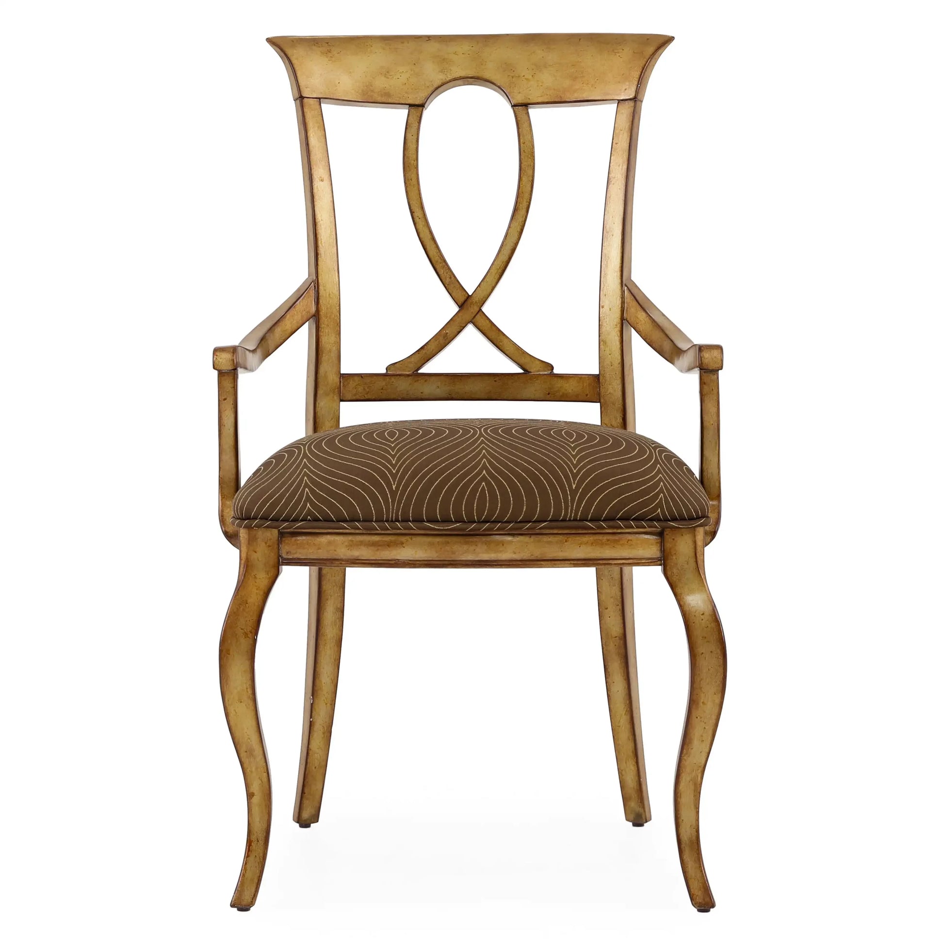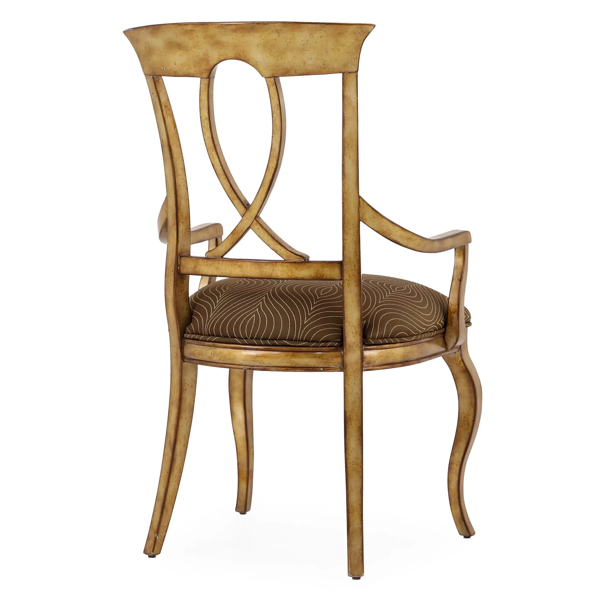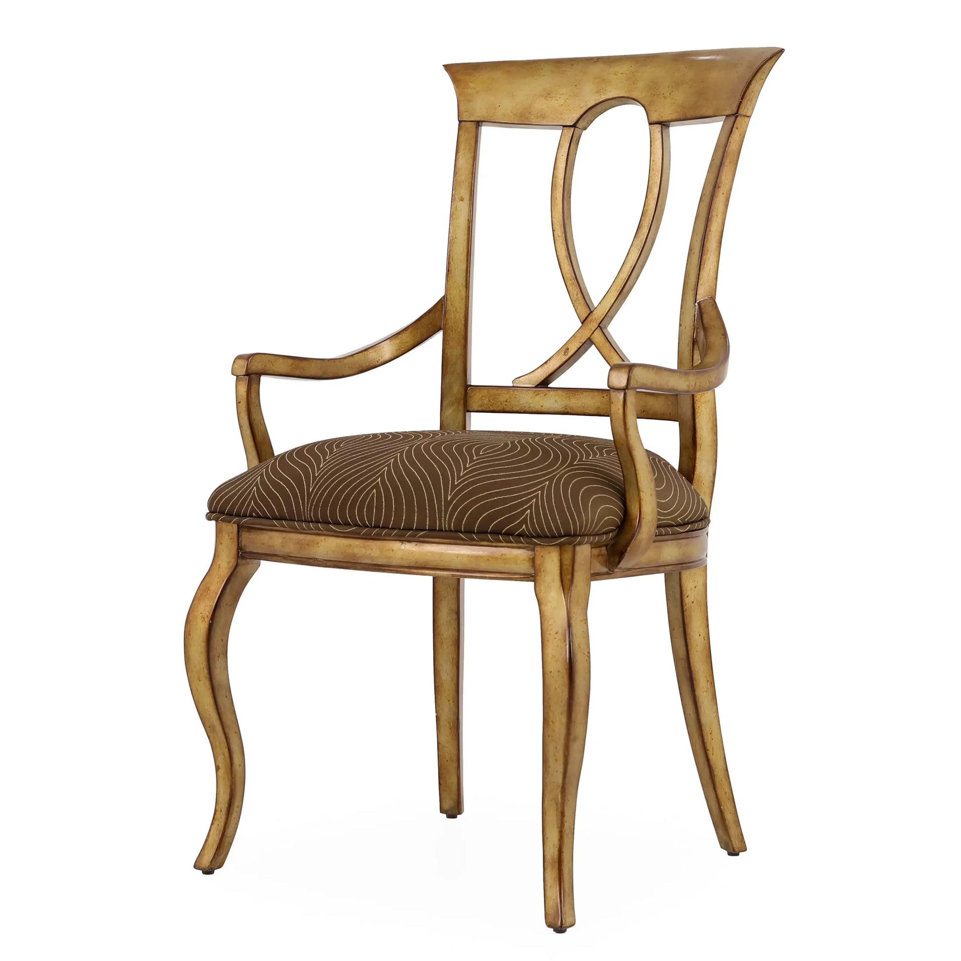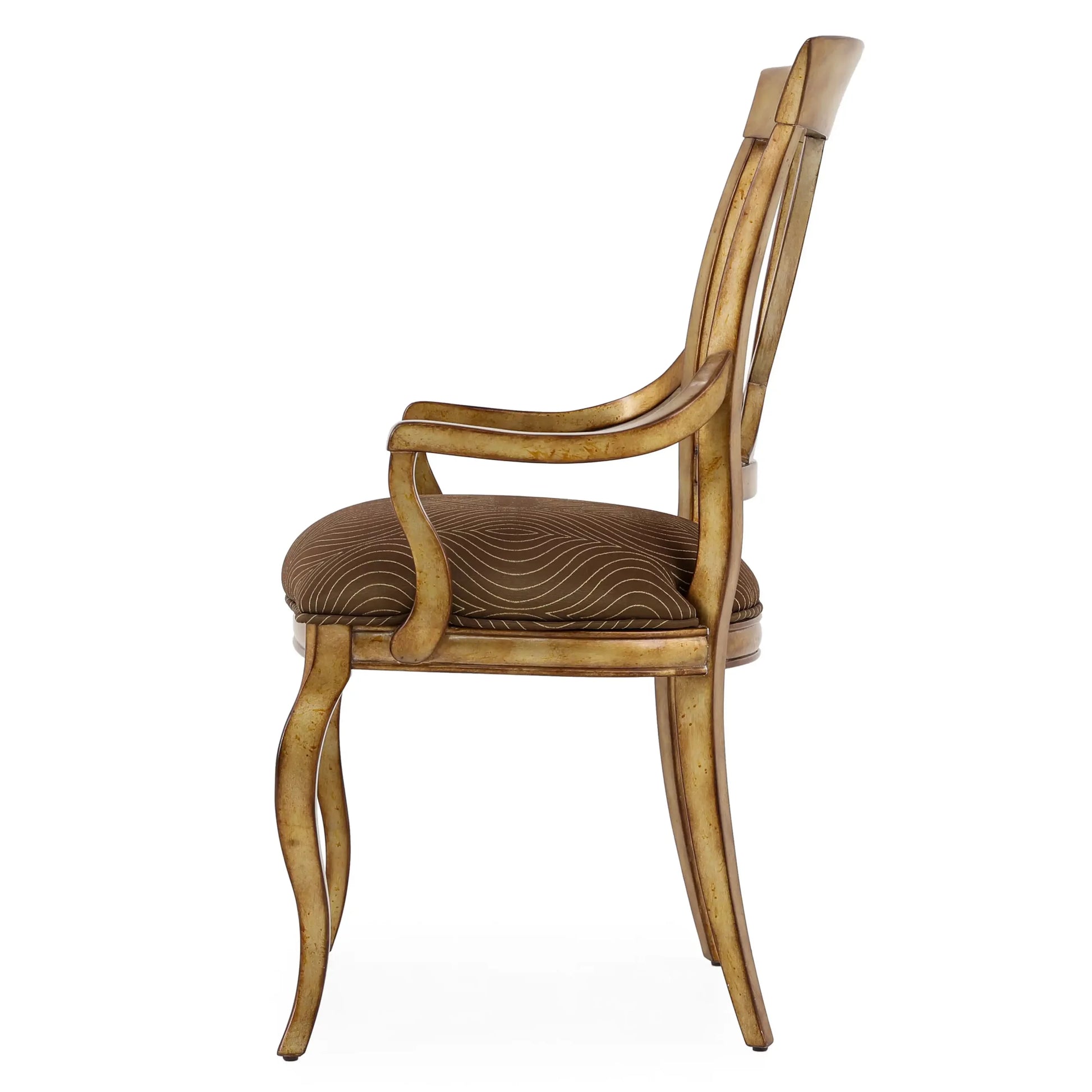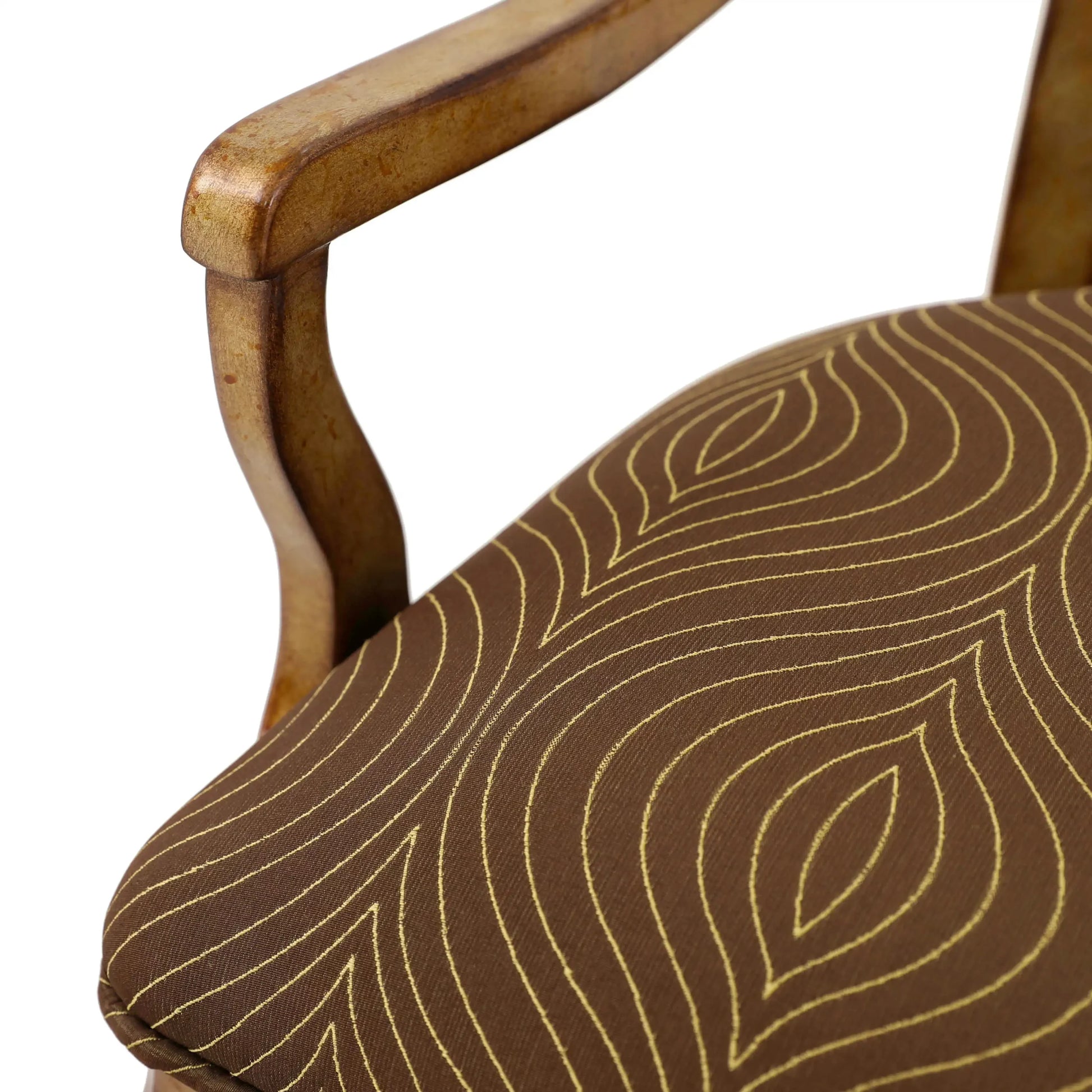 كرسي بذراعين لتناول الطعام من بريسيوزا جديد. مصنوعة من خشب الماهوجني. تفاصيل التنجيد: المقعد منجد بأقمشة منسوجة. يقف على أربعة أرجل صلبة، كرسي باللون الفضي العتيق.