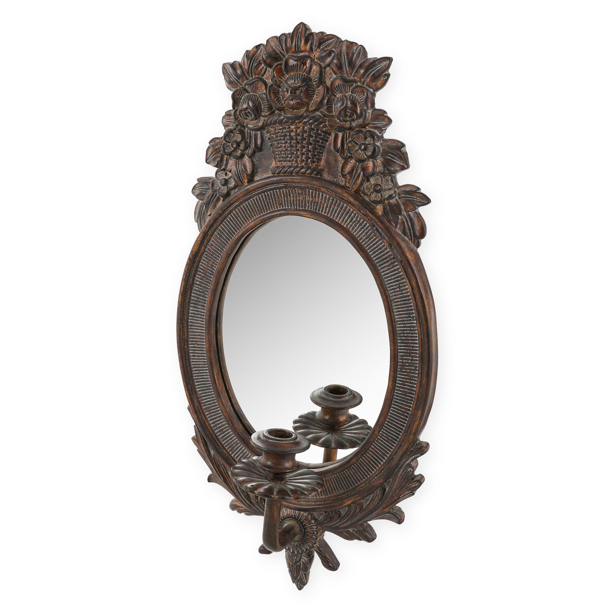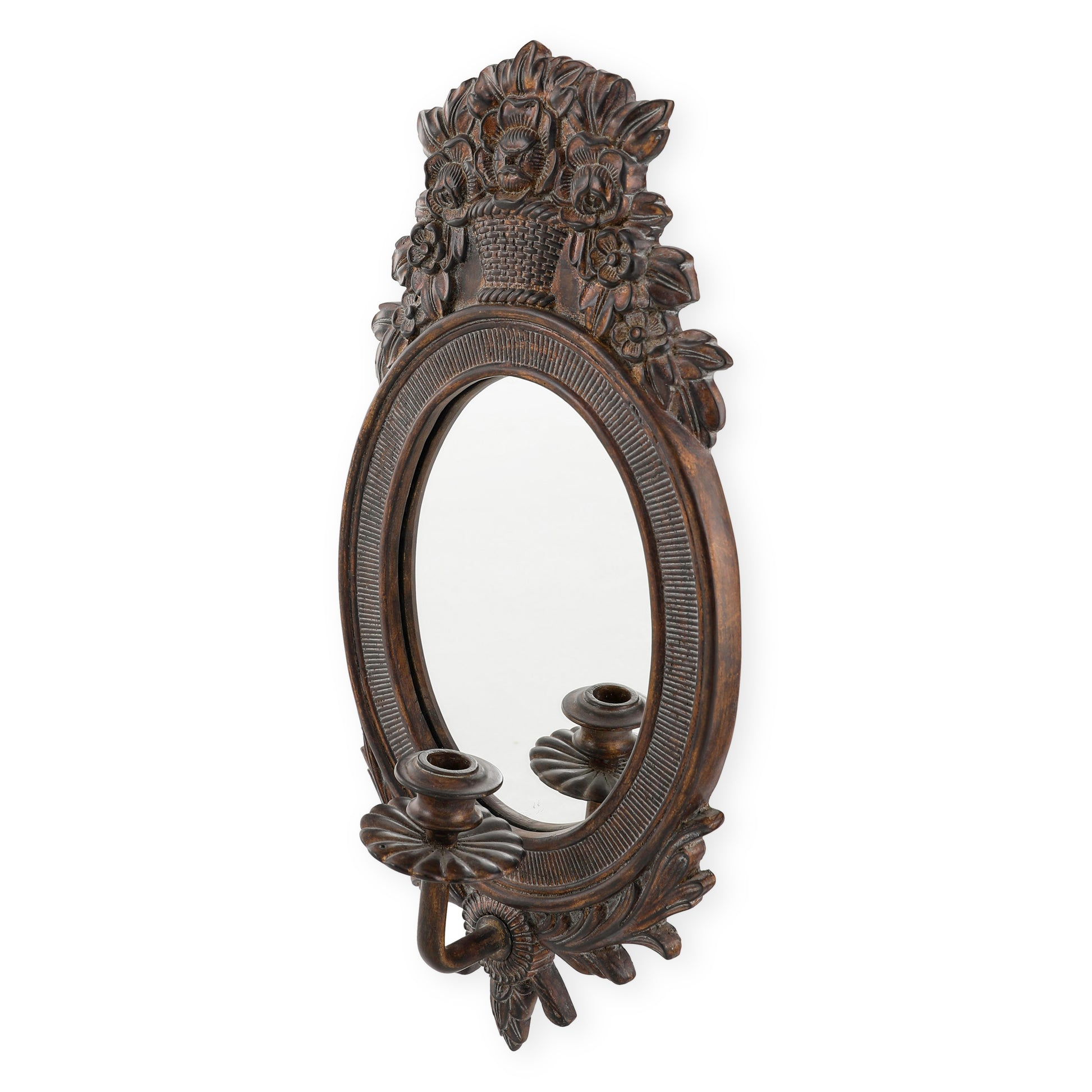 مرآة بيضاوية أنيقة بتفاصيل جمالية خلابة، تتميز بإطار من مادة البولي ريزين منحوت بمزيج من اللون البني والذهبي العتيق لإبراز فخامة التصميم. تتكامل المرآة مع حامل شموع يضفي عليها جمالاً ووظيفةً في آن واحد. ويتوّجها شكل باقة زهور يمنحها لمسةً من الرقي ولمسة فنية مميزة. تجمع هذه المرآة بين الأناقة والعملية، مما يجعلها إضافة مثالية للمساحات الراقية والديكورات الكلاسيكية.