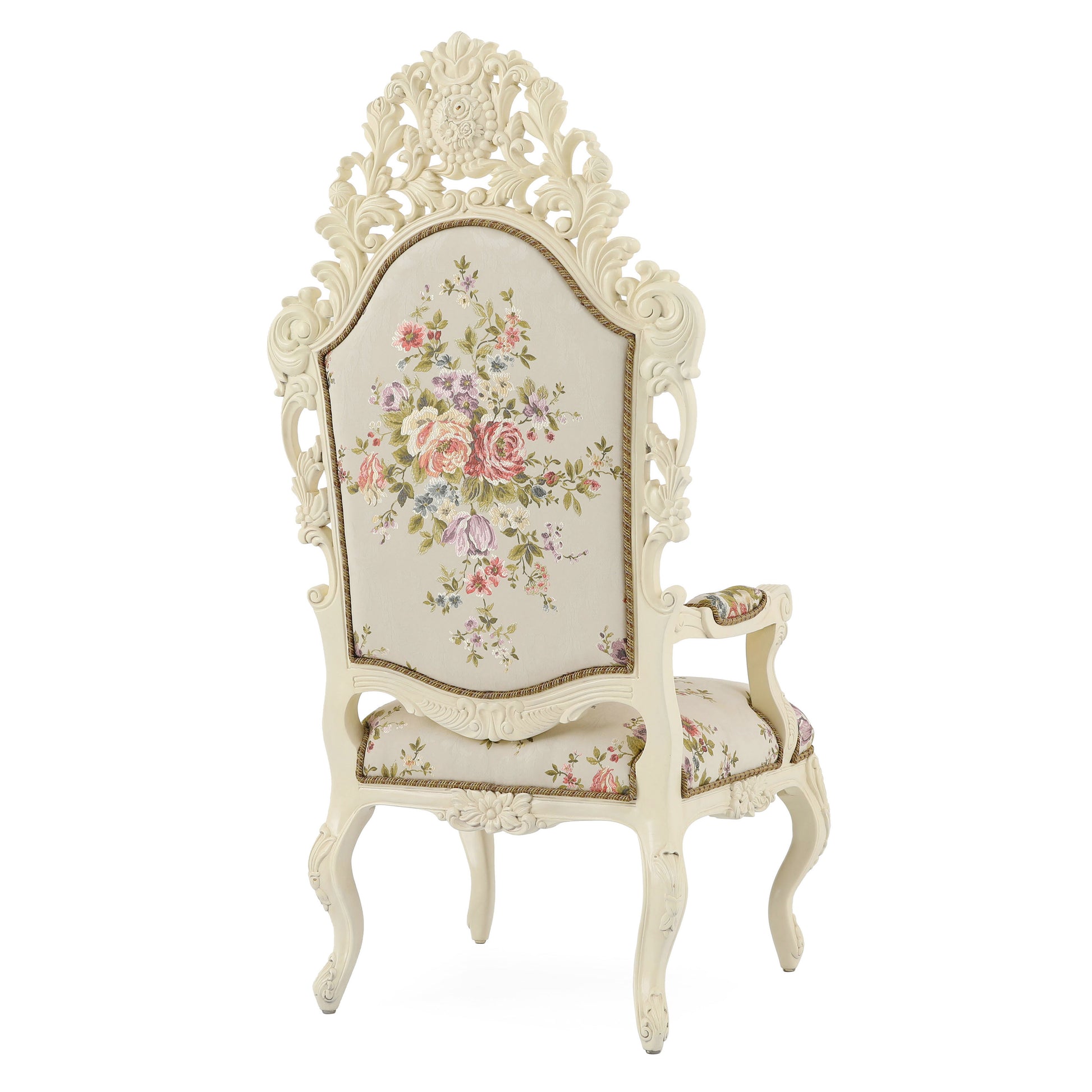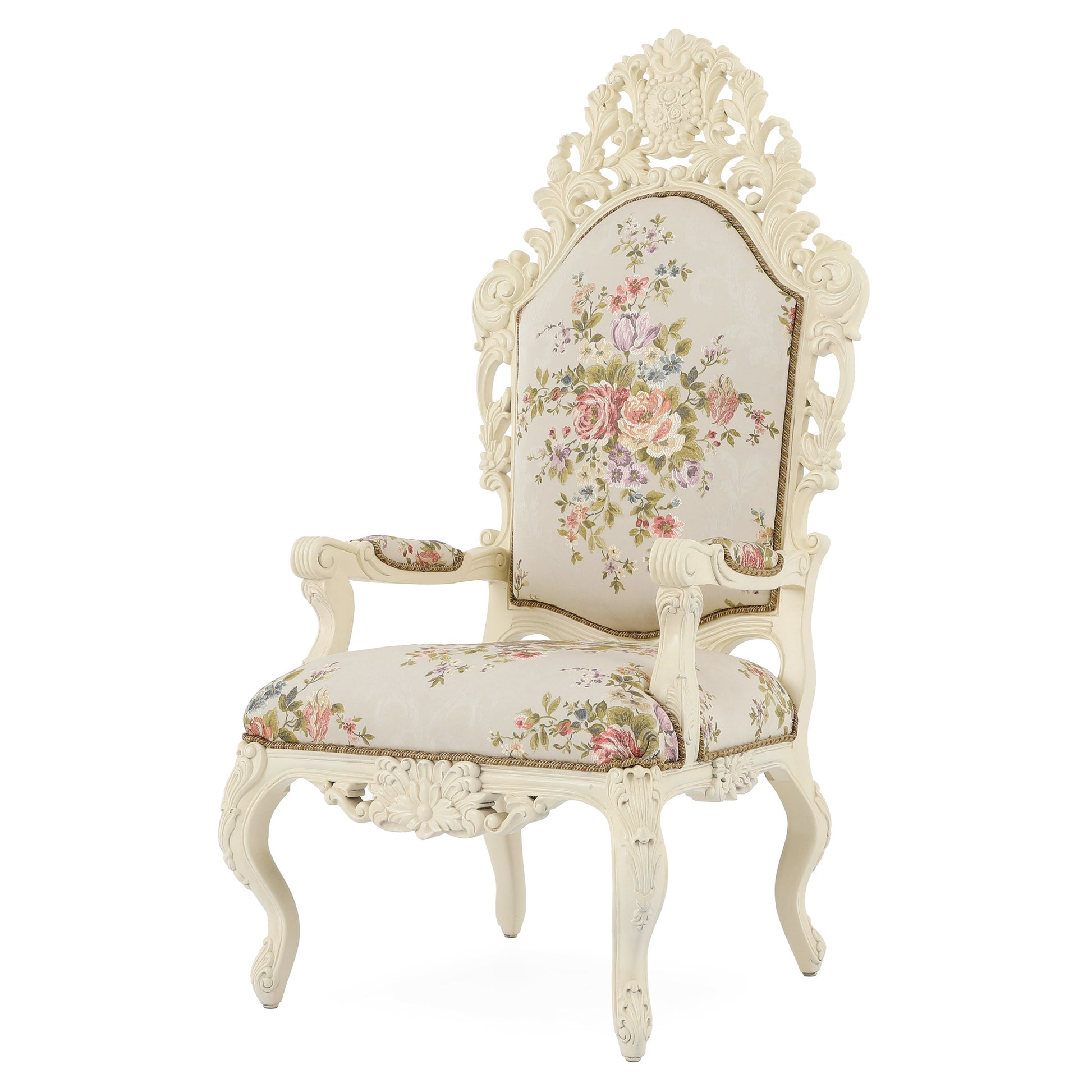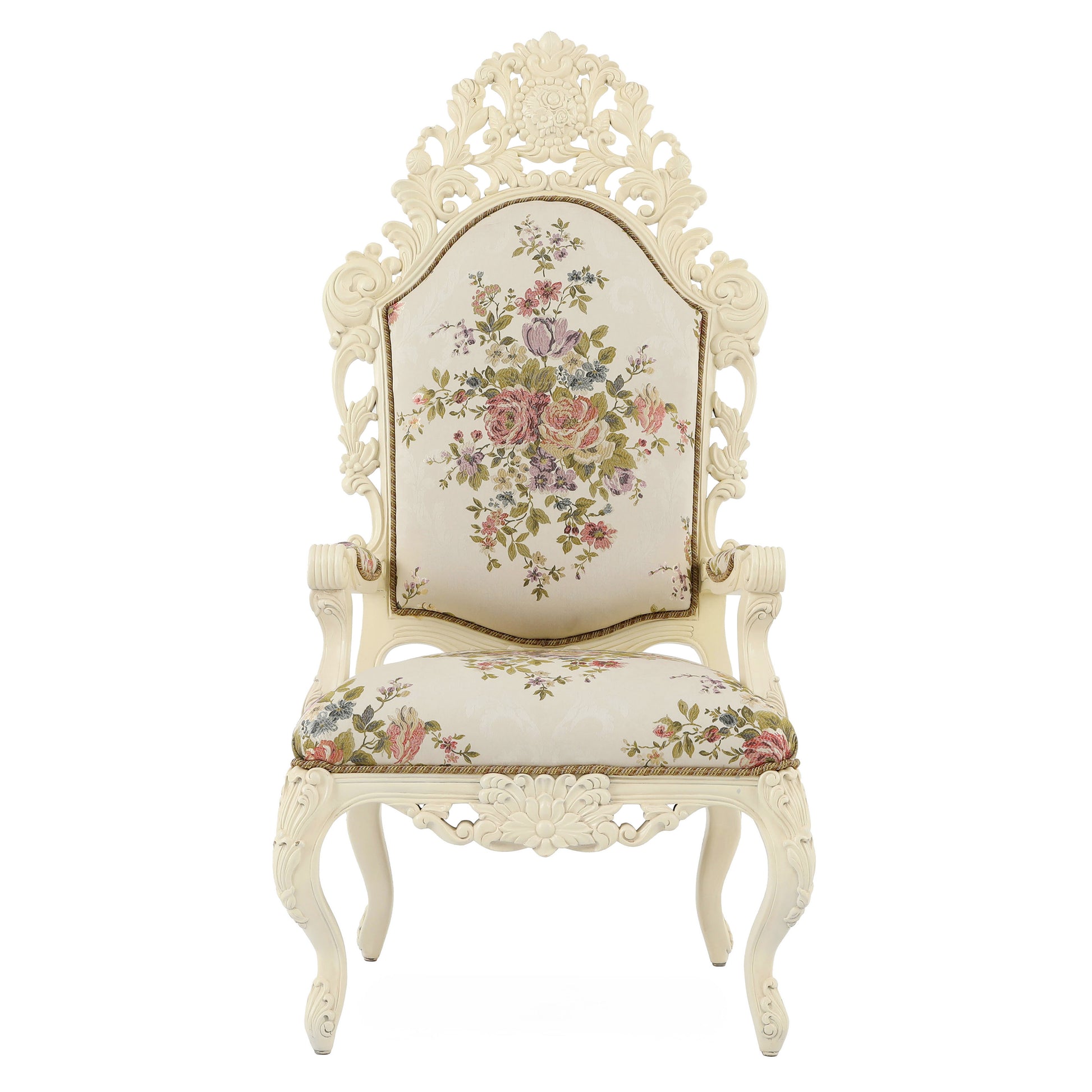 كرسي فاخر بتصميم ملكي يجمع بين الأناقة والجمال الأخاذ، يتميز بظهر عالٍ يُضفي عليه مزيدًا من الجاذبية. صُنع الكرسي من إطار متين من خشب الماهوجني بلون عاجي عتيق مع لمسات ذهبية راقية، مما يمنحه طابعًا فخمًا وعريقًا. يزدان الإطار بنقوش بارزة منحوتة يدويًا. يتميز الكرسي بتنجيد من قماش إيطالي فاخر منسوج بنقوش باقات زهور أنيقة بألوان زاهية، مما يضيف لمسة فنية. تجمع الأرجل المنحنية والمساند الأنيقة بين الراحة والجمال. يُعد هذا الكرسي قطعة مميزة في أي مكان، فهو أكثر من مجرد قطعة أثاث، إنه تحفة فنية ذات قيمة جمالية وحرفية عالية.