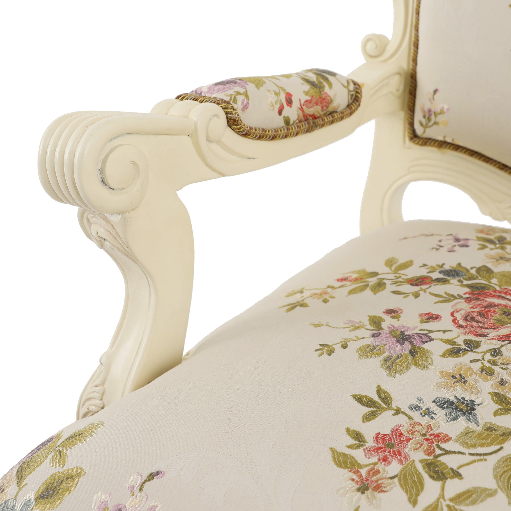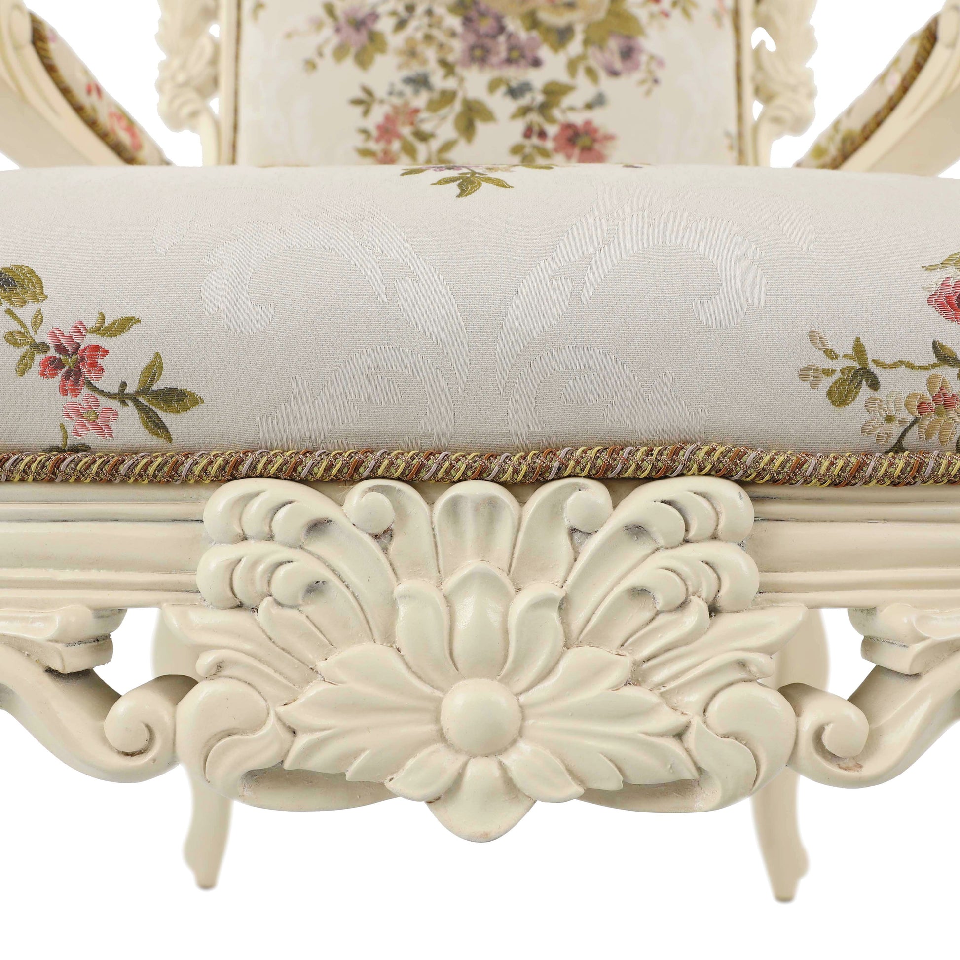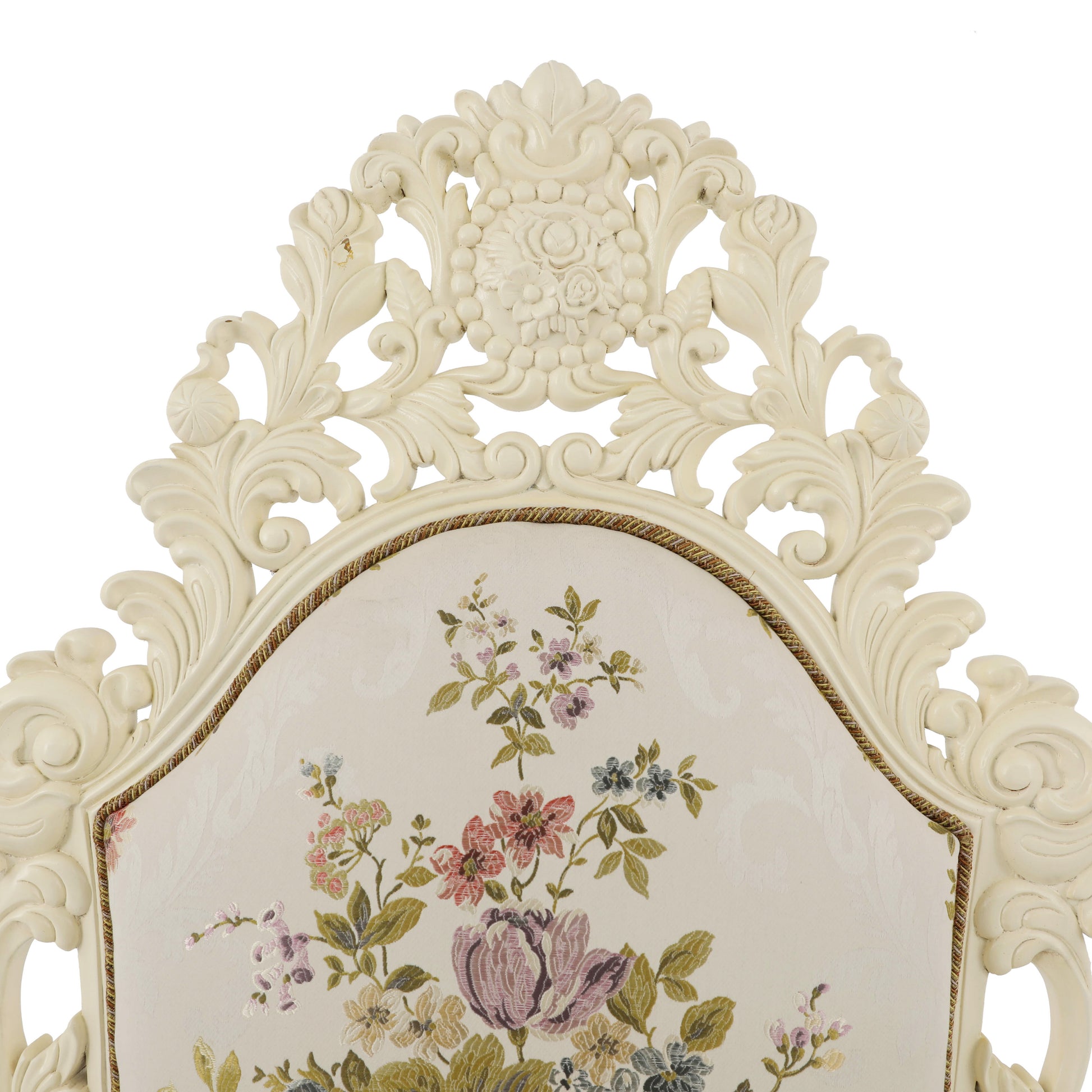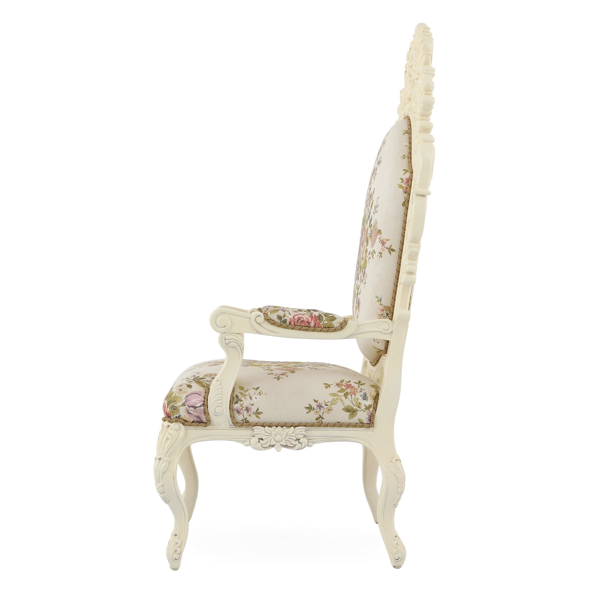 كرسي فاخر بتصميم ملكي يجمع بين الأناقة والجمال الأخاذ، يتميز بظهر عالٍ يُضفي عليه مزيدًا من الجاذبية. صُنع الكرسي من إطار متين من خشب الماهوجني بلون عاجي عتيق مع لمسات ذهبية راقية، مما يمنحه طابعًا فخمًا وعريقًا. يزدان الإطار بنقوش بارزة منحوتة يدويًا. يتميز الكرسي بتنجيد من قماش إيطالي فاخر منسوج بنقوش باقات زهور أنيقة بألوان زاهية، مما يضيف لمسة فنية. تجمع الأرجل المنحنية والمساند الأنيقة بين الراحة والجمال. يُعد هذا الكرسي قطعة مميزة في أي مكان، فهو أكثر من مجرد قطعة أثاث، إنه تحفة فنية ذات قيمة جمالية وحرفية عالية.