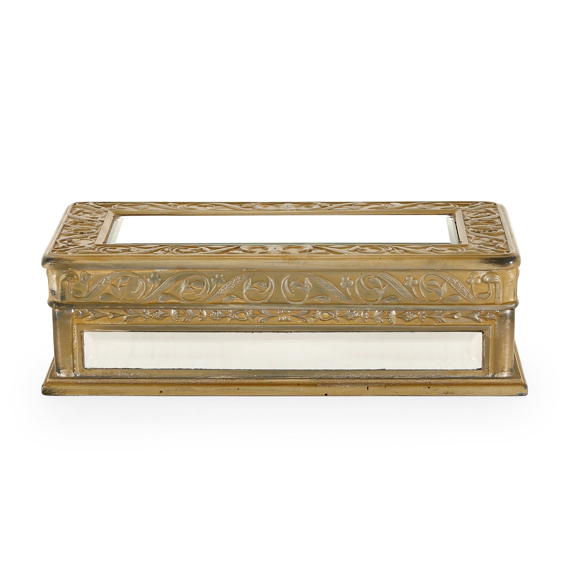 صندوق أنيق بتصميم يجمع بين البساطة والجاذبية. يتميز بهيكل معدني مستطيل مزين بنقوش محفورة بدقة ولمسة نهائية فضية عتيقة تضفي عليه طابعًا كلاسيكيًا راقيًا، مع مرايا عاكسة على سطحه تزيد من فخامته. إنه قطعة فاخرة مثالية لحفظ المقتنيات أو لإضافة لمسة أنيقة إلى الطاولات أو طاولات الزينة.