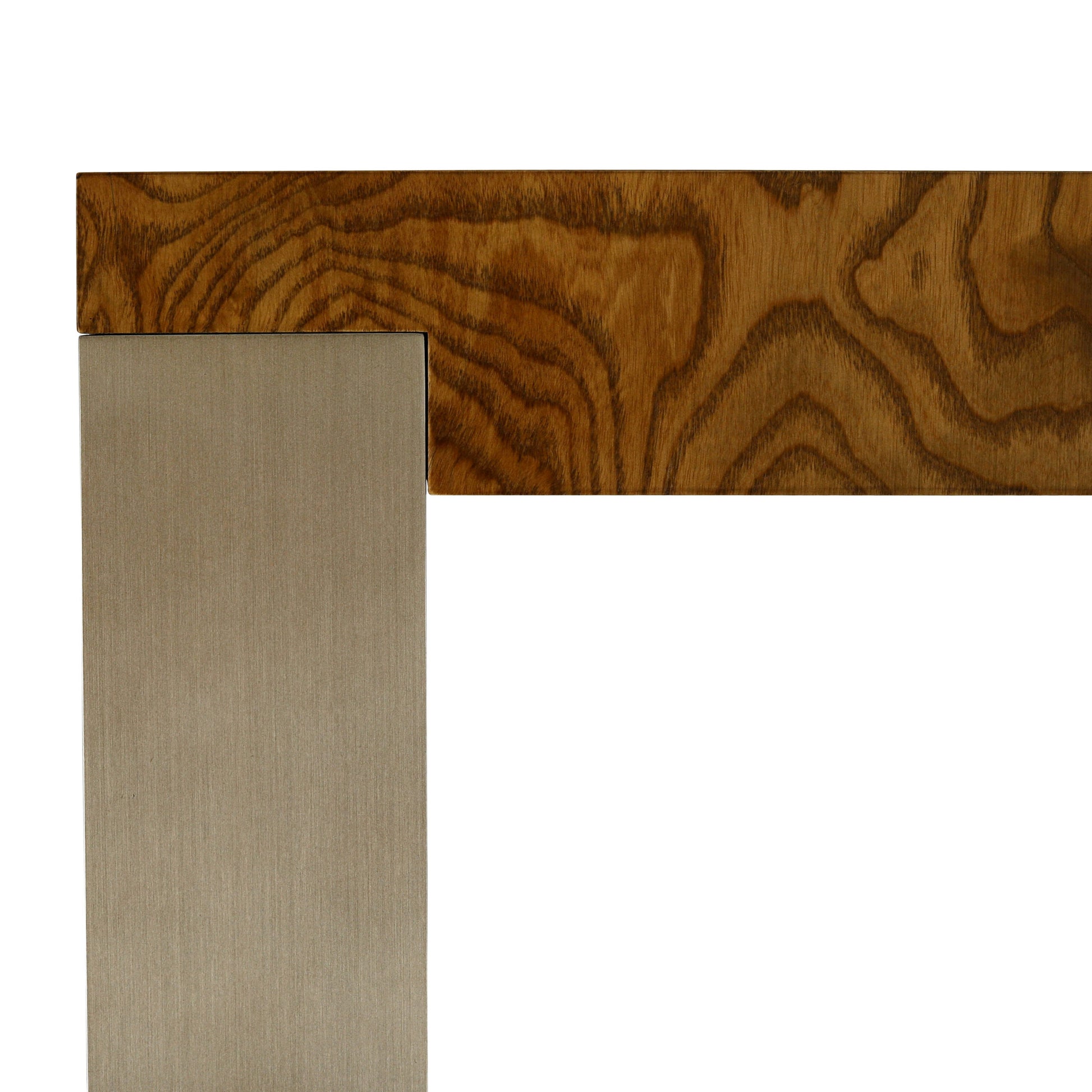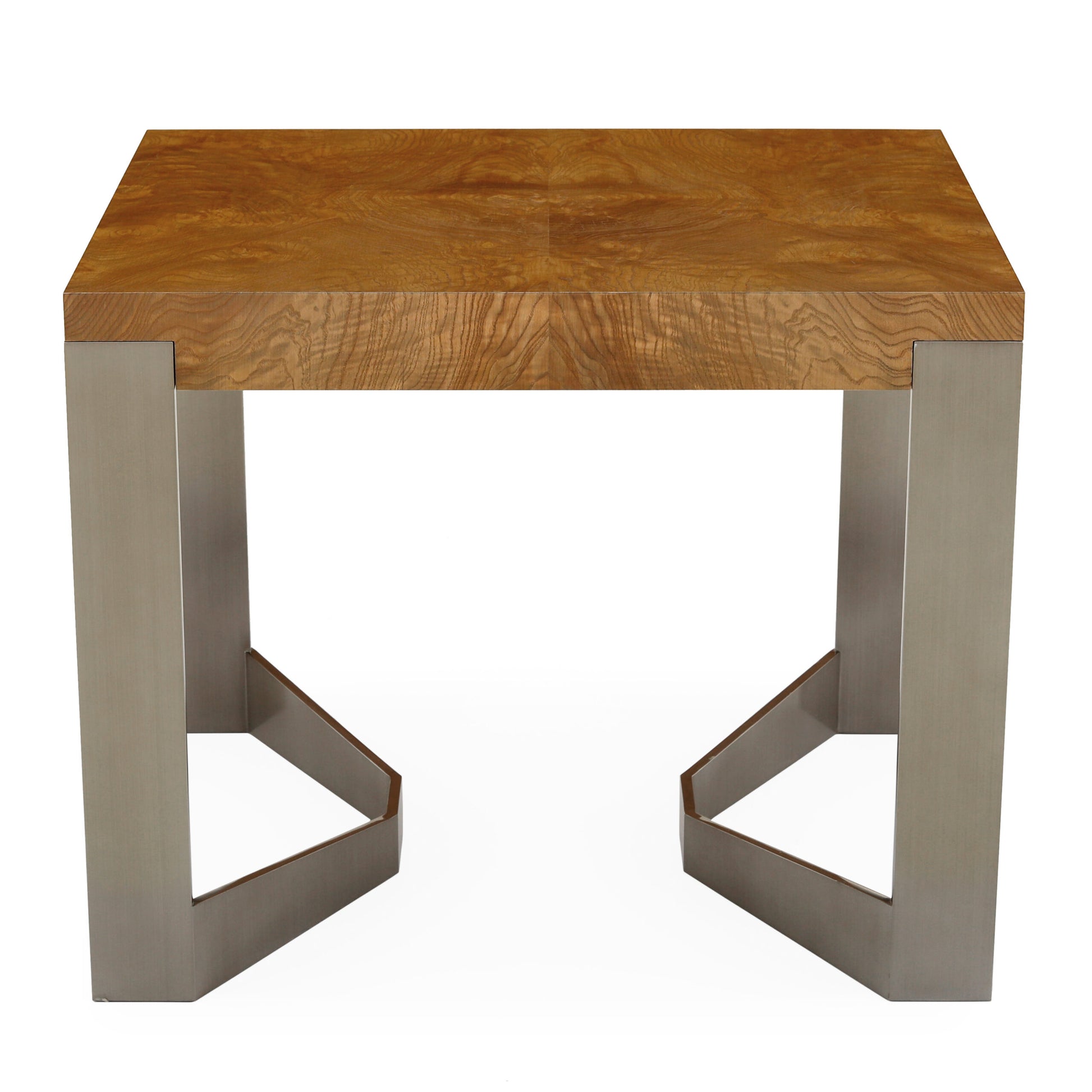سطح من خشب الدردار الزيتوني من Rex End Table بلمسة نهائية رمادية دافئة مع قاعدة من الفولاذ المقاوم للصدأ بلمسة نهائية من الساتان العتيق