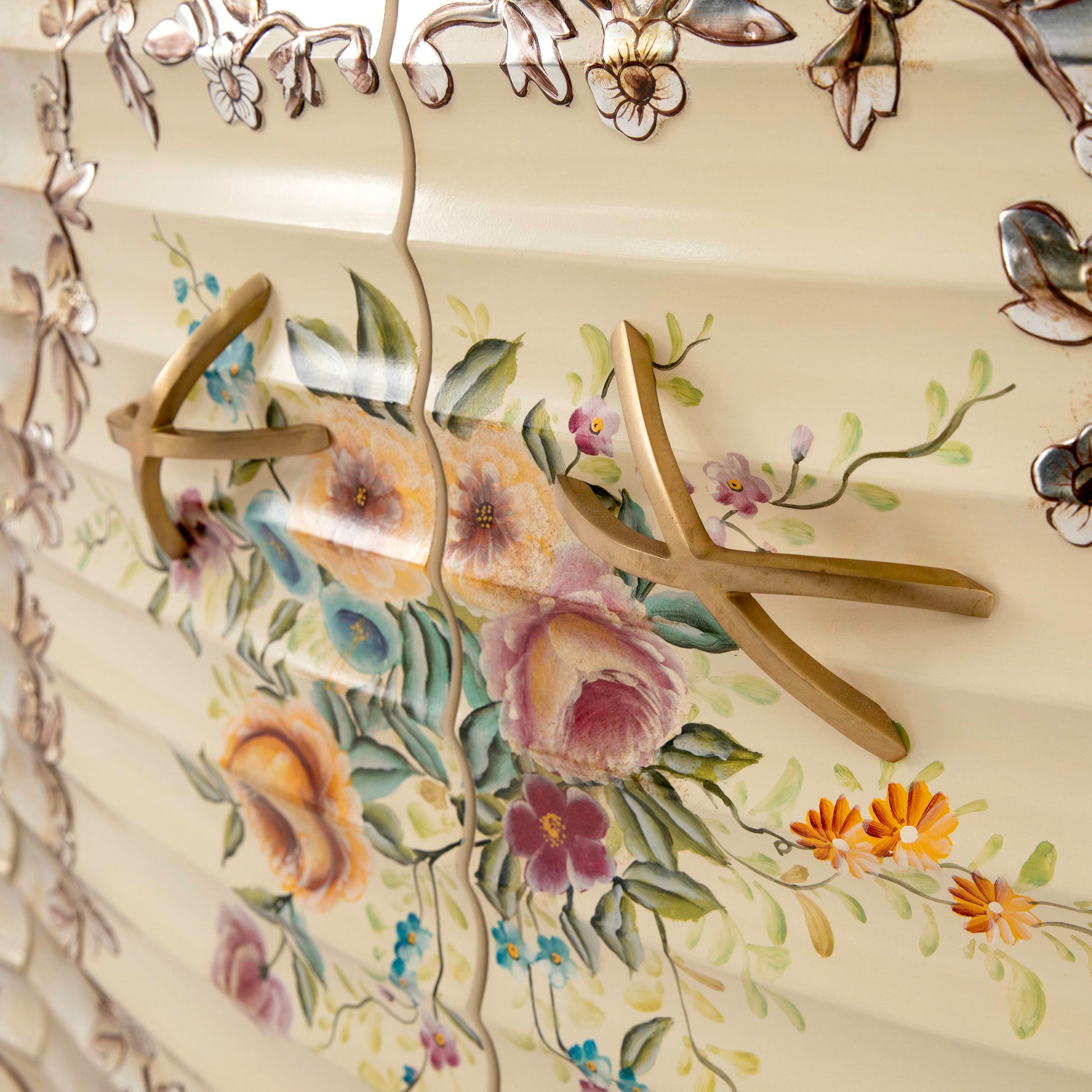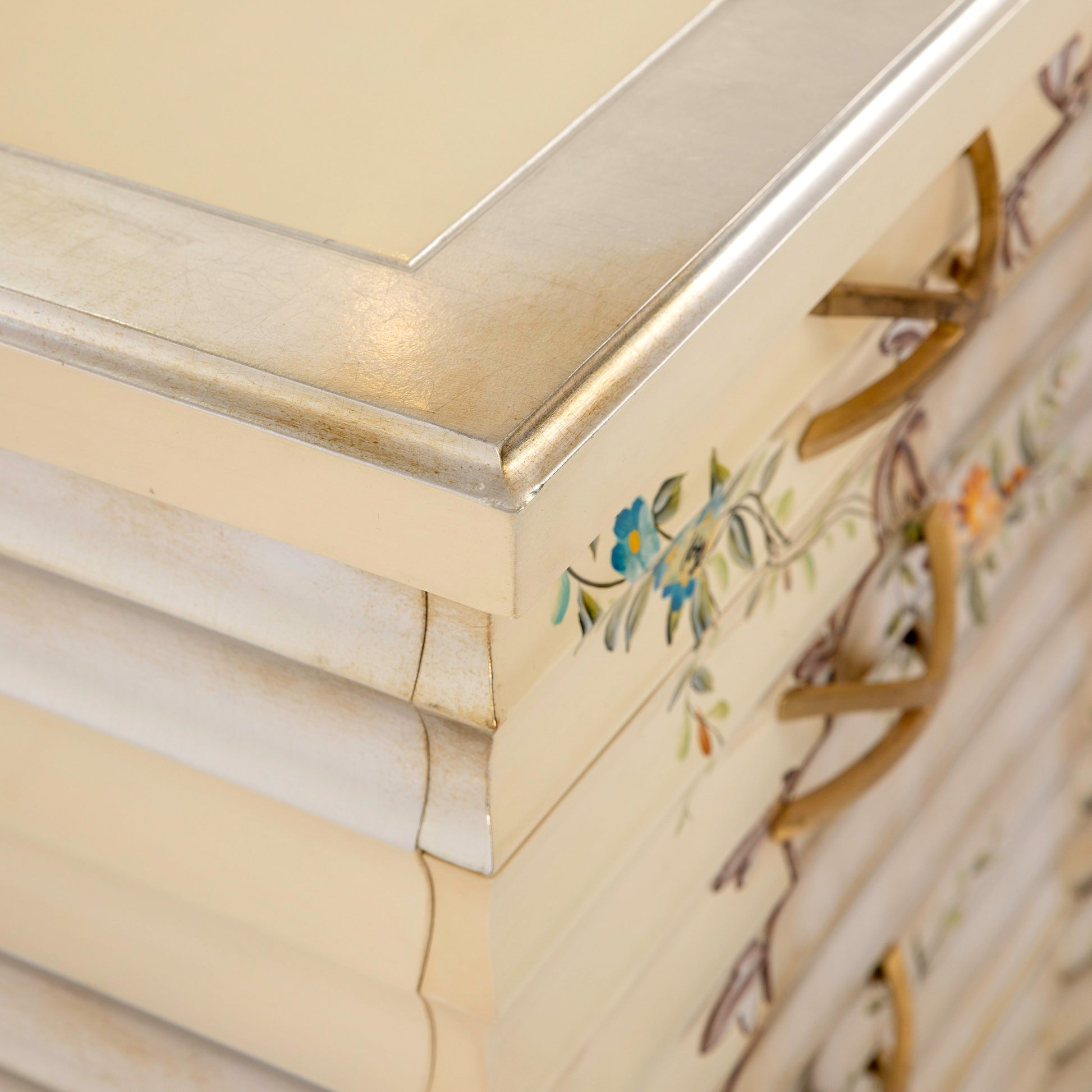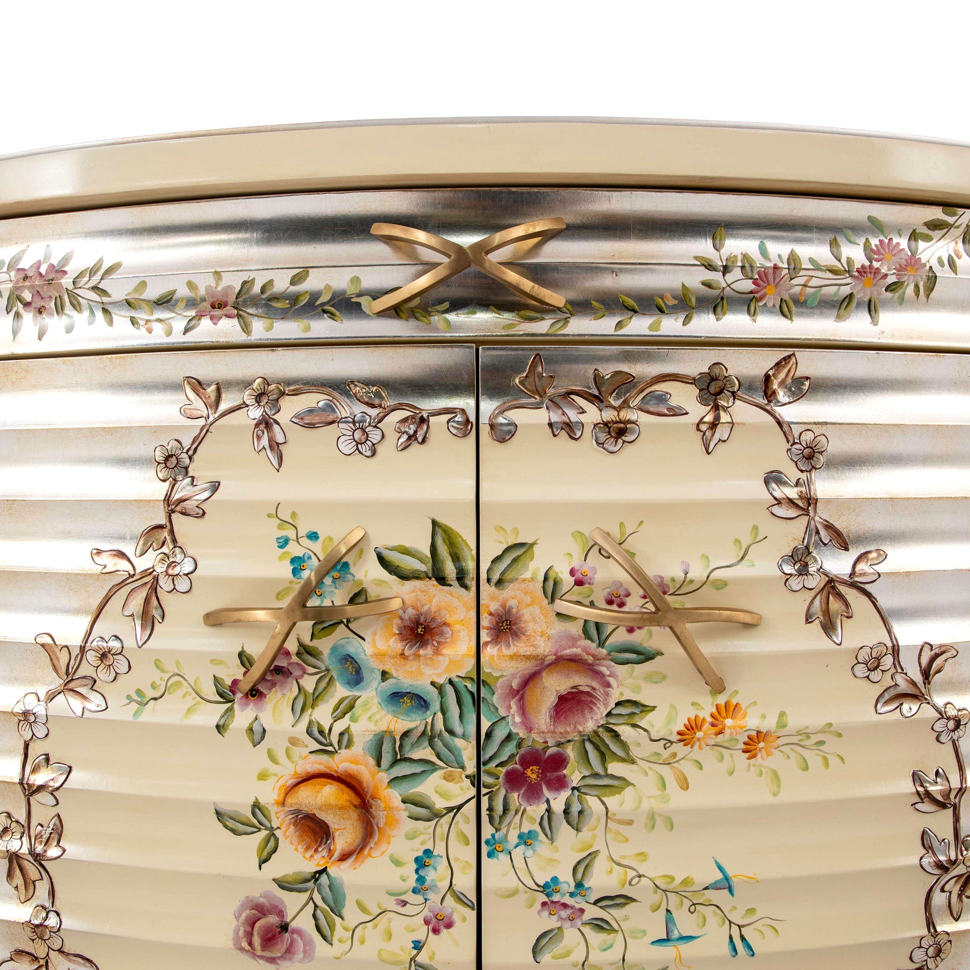 خزانة ملابس خشبية فاخرة بتصميم كلاسيكي عتيق. مصنوعة من خشب الماهوجني المتين، ومطلية بطلاء فضي عتيق يُبرز جمال تفاصيلها. تزدان واجهتها بنقوش يدوية أنيقة ورسومات زهرية مرسومة يدويًا بألوان غنية تُضفي عليها حيويةً ولمسة فنية رائعة. تتضمن مجموعة غرفة النوم لهذه الخزانة سريرًا وطاولتين جانبيتين ومرآة. تُعد هذه الخزانة الخيار الأمثل لما تُضفيه من جمال خلاب على غرفة النوم.