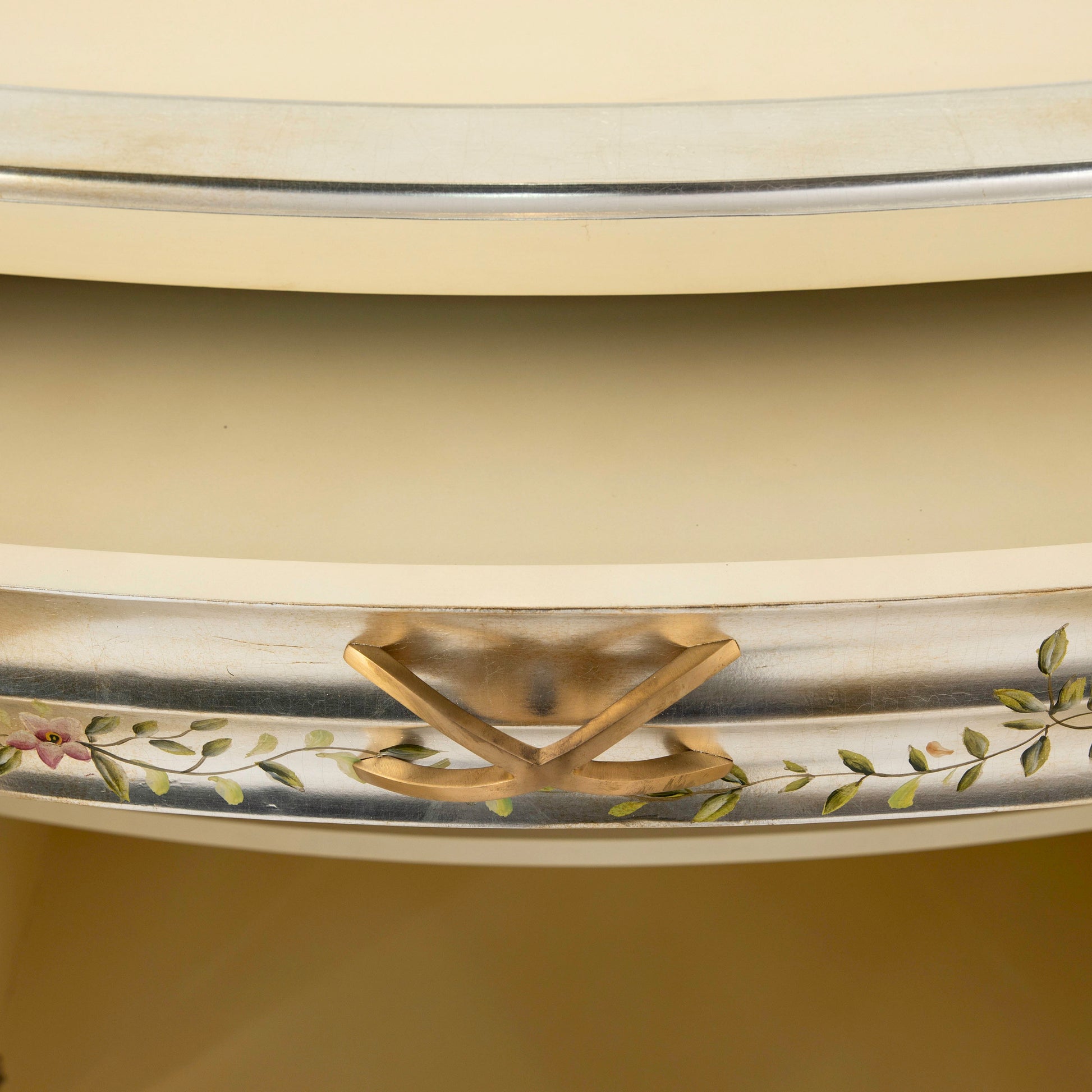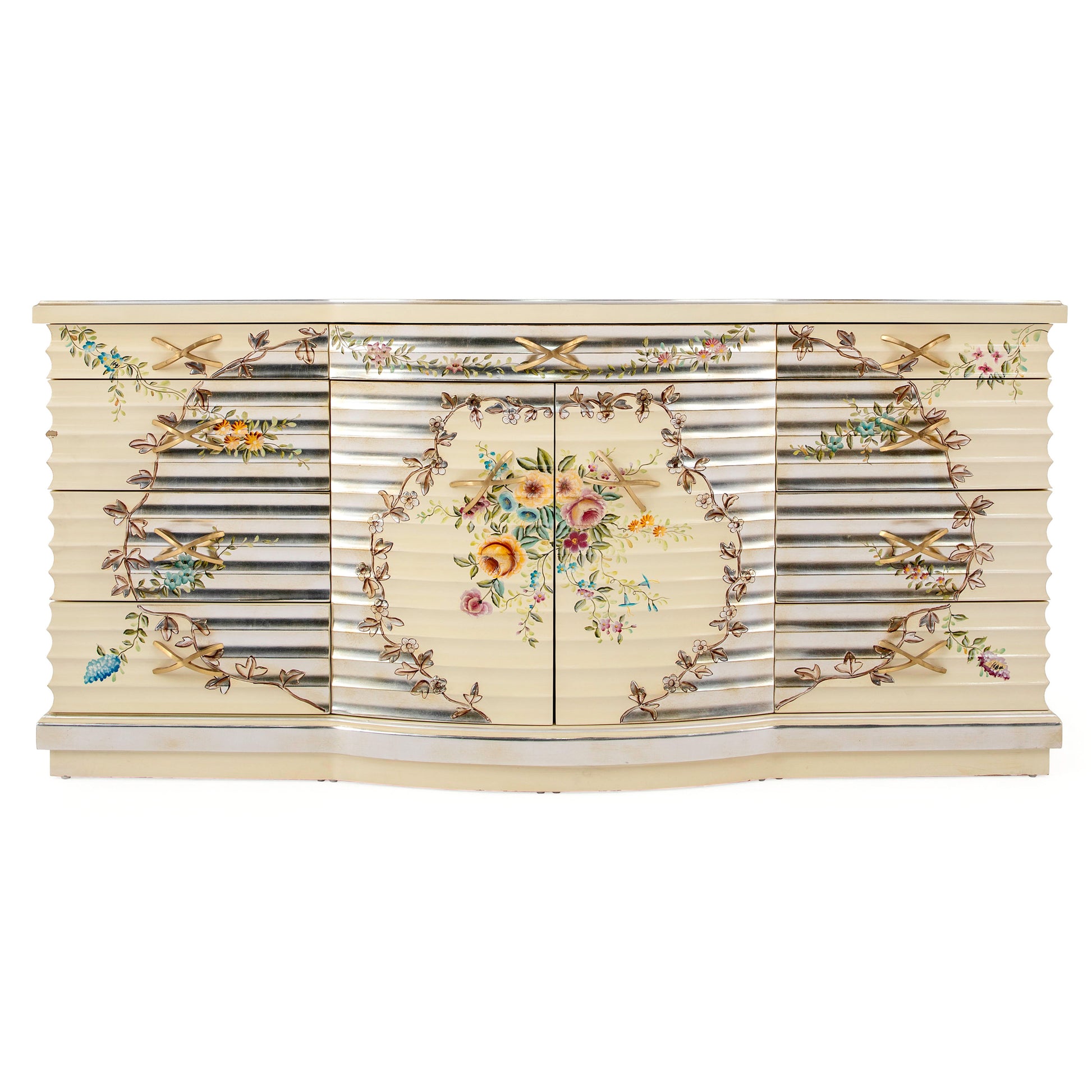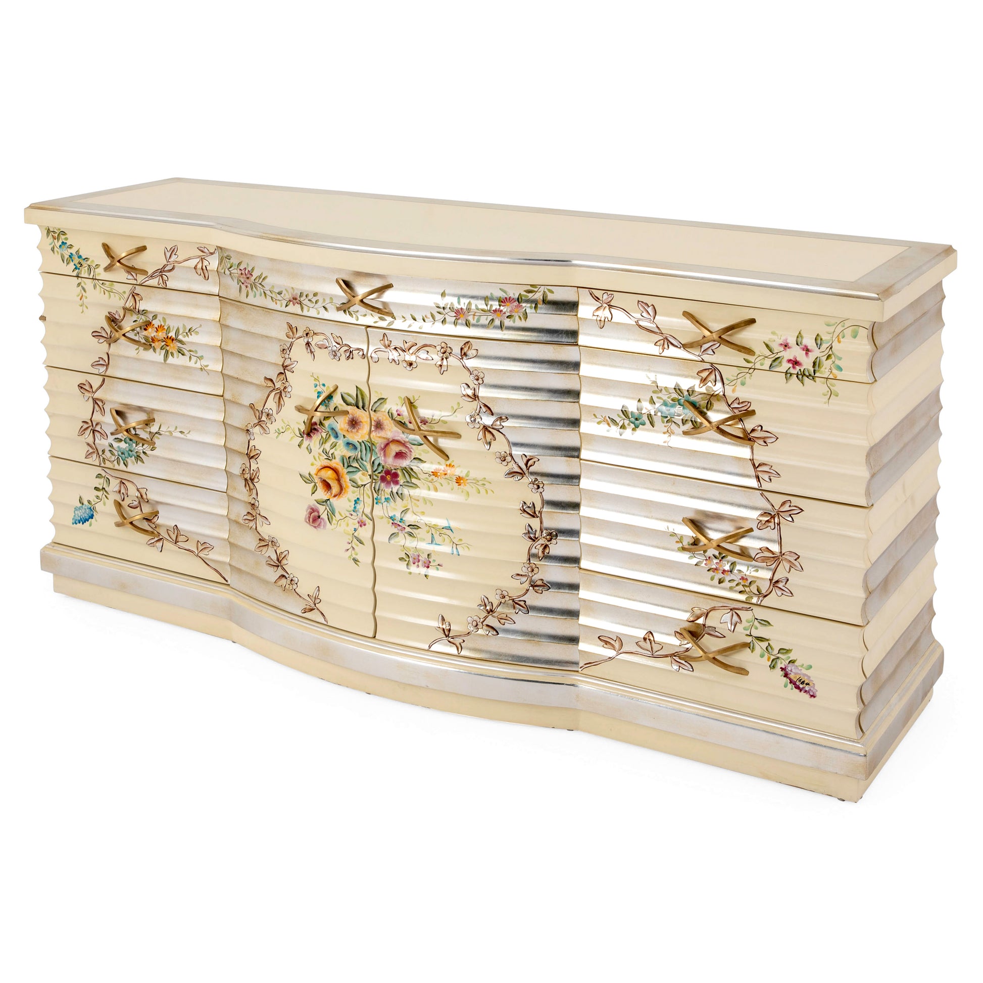 خزانة ملابس خشبية فاخرة بتصميم كلاسيكي عتيق. مصنوعة من خشب الماهوجني المتين، ومطلية بطلاء فضي عتيق يُبرز جمال تفاصيلها. تزدان واجهتها بنقوش يدوية أنيقة ورسومات زهرية مرسومة يدويًا بألوان غنية تُضفي عليها حيويةً ولمسة فنية رائعة. تتضمن مجموعة غرفة النوم لهذه الخزانة سريرًا وطاولتين جانبيتين ومرآة. تُعد هذه الخزانة الخيار الأمثل لما تُضفيه من جمال خلاب على غرفة النوم.