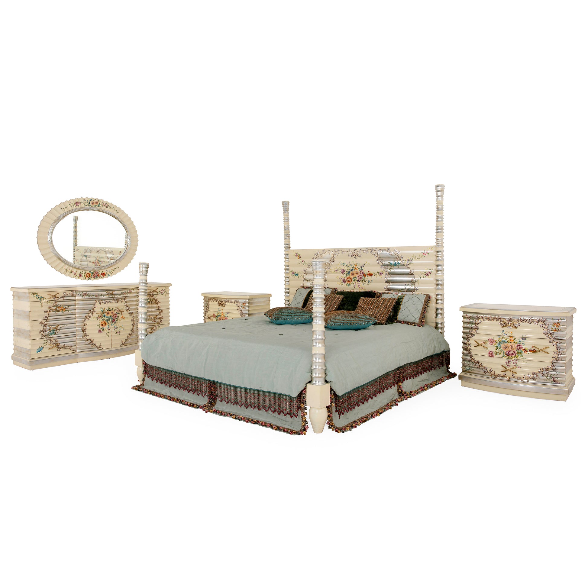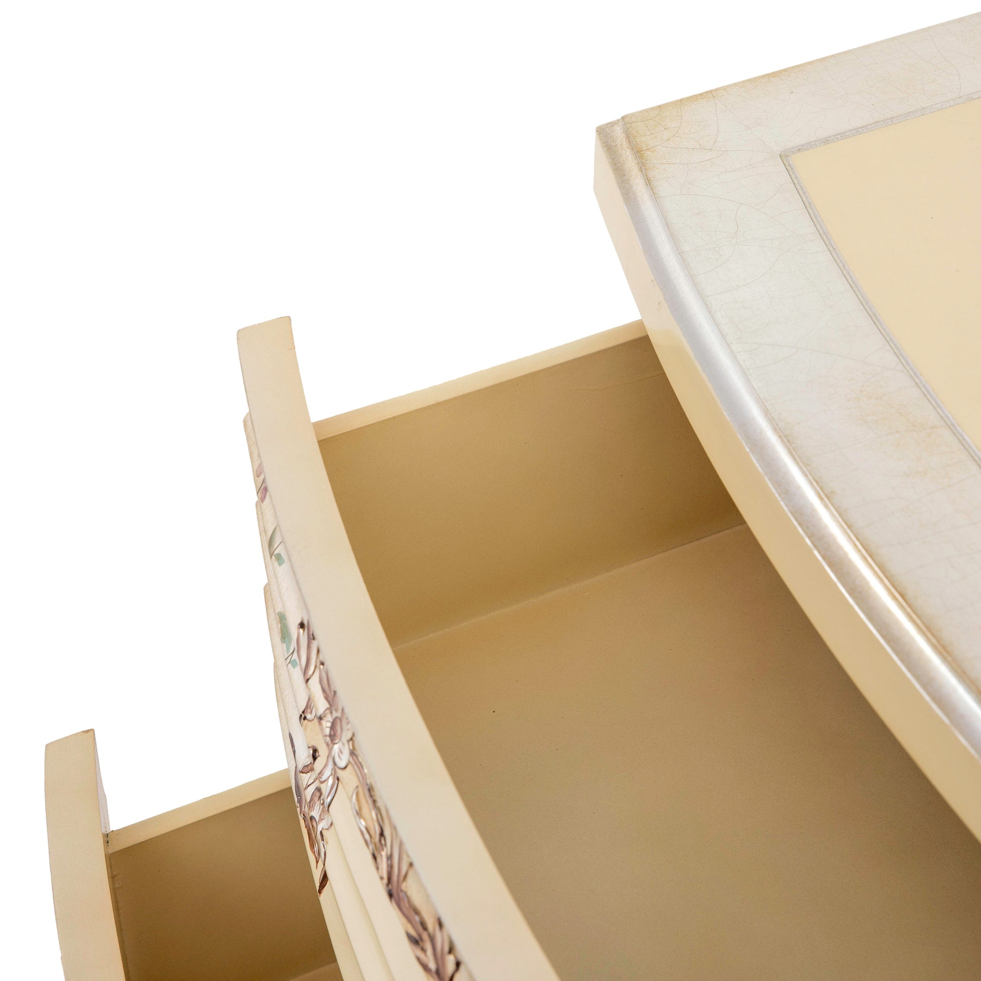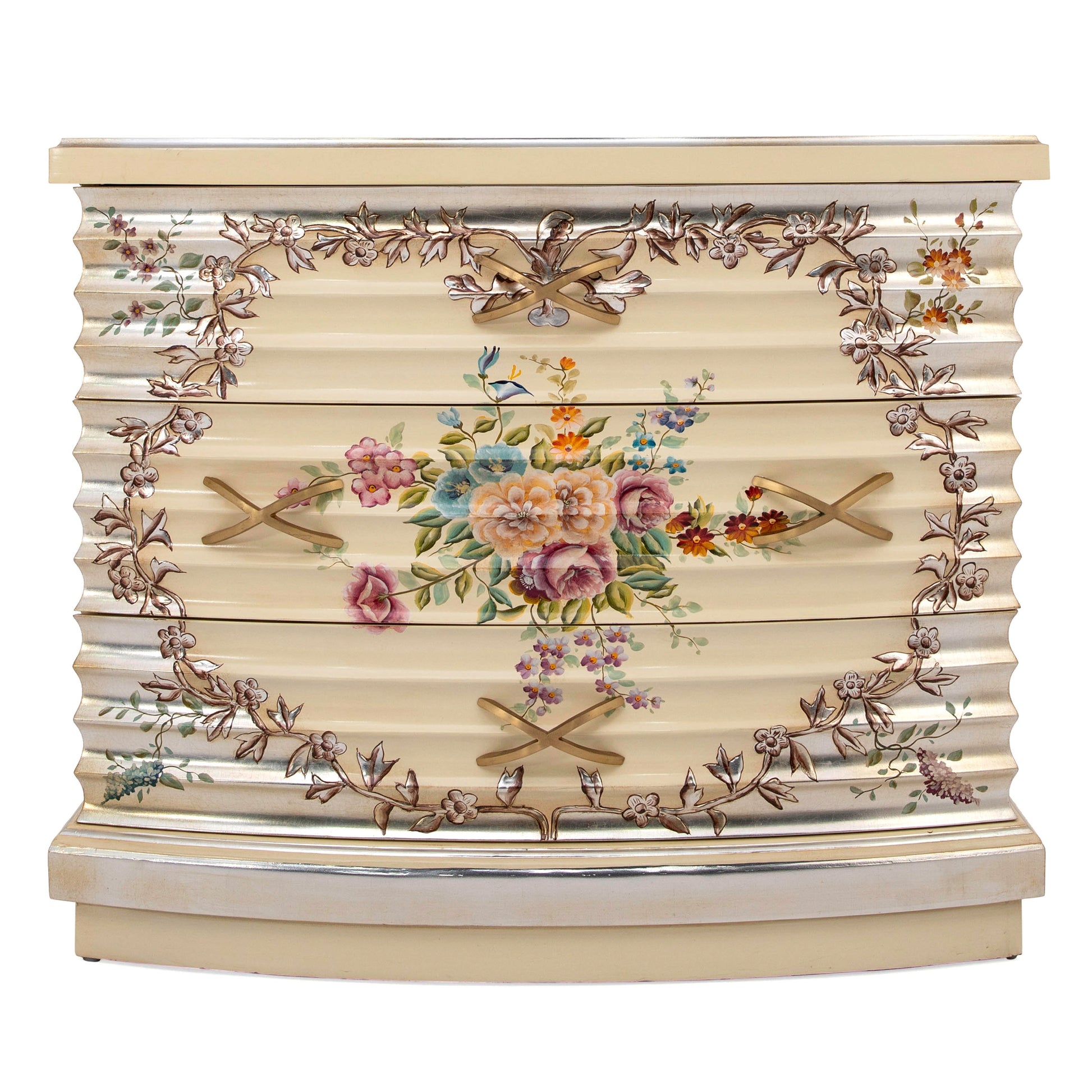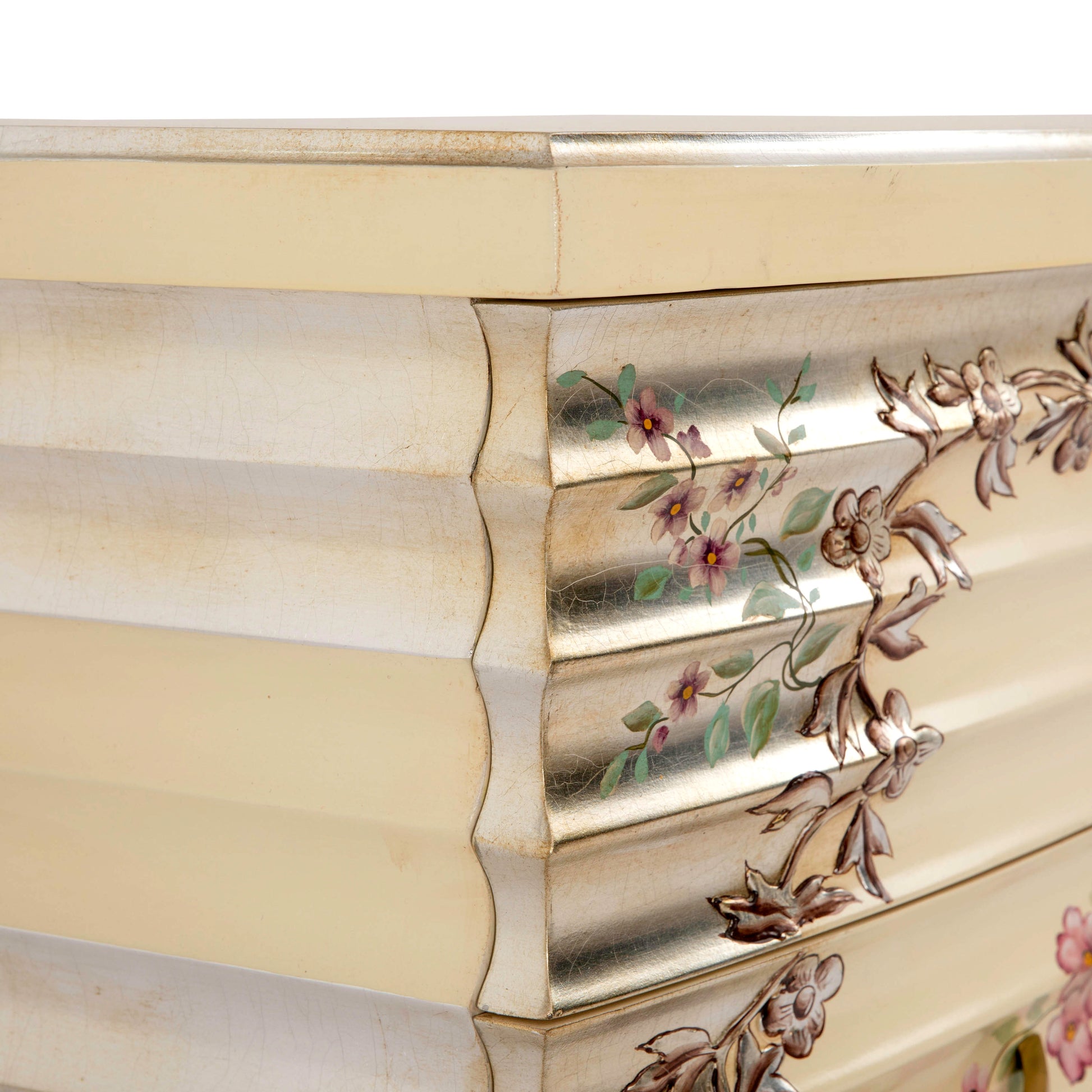 طاولة جانبية تجمع بين الحرفية الراقية والطابع الكلاسيكي العريق. مصنوعة من خشب الماهوجني المتين بطلاء فضي عتيق يبرز جمال تفاصيلها. تزدان واجهتها بنقوش يدوية أنيقة ورسومات زهور مرسومة يدويًا بألوان غنية، مما يضفي عليها حيوية ولمسة فنية رائعة. تتضمن مجموعة غرفة النوم لهذه الطاولة سريرًا، وطاولتين جانبيتين، وخزانة ملابس مزودة بمرآة. تُعد هذه الطاولة خيارًا مثاليًا لمن يبحثون عن الأناقة الكلاسيكية والجودة العالية التي تُضفي لمسة من الفخامة على غرفة نومهم.