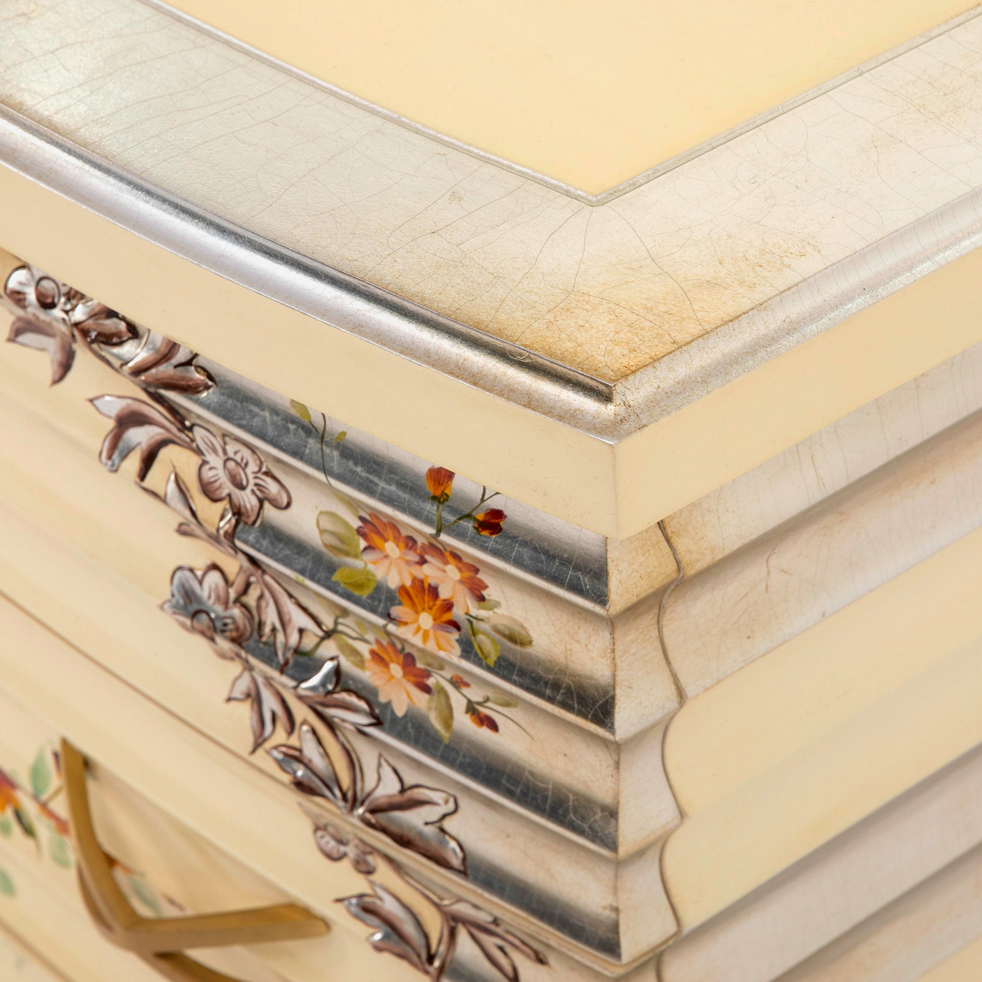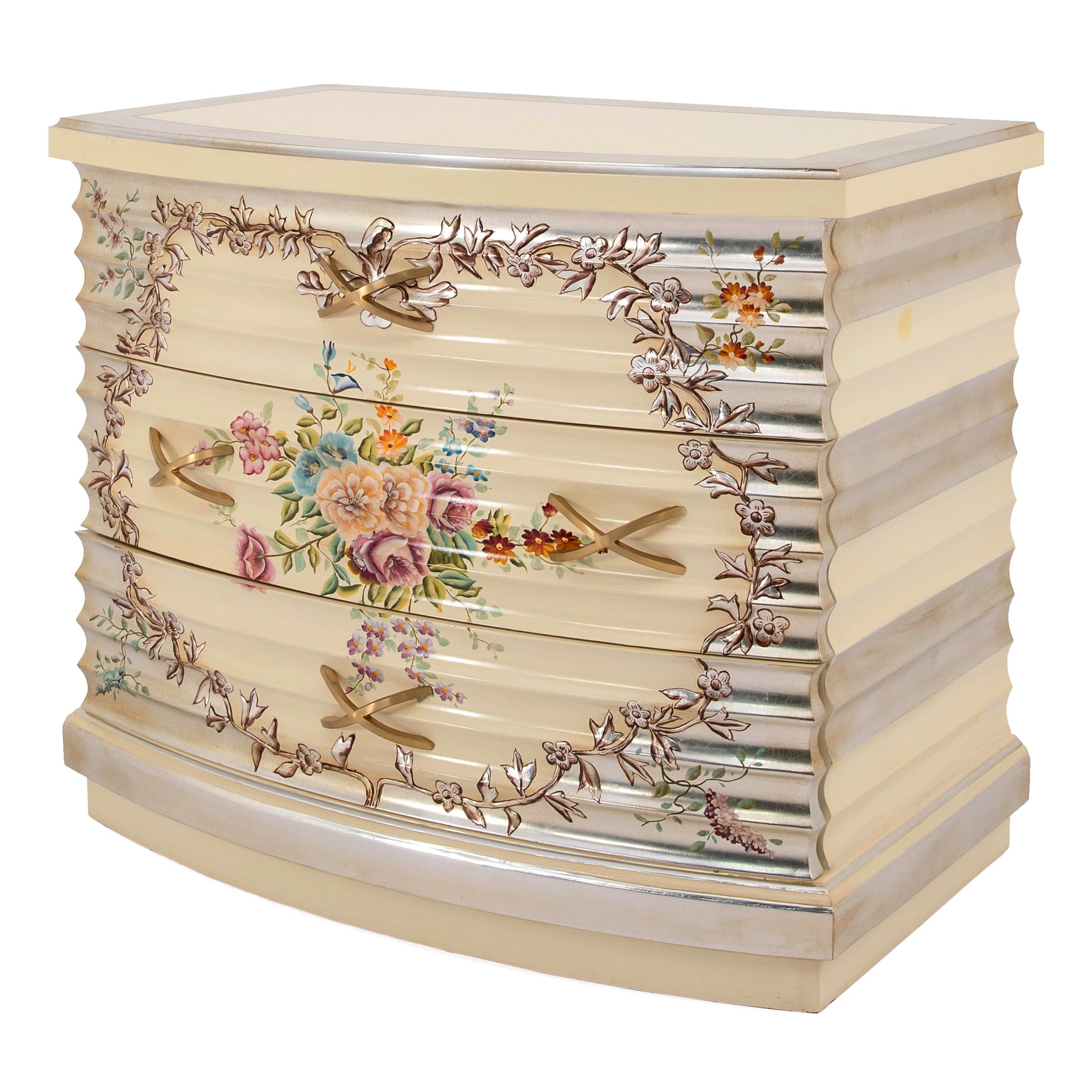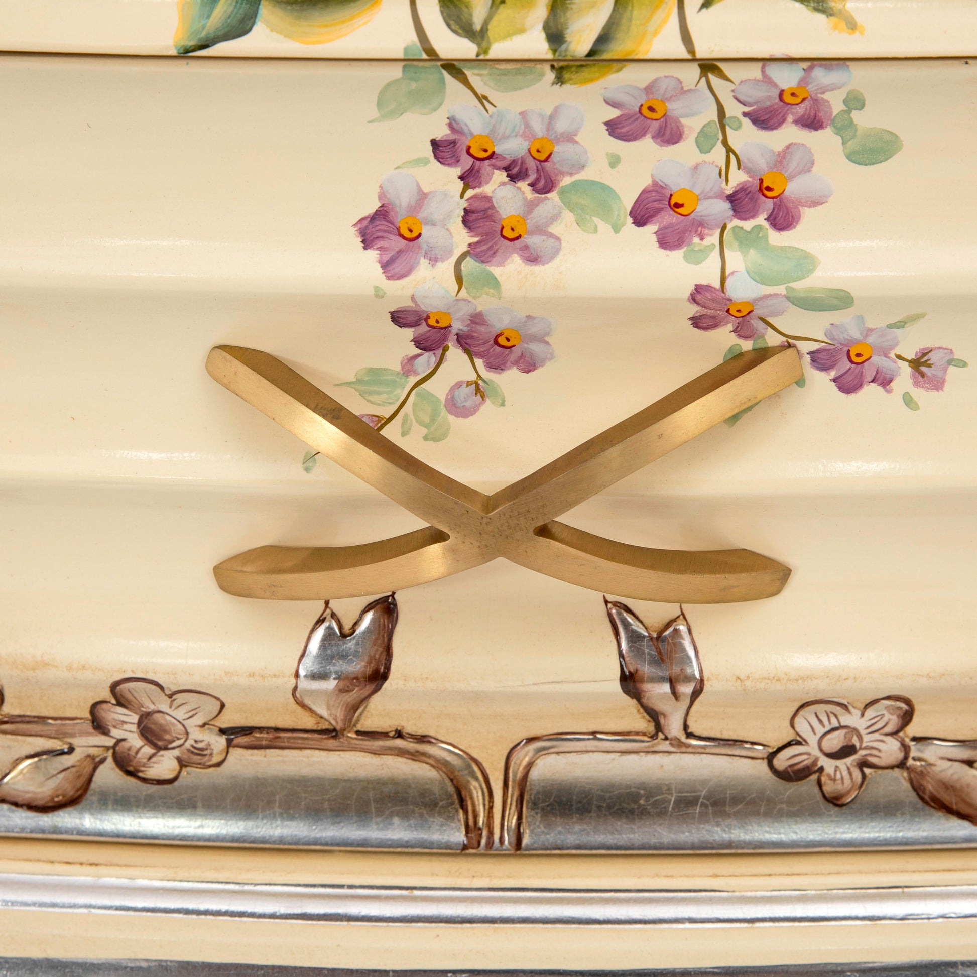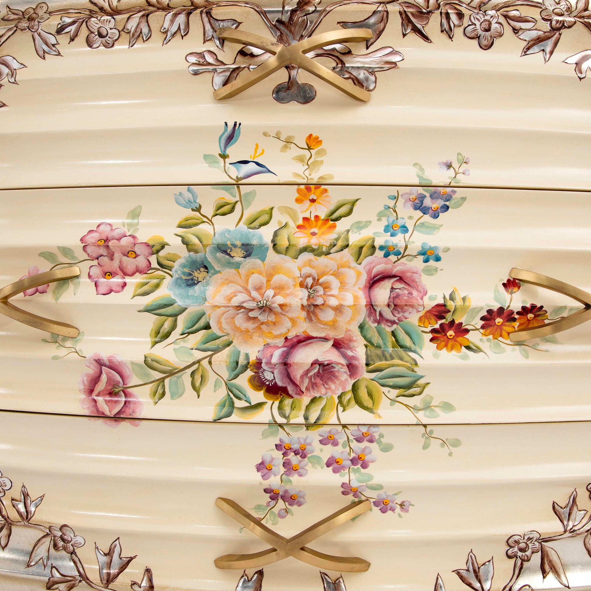 طاولة جانبية تجمع بين الحرفية الراقية والطابع الكلاسيكي العريق. مصنوعة من خشب الماهوجني المتين بطلاء فضي عتيق يبرز جمال تفاصيلها. تزدان واجهتها بنقوش يدوية أنيقة ورسومات زهور مرسومة يدويًا بألوان غنية، مما يضفي عليها حيوية ولمسة فنية رائعة. تتضمن مجموعة غرفة النوم لهذه الطاولة سريرًا، وطاولتين جانبيتين، وخزانة ملابس مزودة بمرآة. تُعد هذه الطاولة خيارًا مثاليًا لمن يبحثون عن الأناقة الكلاسيكية والجودة العالية التي تُضفي لمسة من الفخامة على غرفة نومهم.