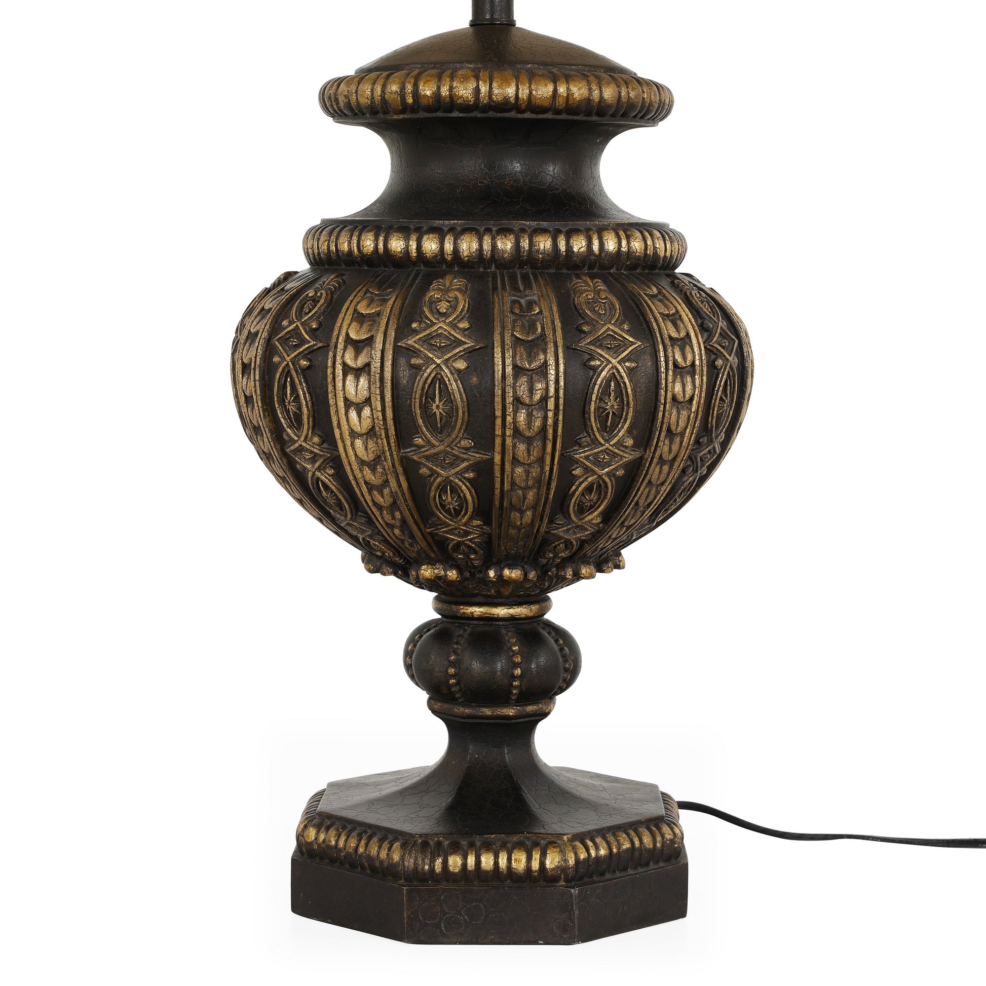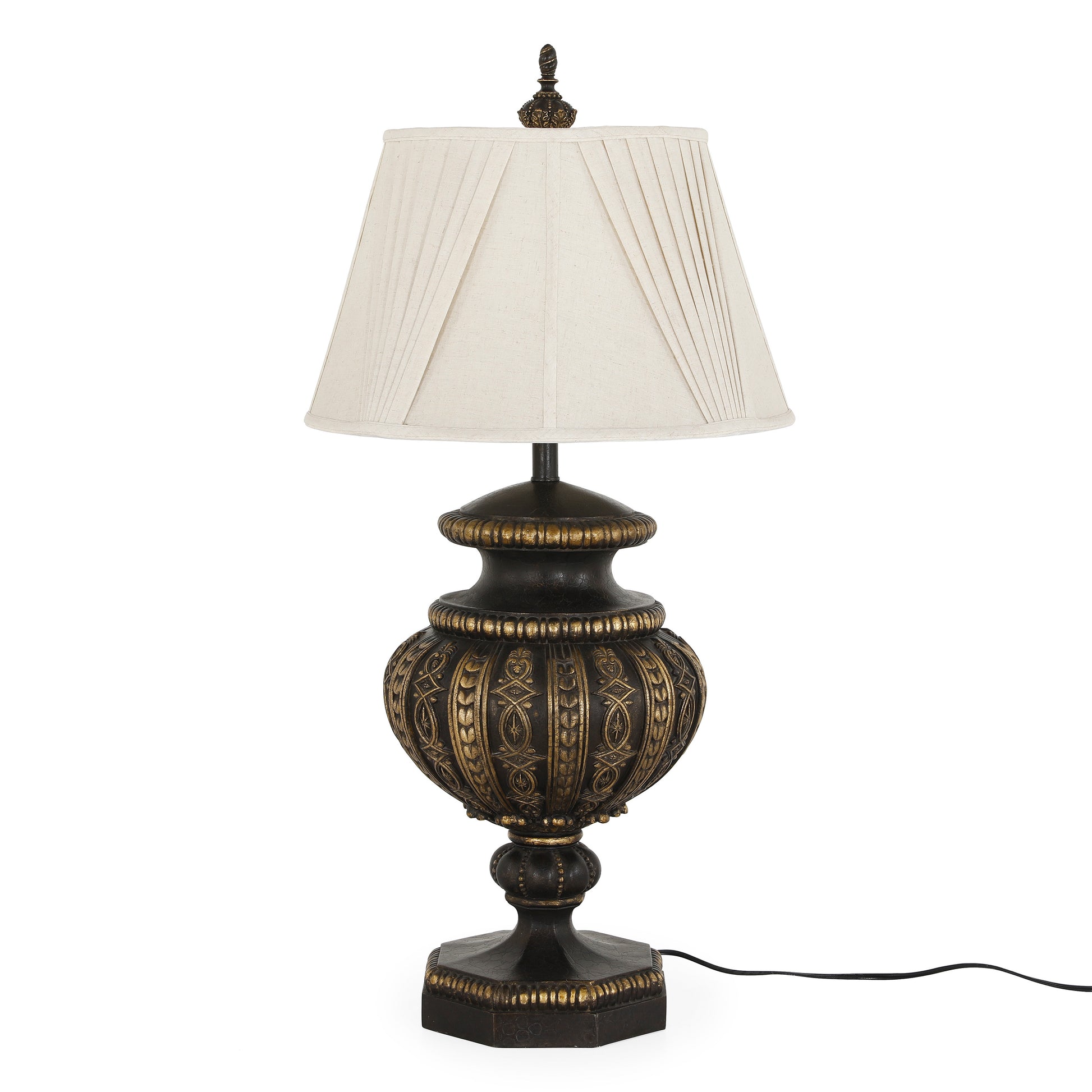 مصباح طاولة خشبي أنيق بتصميم كلاسيكي فاخر ينسجم بسلاسة مع مختلف أنماط الديكور. يتميز بهيكل مستوحى من أشكال الجرار التقليدية، بلمسة نهائية عتيقة تجمع بين اللون البني الداكن ولمسات ذهبية أنيقة لتعزيز طابعه الراقي. يرتكز المصباح على قاعدة متوازنة توفر له الثبات والتكامل البصري، ويعلوه غطاء حريري عاجي ناعم ينشر الضوء بلطف ويخلق جواً دافئاً ومريحاً. يُعد هذا المصباح قطعة ديكور استثنائية تُضفي لمسة من الفخامة والرقي على أي مكان.