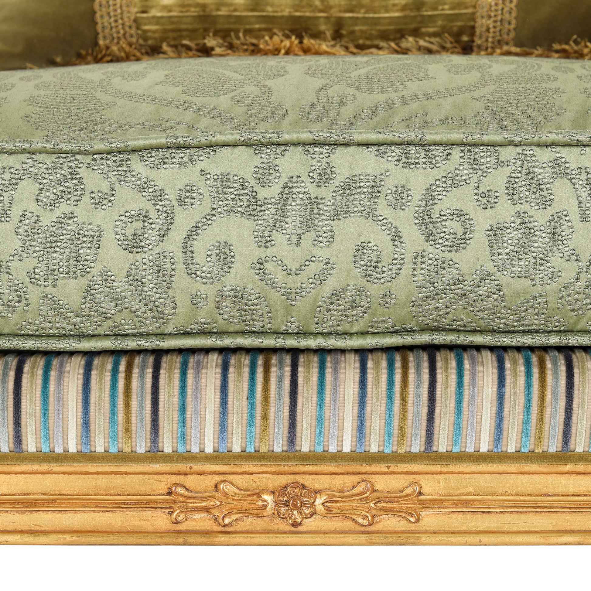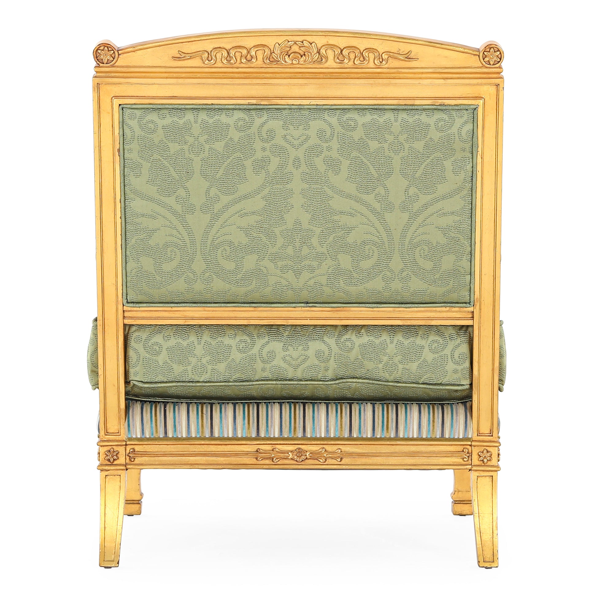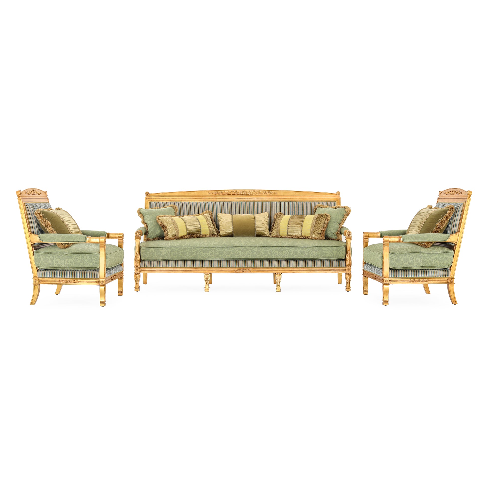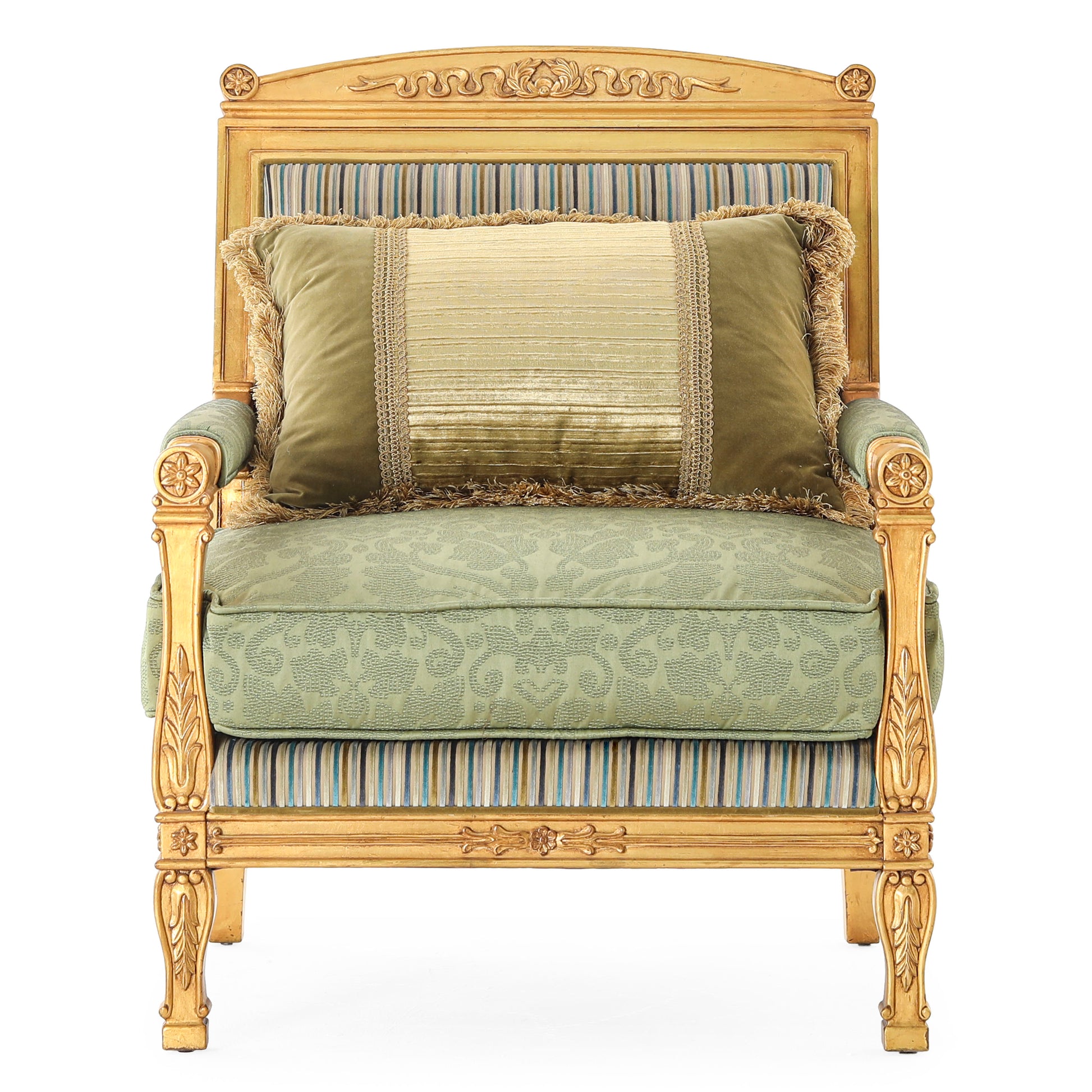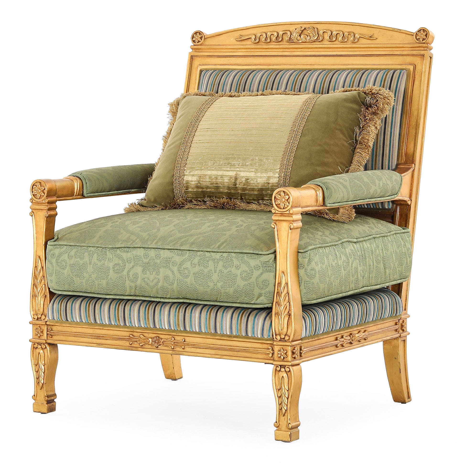 كرسي استرخاء فاخر بتصميم كلاسيكي أنيق، يتميز بجودة عالية من حيث متانة الخشب والمواد الفاخرة. يتميز بإطار مذهب مزين بزخارف يدوية ناعمة تضفي لمسة من الرقي. يأتي الكرسي مع وسادة مقعد منفصلة مُنجّدة بقماش ناعم ذي نقش أنيق يوفر راحة فائقة. تم تزيين الظهر والقاعدة بتنجيد مخملي مخطط بدرجات اللون الأخضر والذهبي، مما يمنح الكرسي طابعًا فاخرًا يتناغم مع التصميم الكلاسيكي. يكتمل المظهر بوسادة متناسقة تضيف لمسة جمالية وتعزز الراحة. يُعد الكرسي قطعة أنيقة بحد ذاته، ويتناغم بشكل مثالي مع الأريكة المتناسقة لتشكيل طقم جلوس فاخر.