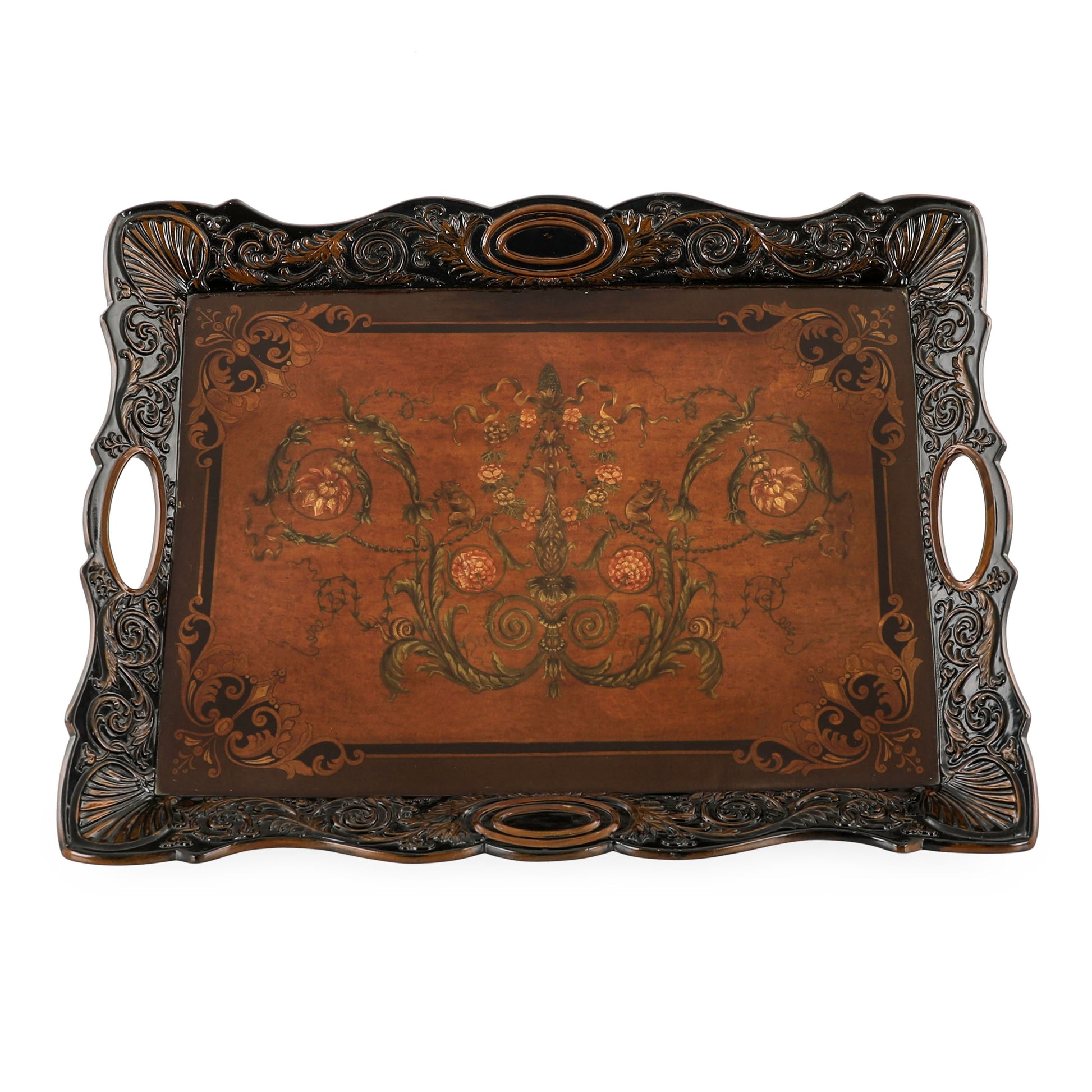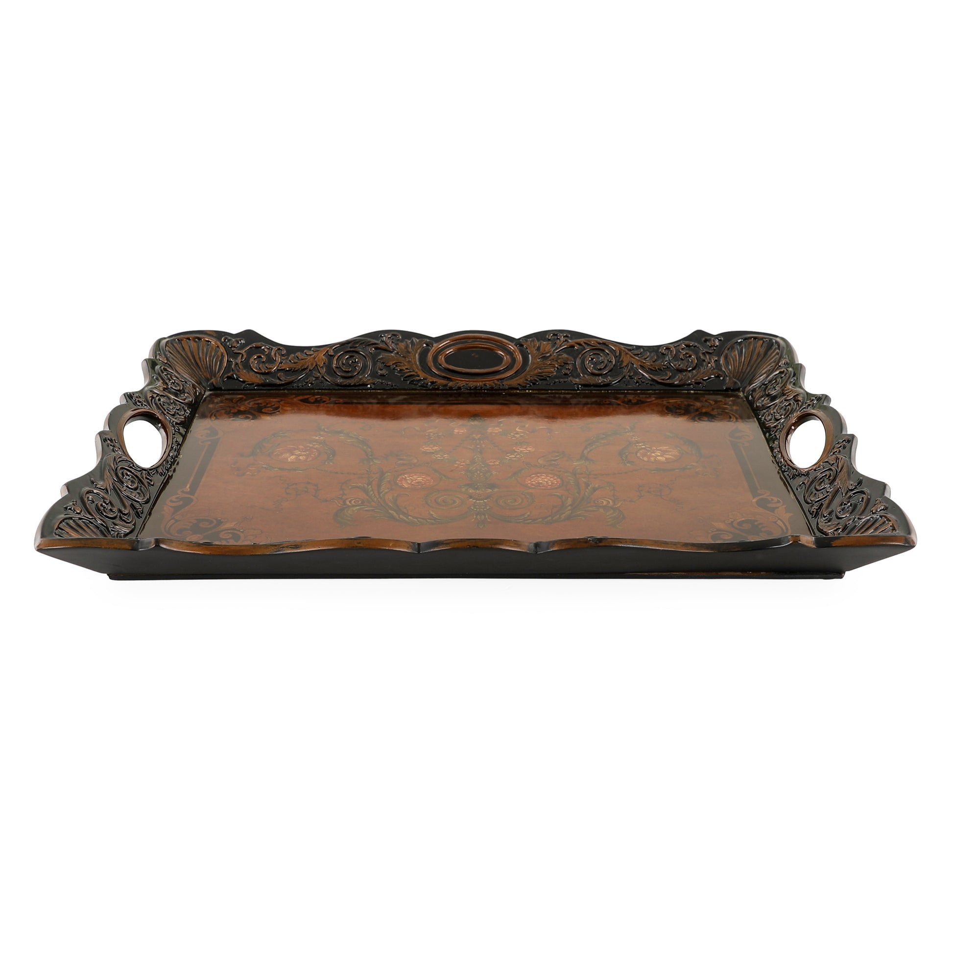 صينية خشبية فاخرة بتصميم كلاسيكي أنيق. تتميز برسومات يدوية رائعة وزخارف غنية على سطحها تضفي عليها طابعًا تقليديًا راقيًا. يحيط بها إطار مزخرف ومقابض جانبية أنيقة تعزز وظيفتها العملية وتمنحها طابعًا تراثيًا مميزًا. يمكن استخدام هذه الصينية للتقديم أو كقطعة ديكور فاخرة تُثري المكان.
