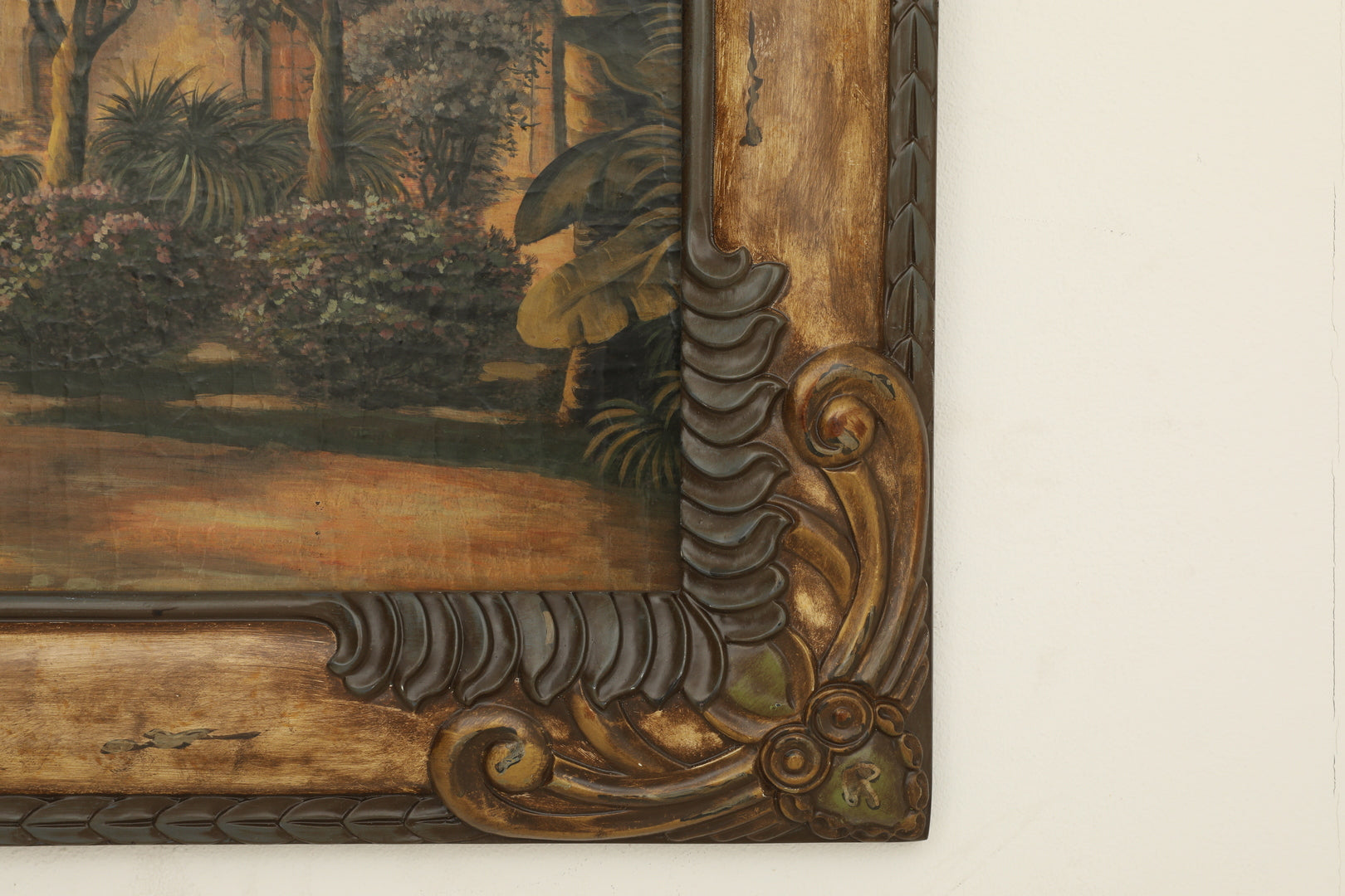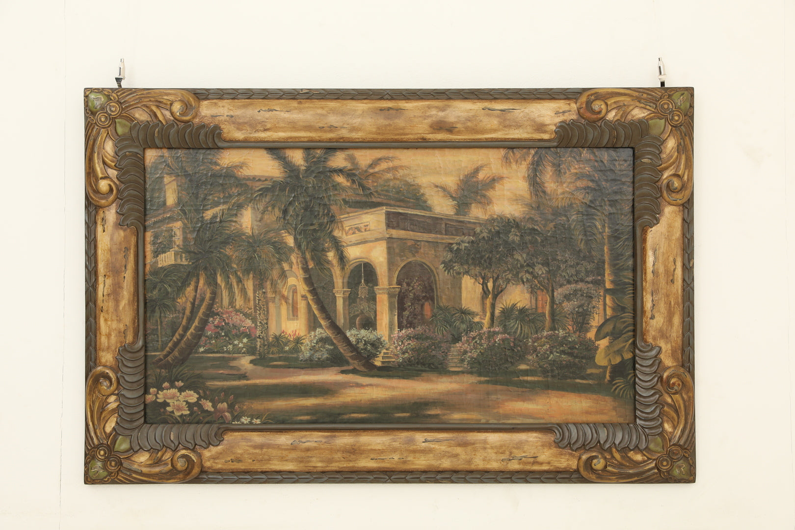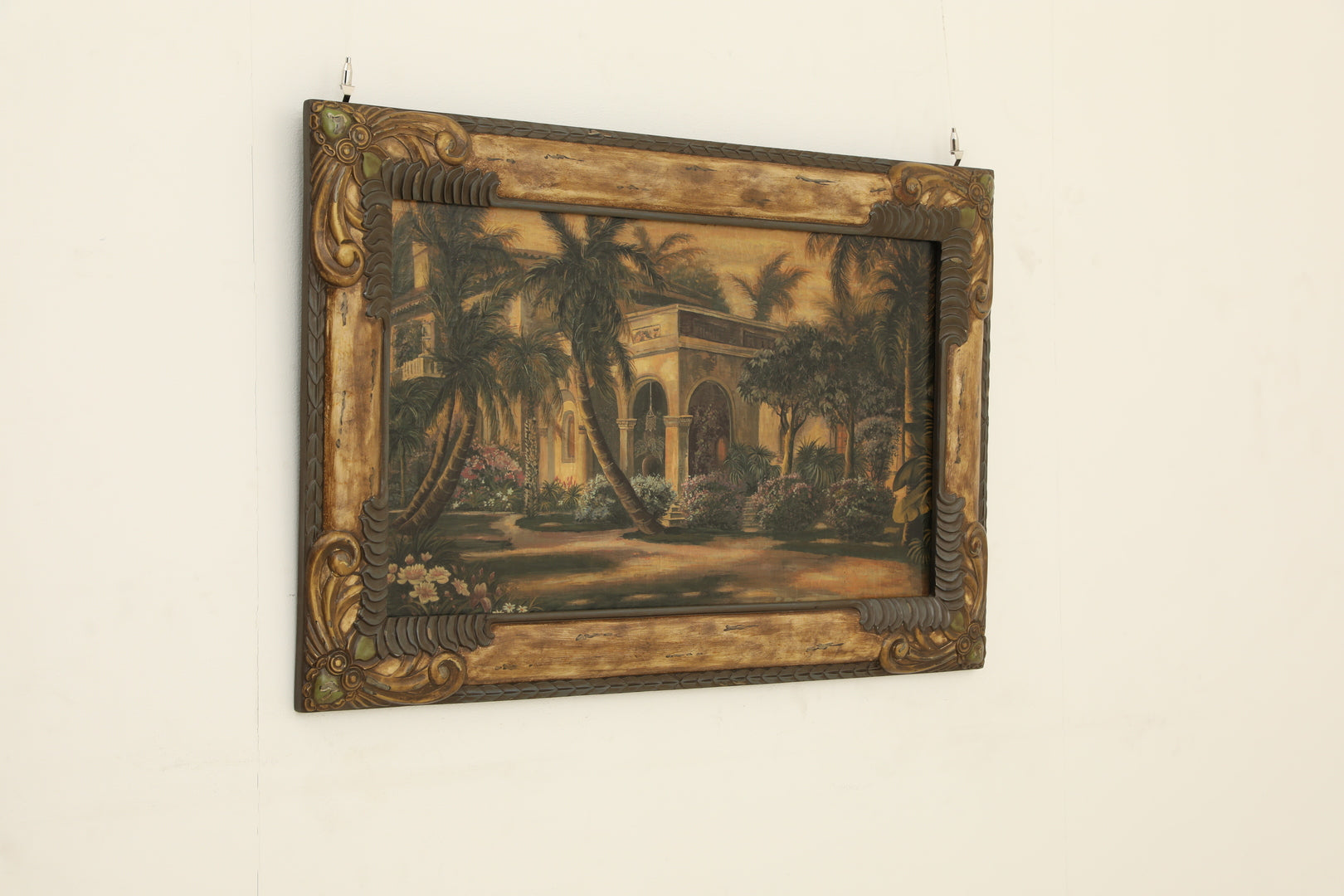 لوحة جدارية خشبية فاخرة مرسومة يدويًا، تُضفي على المكان فخامةً وأناقةً، وتصور مبنىً كلاسيكيًا محاطًا بأشجار النخيل وطبيعة خلابة بألوان هادئة. يحيط باللوحة إطار خشبي منحوت مزين بزخارف عتيقة بارزة تمنحها طابعًا أصيلًا، مما يجعلها قطعة فنية راقية تليق بعشاق الفن الكلاسيكي الراقي.