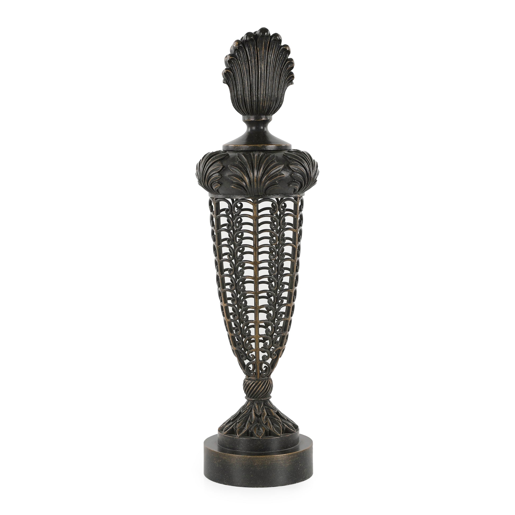 A decorative jar featuring openwork motifs in a luxurious classic design. The jar rests on a two-tier circular base adorned with meticulously carved leaf patterns, giving the piece a breathtaking appearance of elegance and sophistication. The body features intricate openwork patterns, crowned with a stylish lid and a decorative finial that enhances its beauty.