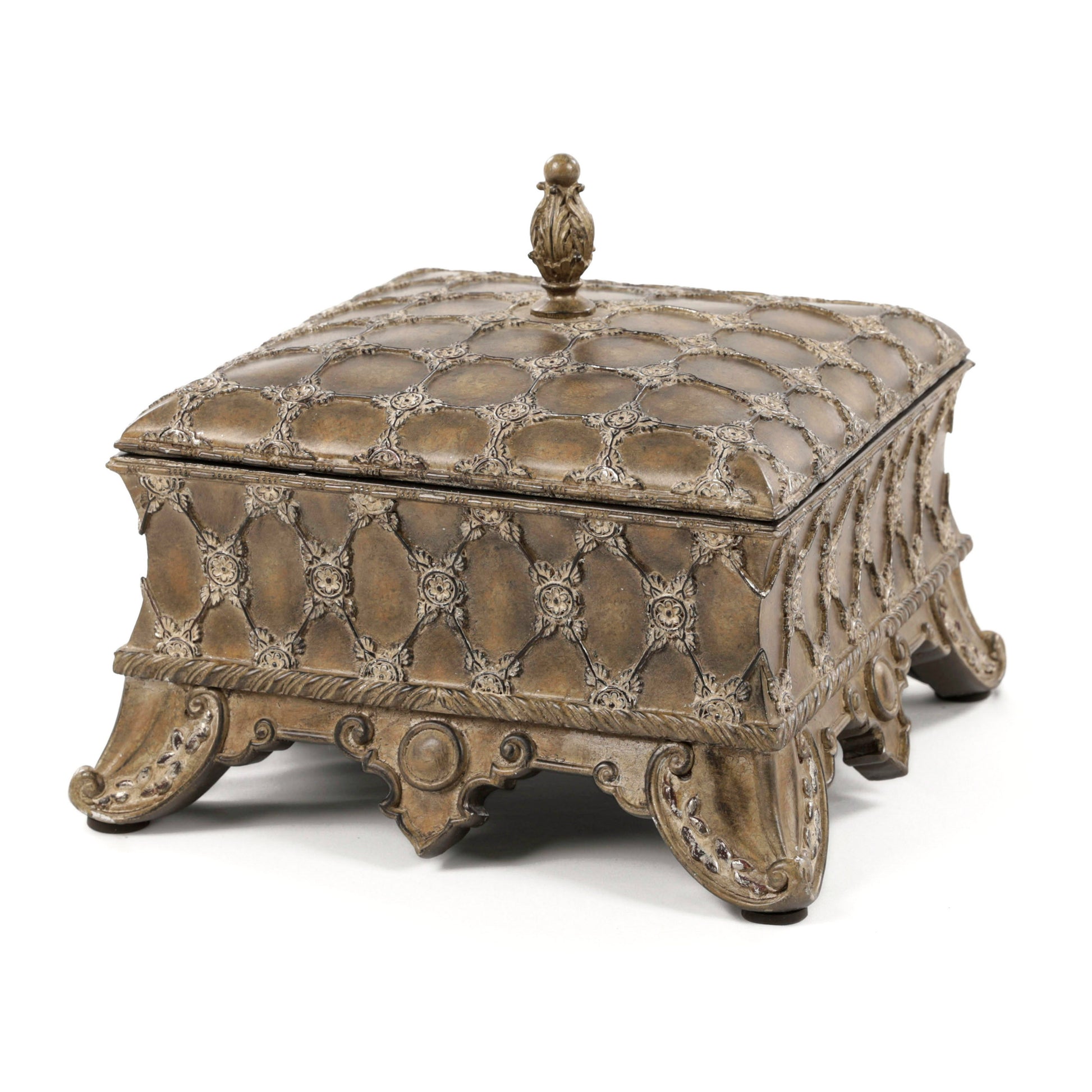 An elegant classic jewelry box, characterized by an antique ivory color with a soft silver glaze that gives it a luxurious appearance. It is adorned with etched engravings and rests on a decorative base that enhances its aesthetic. Its sides are decorated with traditional lattice motifs that add an attractive artistic touch. This box is an ideal choice for storing precious jewelry in a luxurious bedroom or as a sophisticated decorative piece that adds special elegance to living rooms.