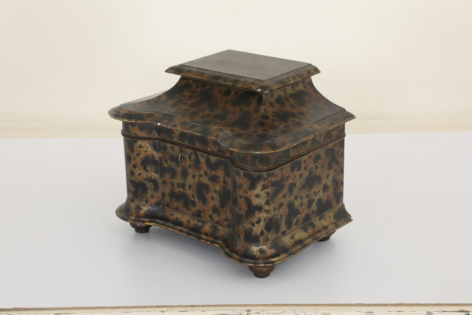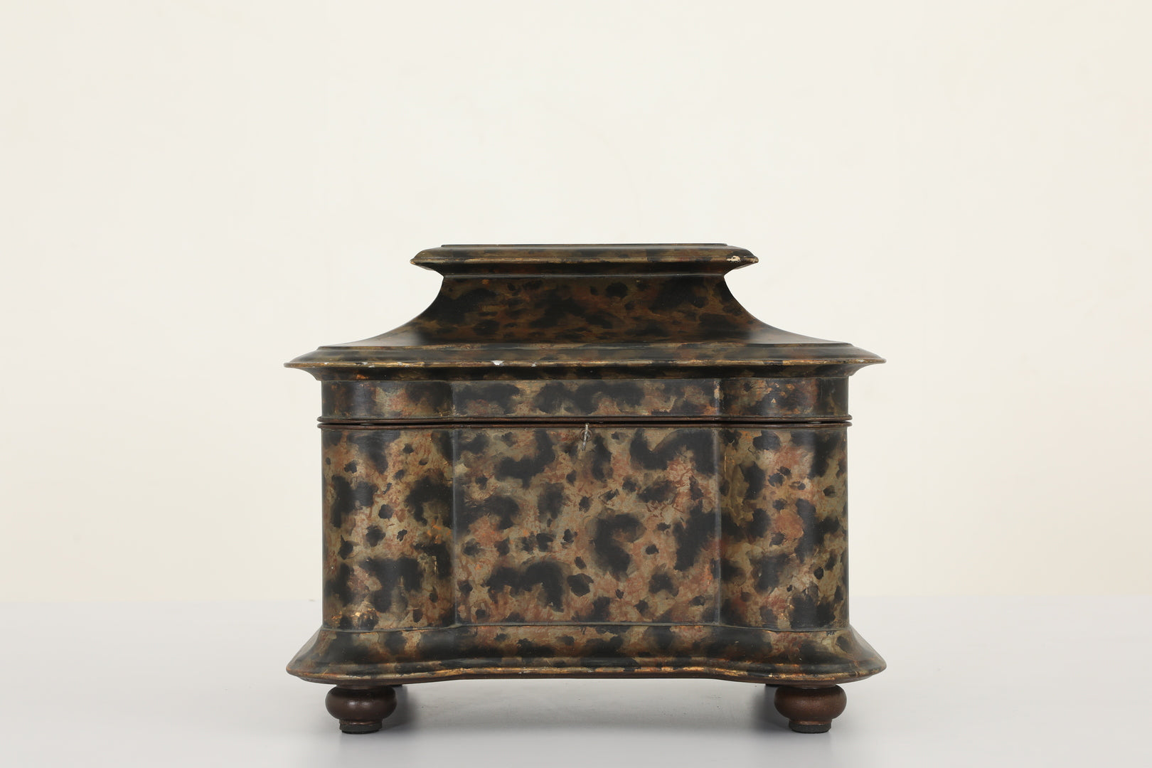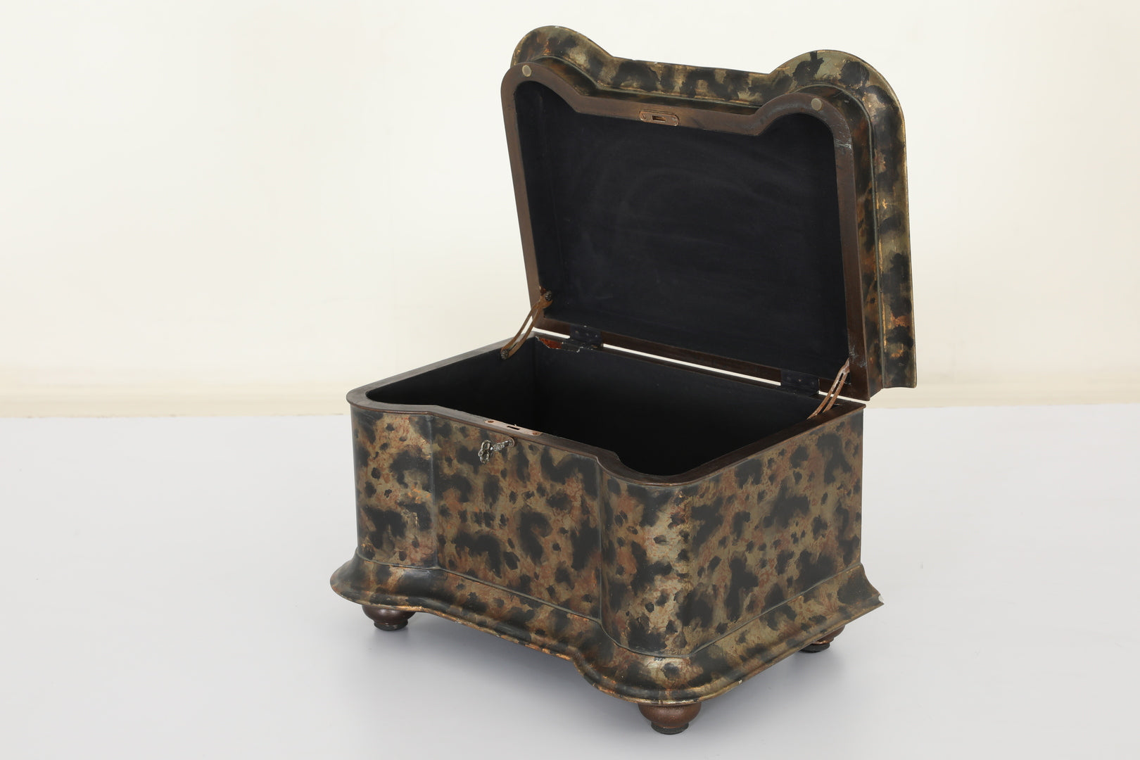 A premium wooden box with a sophisticated classic design, featuring a hand-applied finish that mimics the royal tortoiseshell pattern in dark, interlacing brown tones, giving it an elegant vintage character. The box rests on four small circular legs that add balance and refinement to the design. The tiered lid stands out with its fluid lines, enhancing its grand presence. This piece is a distinctive decorative addition that combines craftsmanship with classic elegance, perfect for keeping collectibles or enriching high-end spaces.