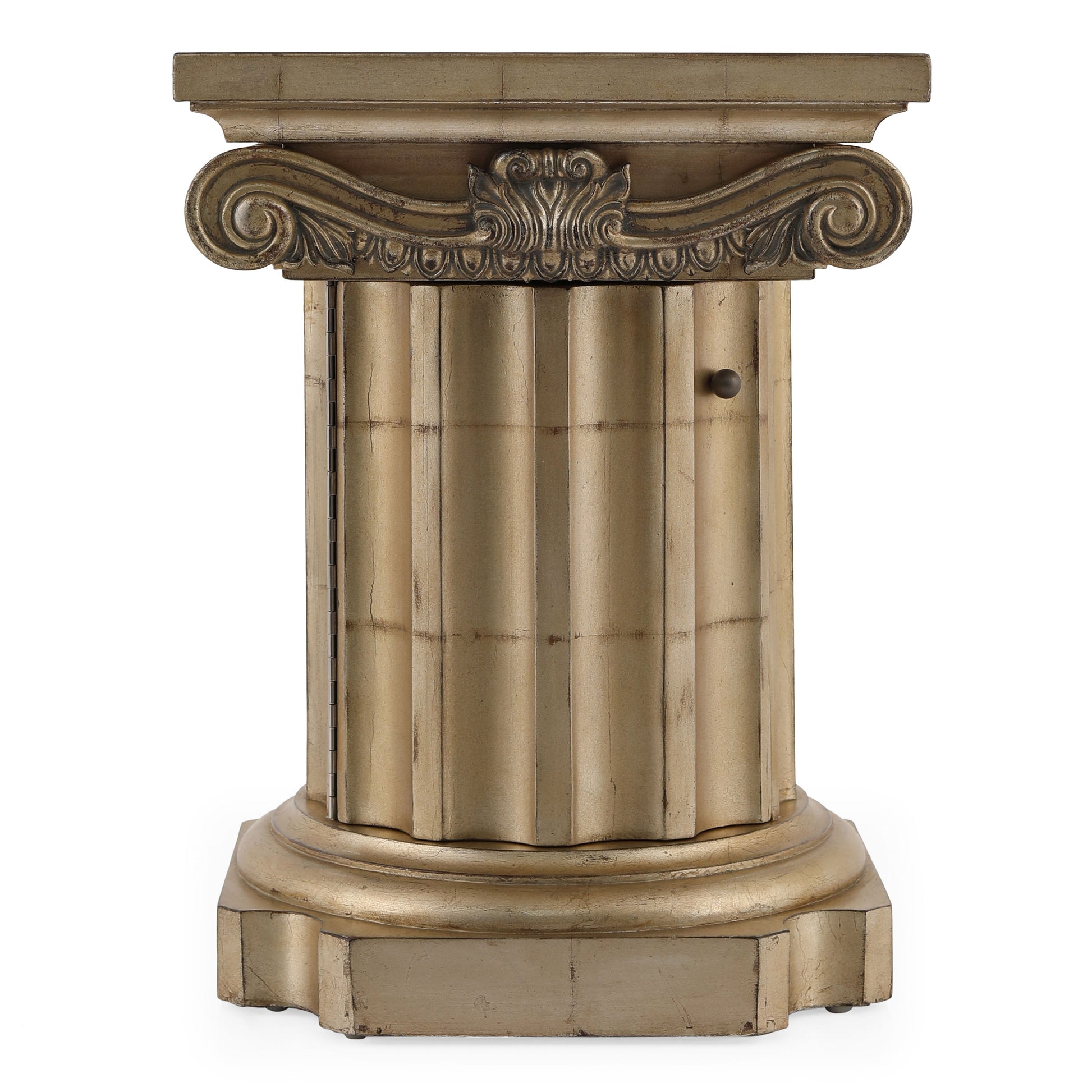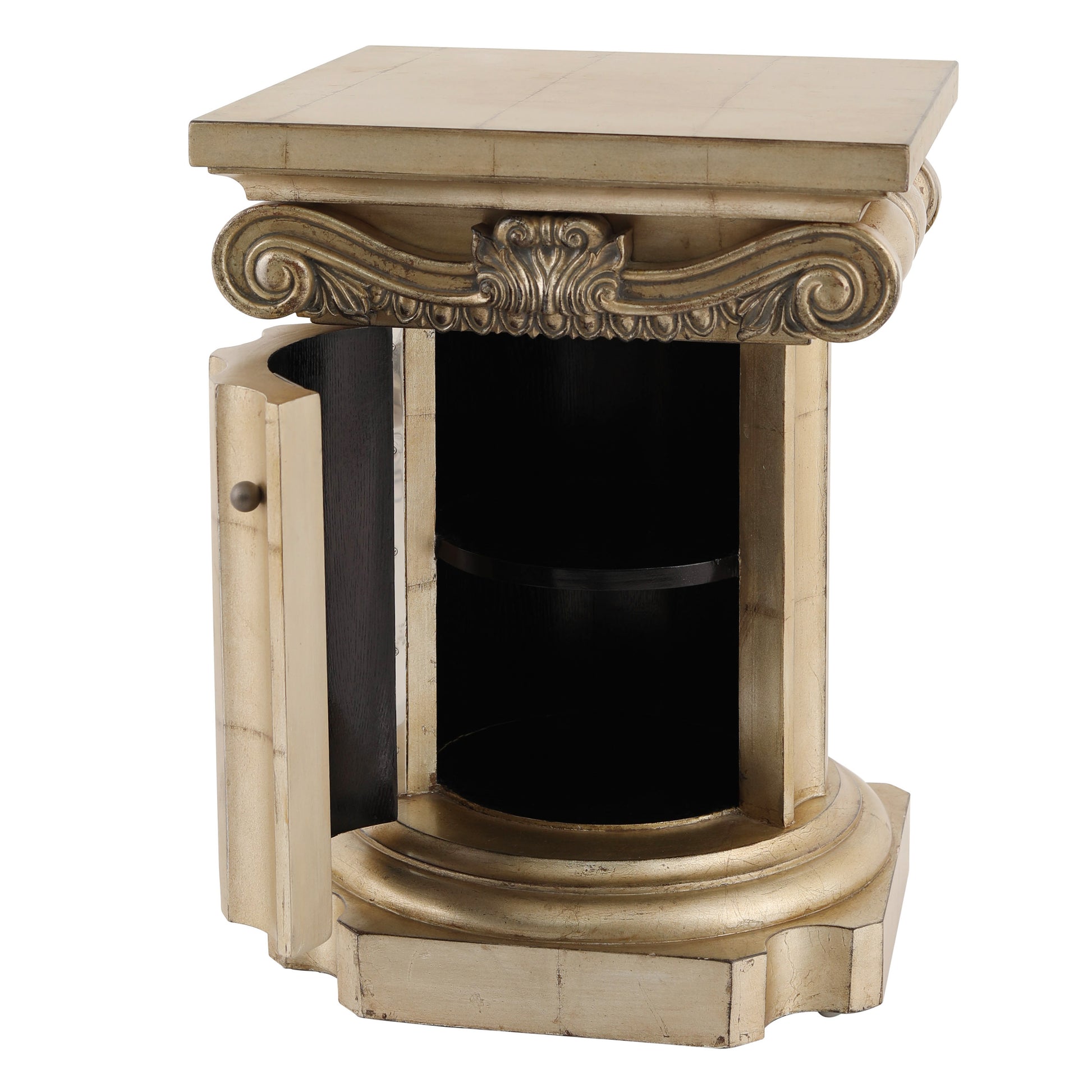 A classic Roman-style wooden display pedestal, inspired by ancient Roman columns. It features a vertical design with prominent decorative details at the base and crown, finished in an antique silver color with a crackle effect that lends it a sophisticated archaeological character. This pedestal is an ideal piece for displaying statues or antiques, adding a luxurious historical touch to any setting.