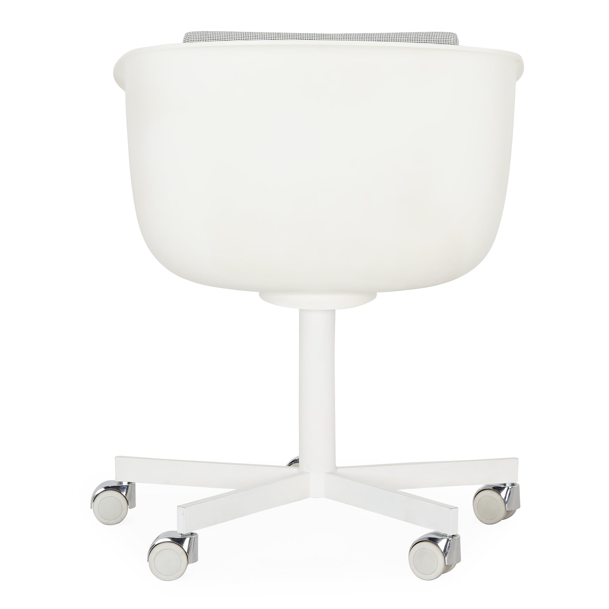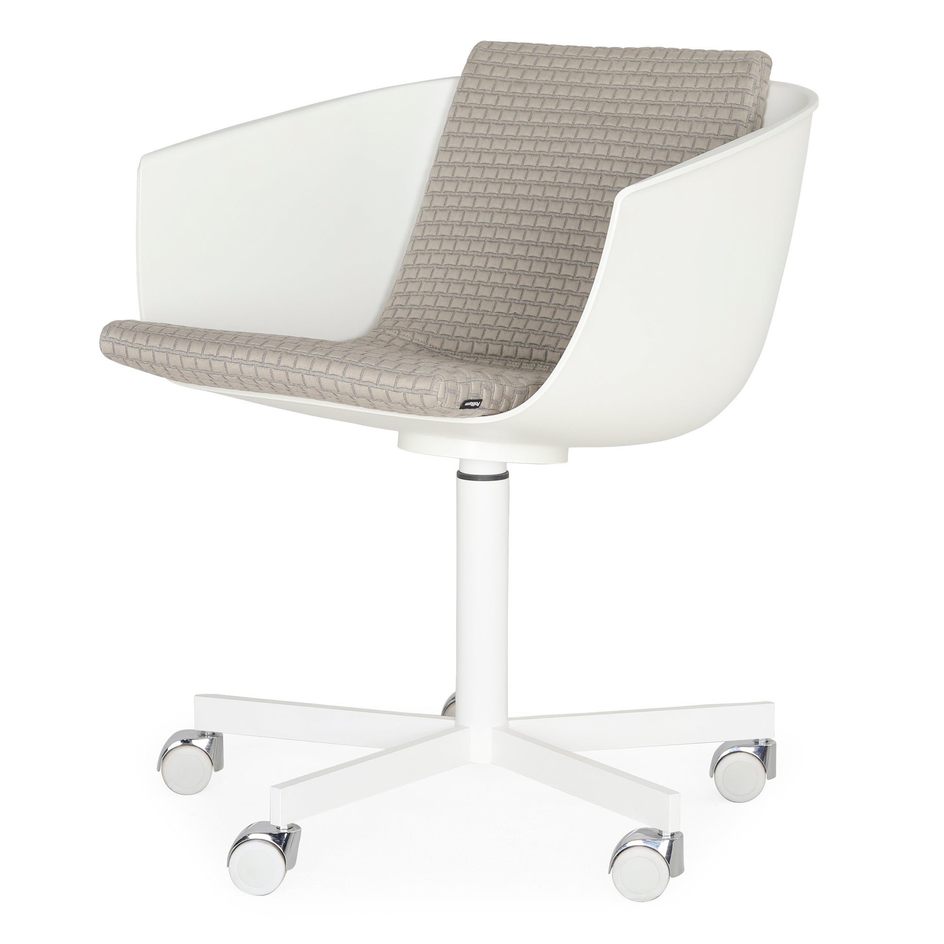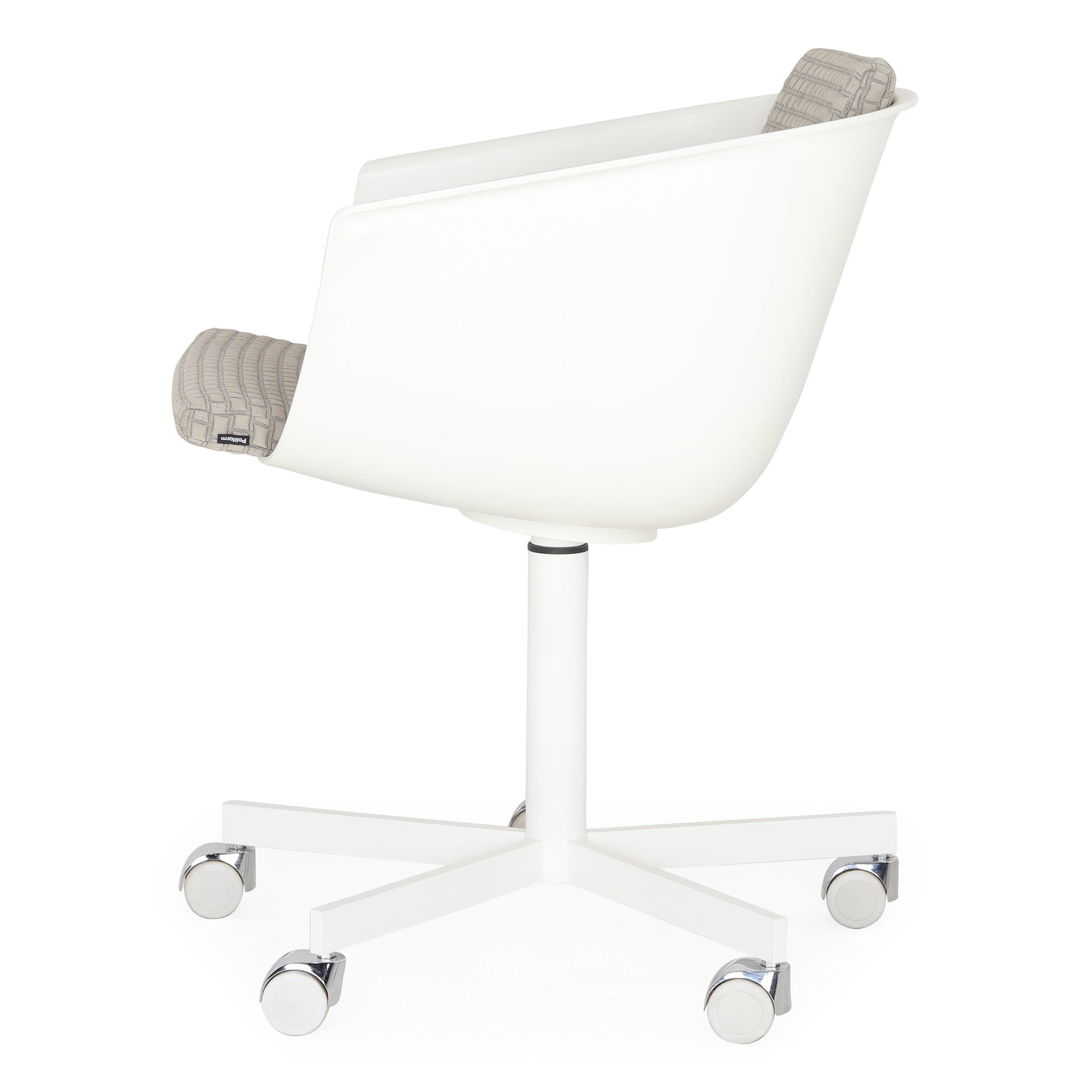 The idea of the "shell" inspires the shape of the polyurethane body designed by Carlo Colombo: winded and essential lines, with the possibility of using removable cushions for the seat and back. Revolving base in varnished metal, or structure in