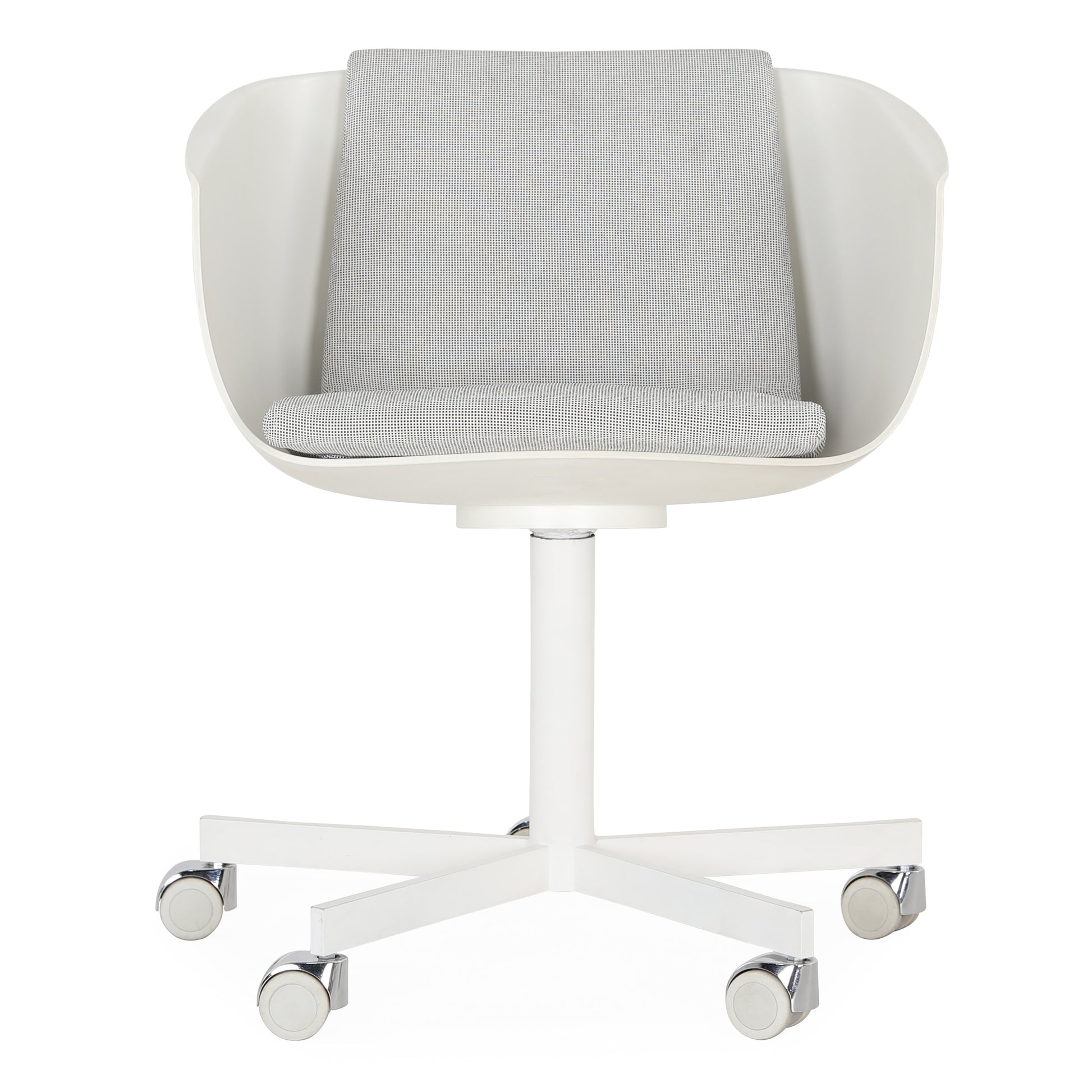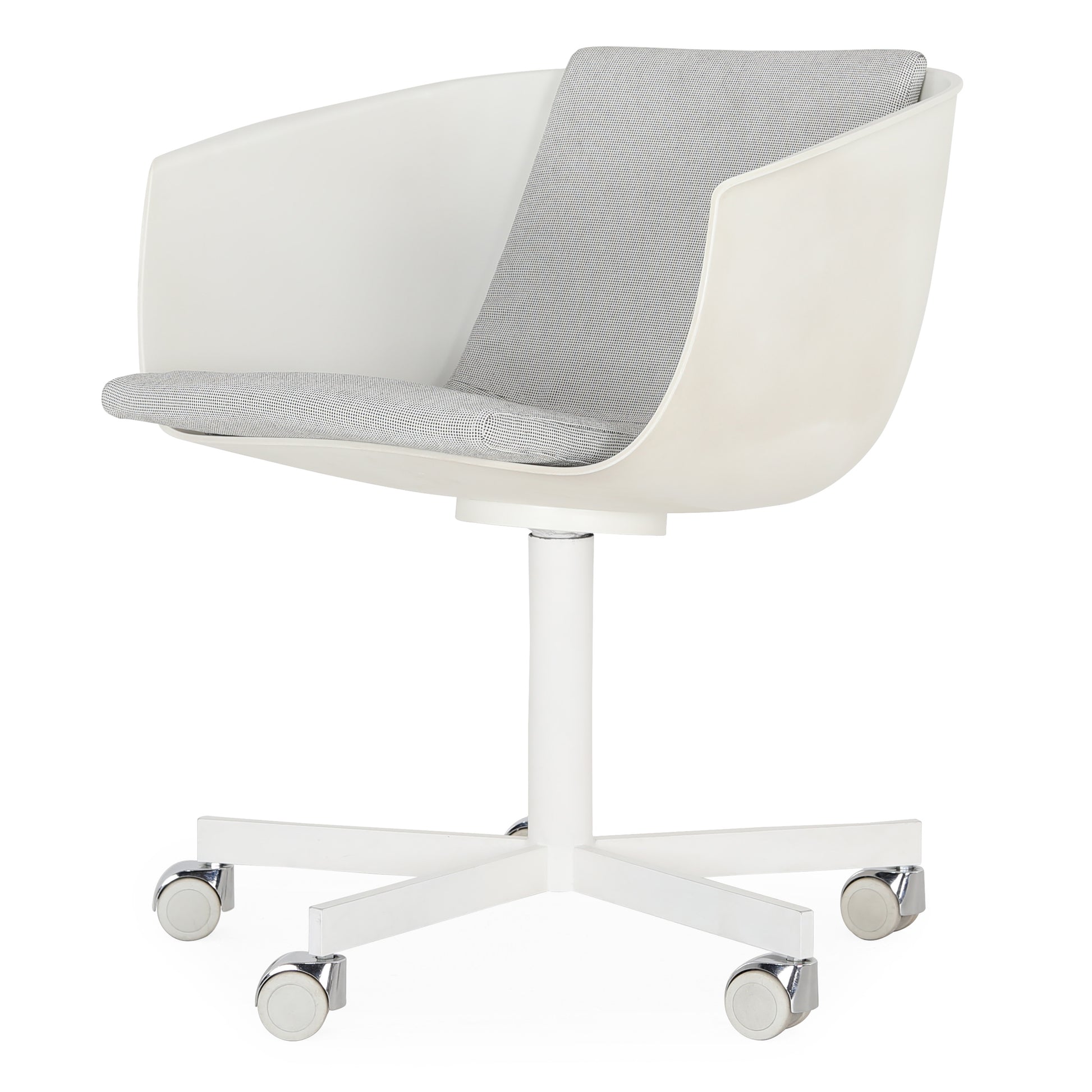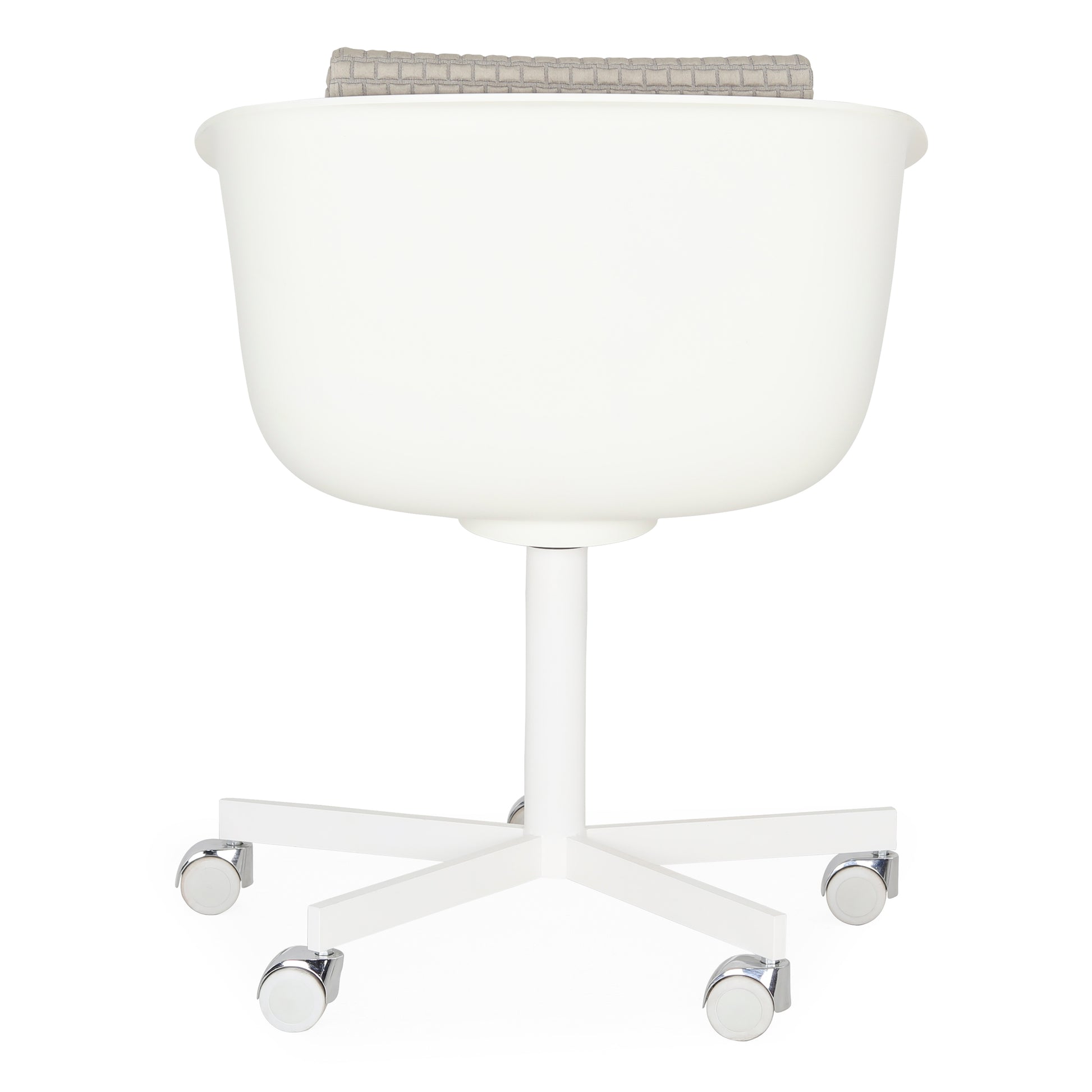 The idea of the "shell" inspires the shape of the polyurethane body designed by Carlo Colombo: winded and essential lines, with the possibility of using removable cushions for the seat and back. Revolving base in varnished metal, or structure in