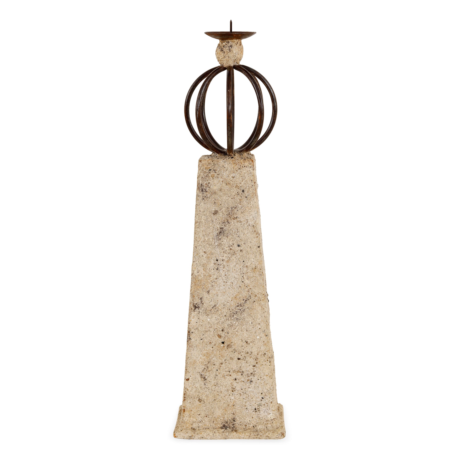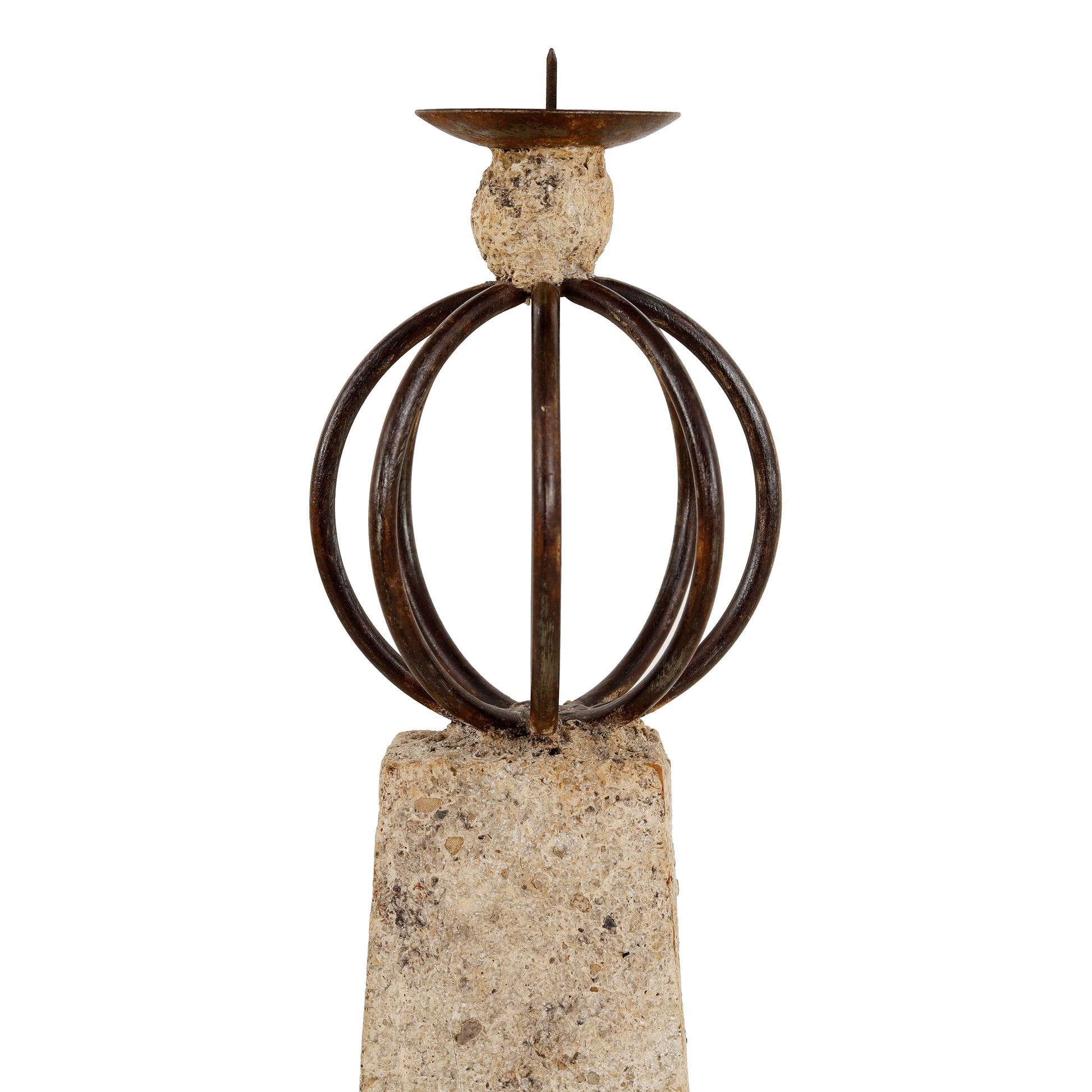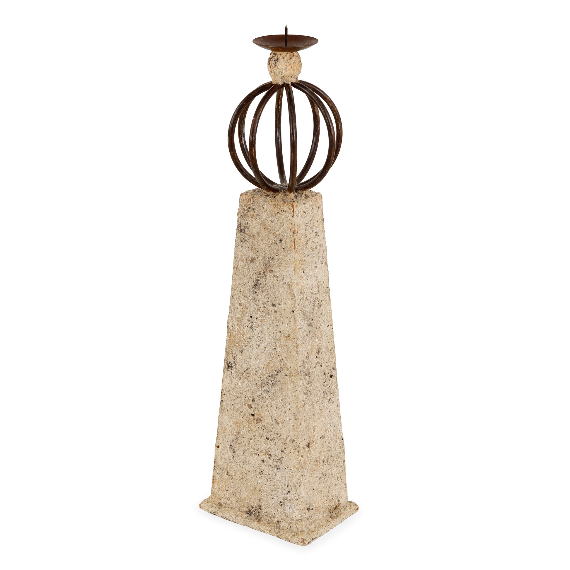 A luxurious candle holder with a unique design that makes it a vintage-style decorative piece combining simplicity and luxury. It features a conical base made of natural white stone, providing stability and an attractive aesthetic appearance. It is topped with a spherical metal piece in an antique copper color that adds a sense of heritage. This candle holder is a distinctive addition to various decor styles, with a traditional touch that blends with a modern spirit at the same time.
