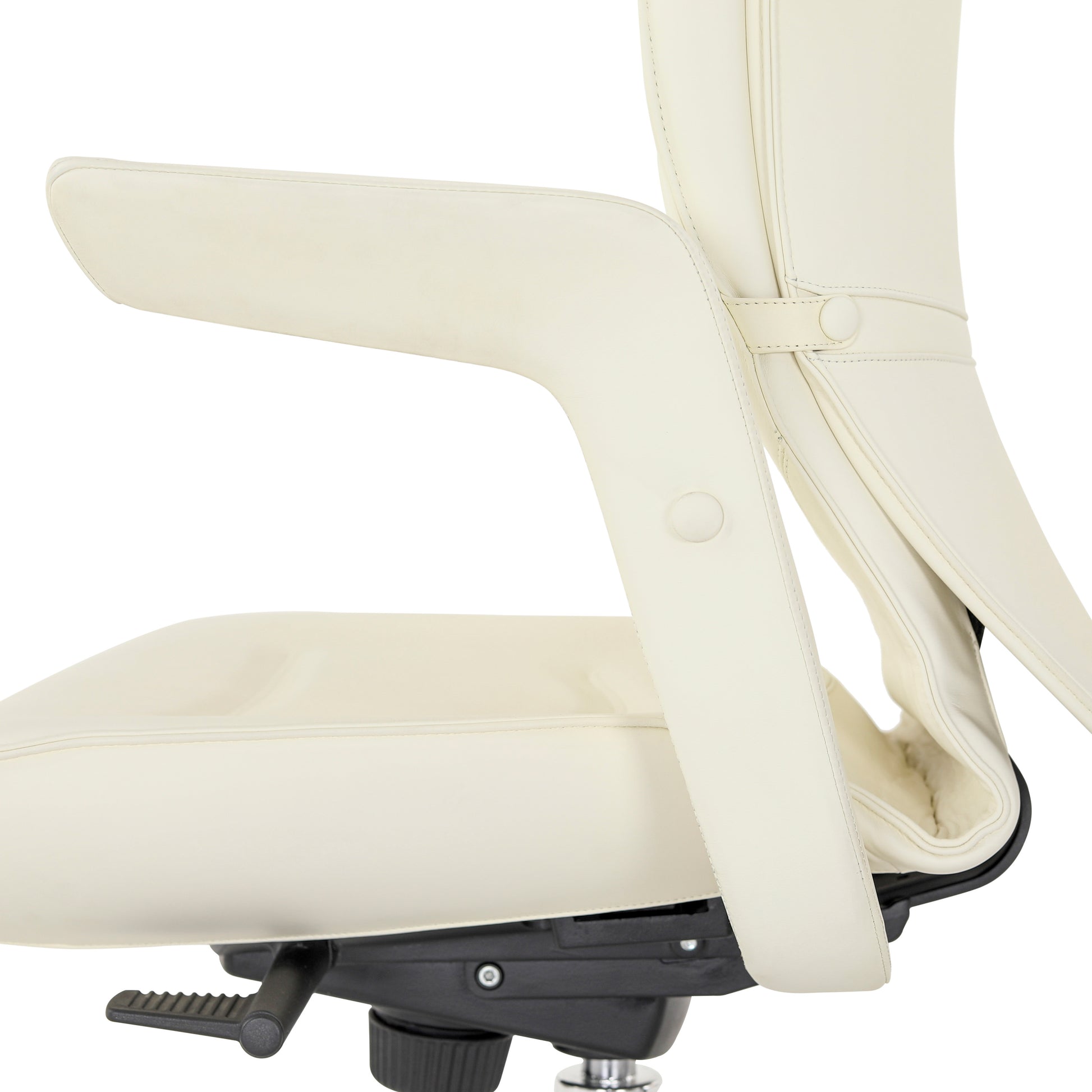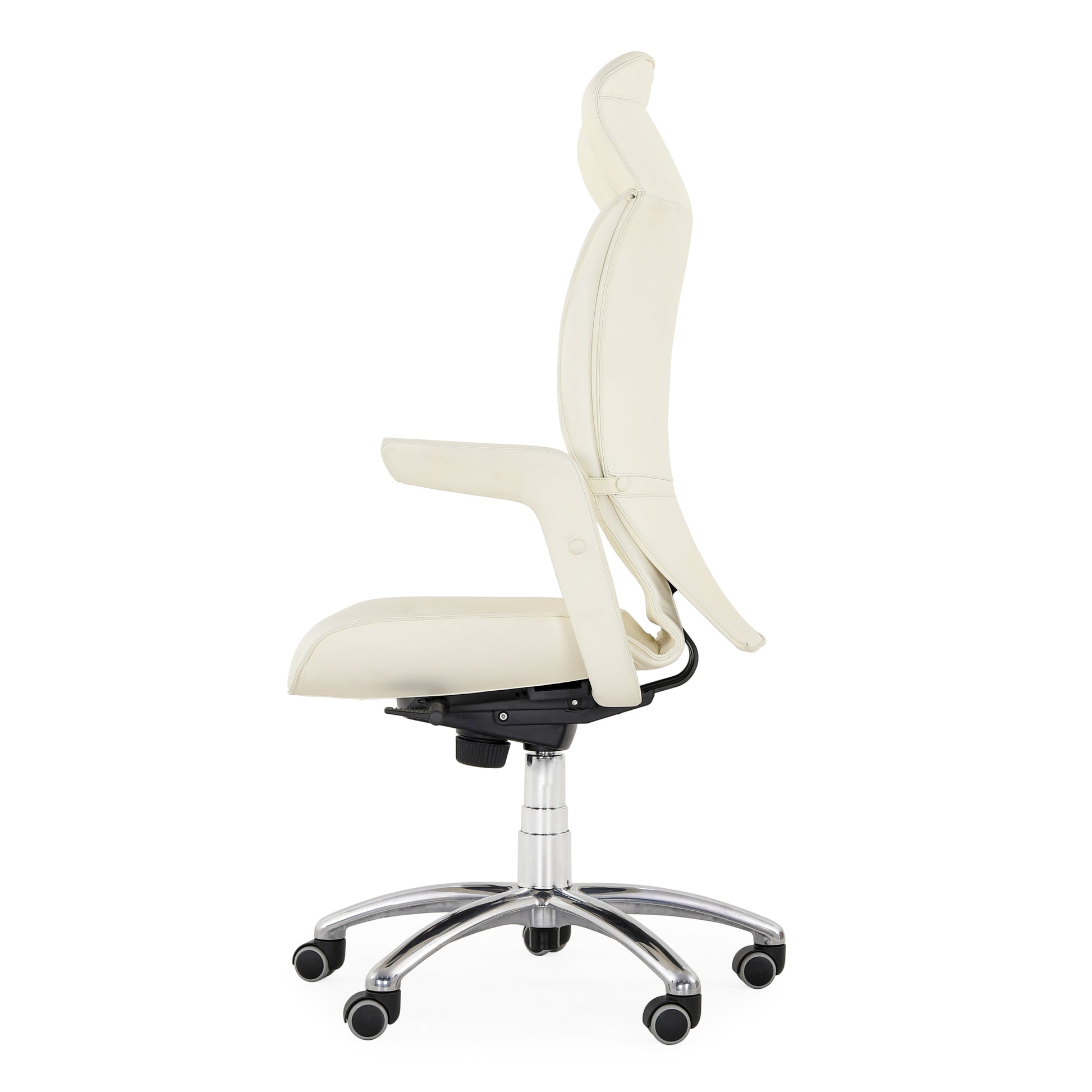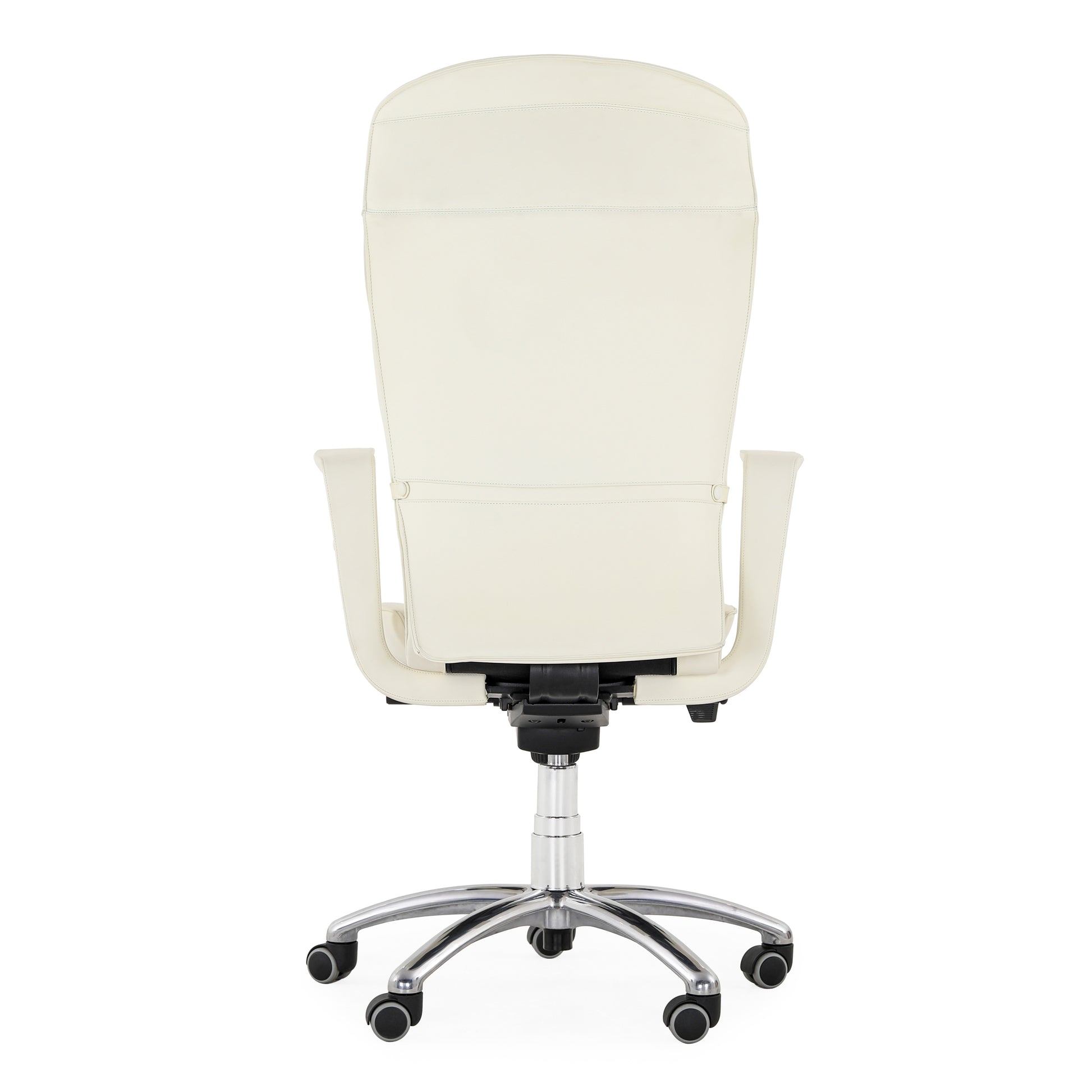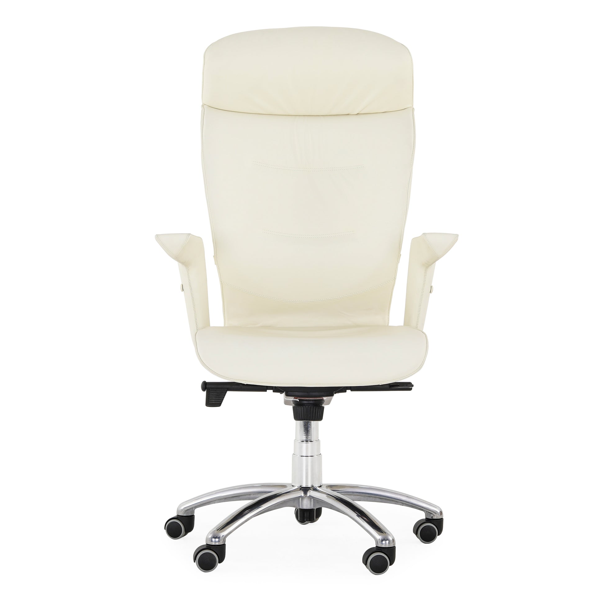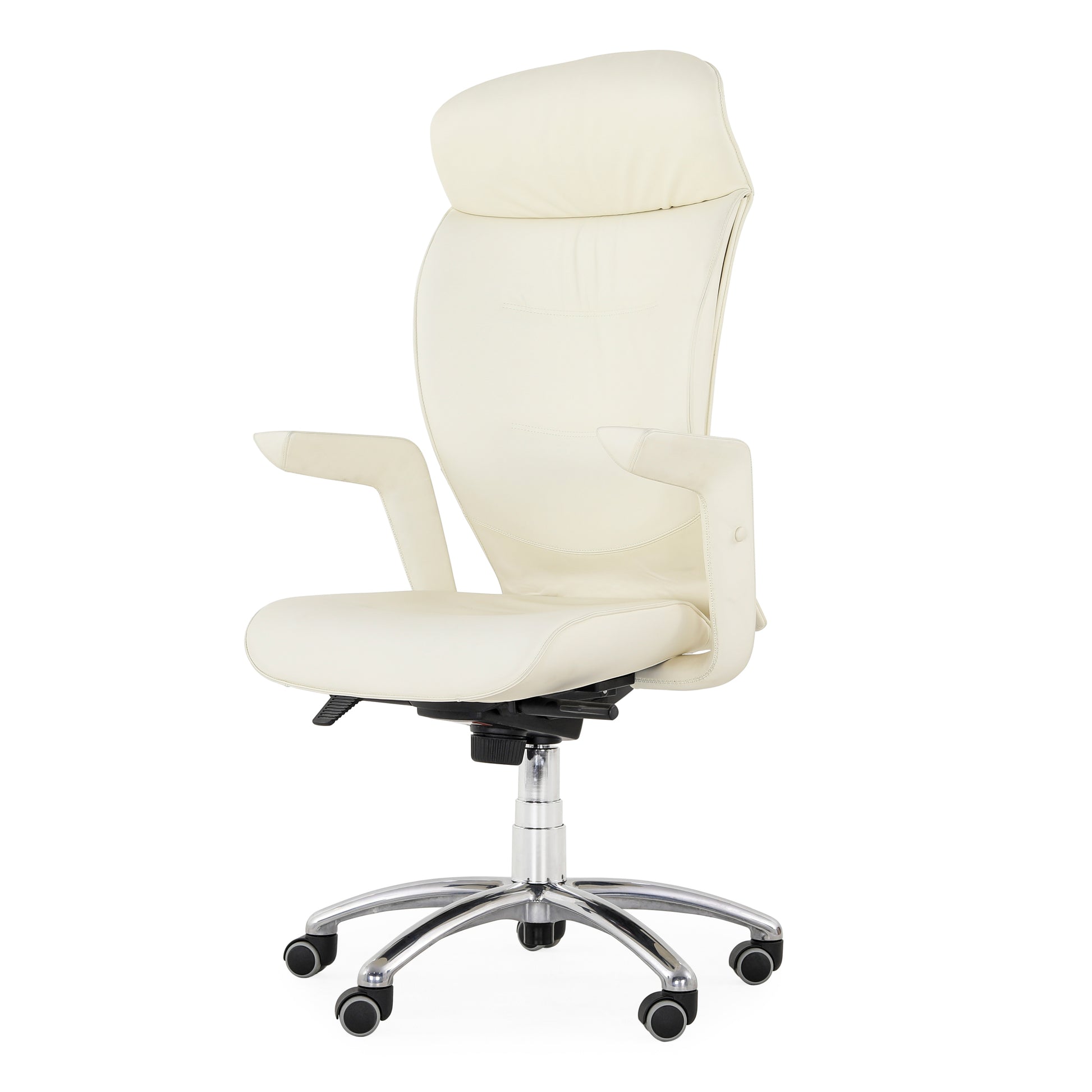 Poltrona Frau Chancellor Executive Armchair. Egonomic Poltrona Frau office chair, Brief Executive model, with armrests designed by Emilio Ambasz Structure in glossy chrome-plated steel, upholstery in foam polyurethane obtained from a mould Bottom with five legs in aluminium Soft, swivelling self-braking wheels 360-degree rotation, coated in white Frau leather Armrests with hand-stitched coating Ergonomics and formal refinement characterise the Brief style. Measurements: 70 x 66 cm Adjustable height, adjustable backrest The leather has no holes, tears or flaws of note.