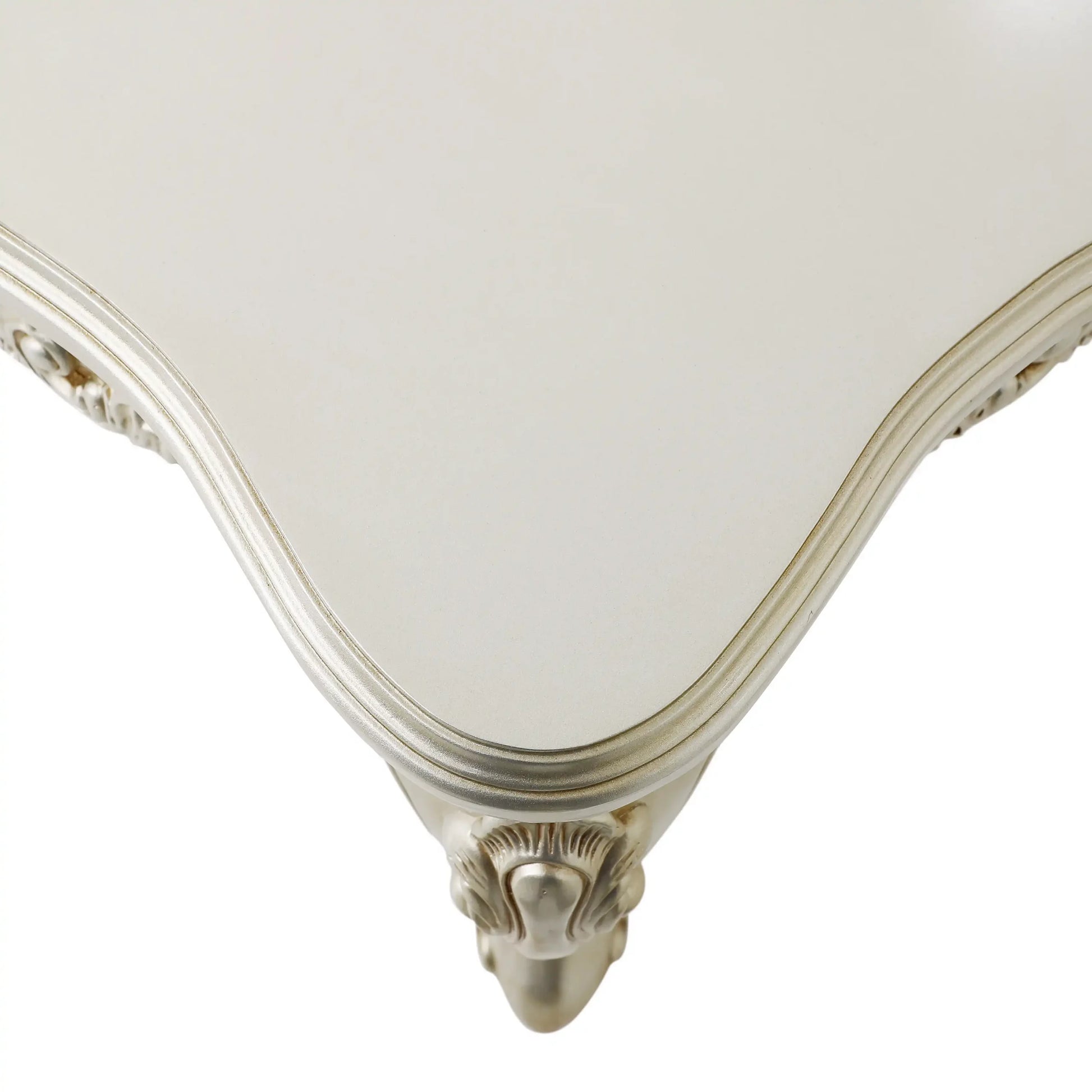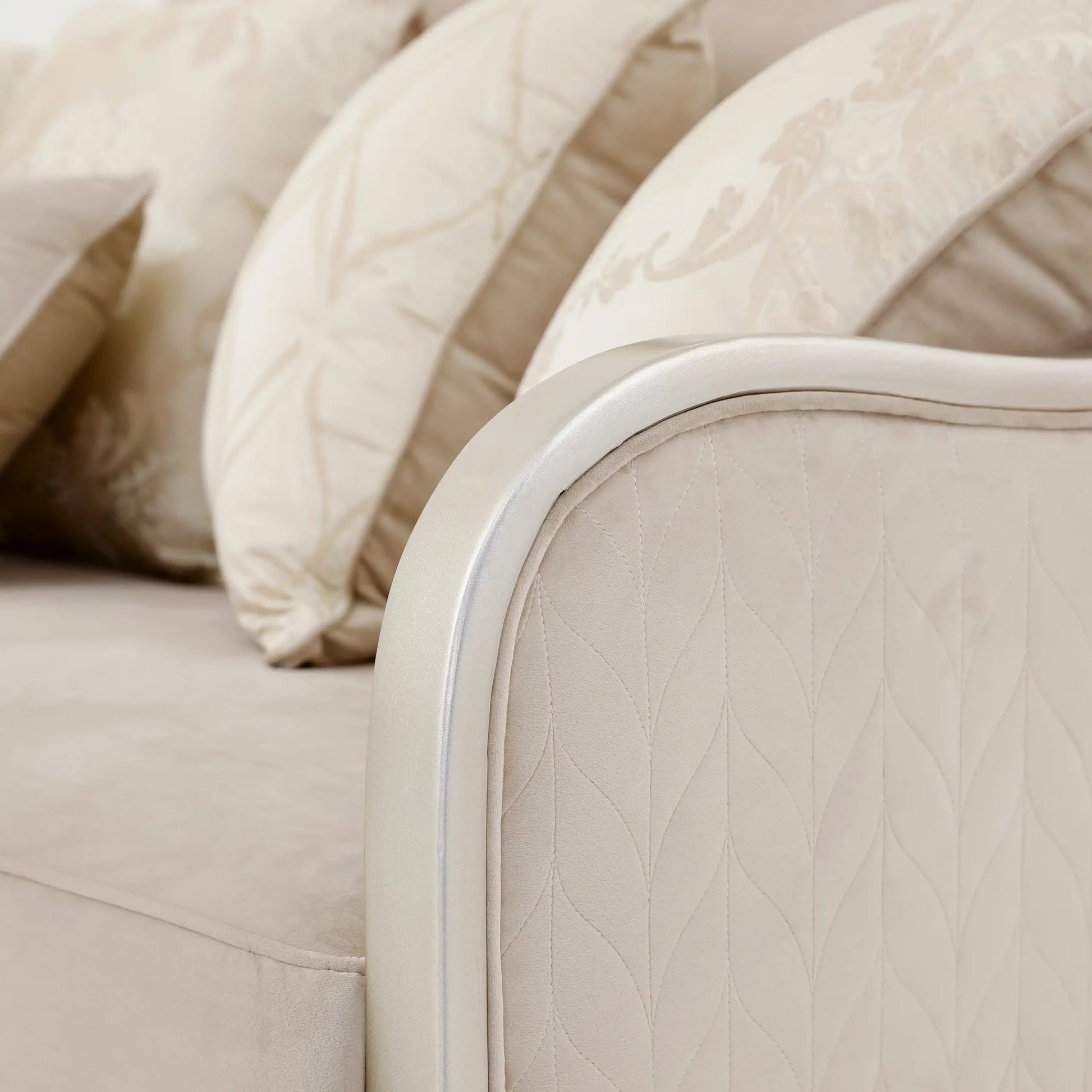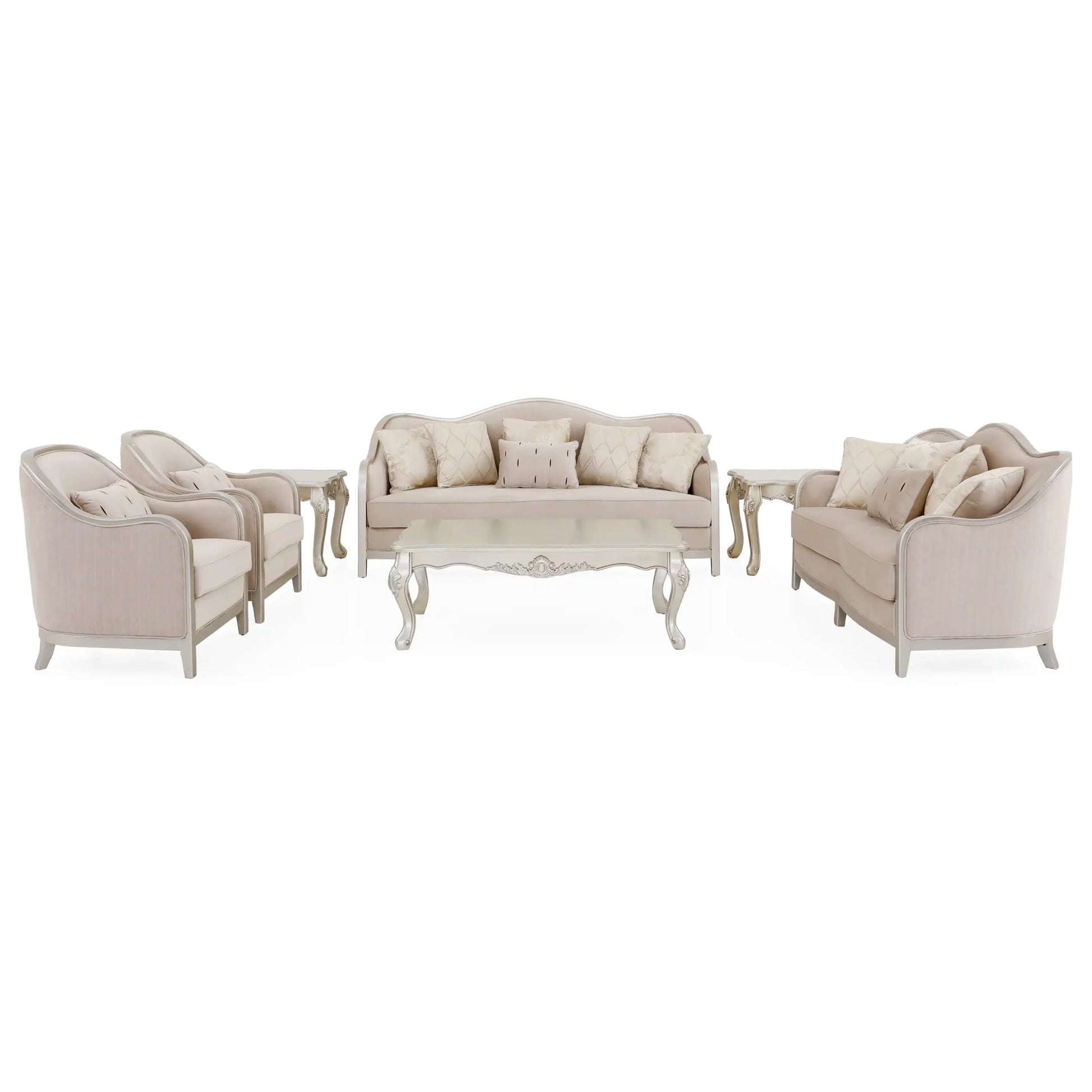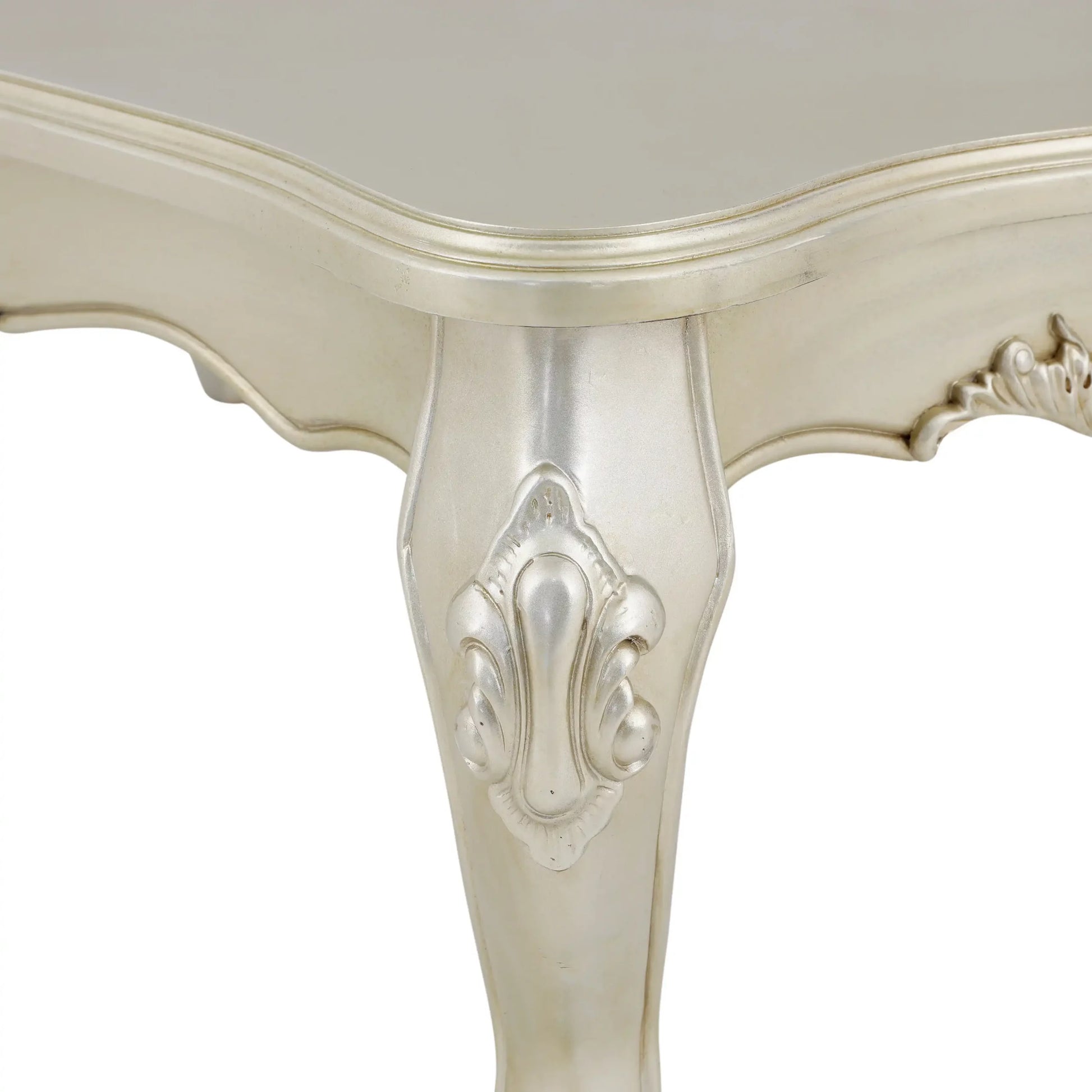 This Cleopatra Wood Sofa Set is masterpiece that can perfectly fit in the living room of every house and hotel. All the pieces of Cleopatra collection entirely handmade by master craftsmen and are characterized by the use of high quality wood solid materials and the meticulous care of all the slightest details and 100% hand carved also handcrafted.Set includes a wooden sofa, a loveseat and two lounge chairs with silver leaf finish. Satin upholstery. Quilted satin on exterior areas. A carved wooden coffee table and two side tables with silver leaf finish also included in this master set.