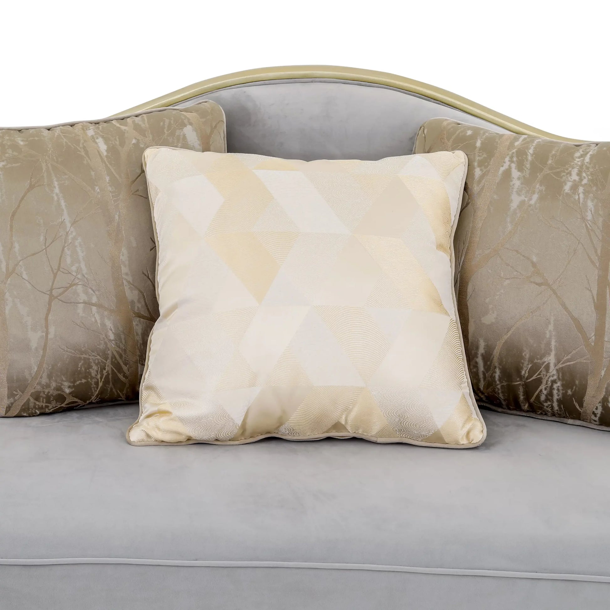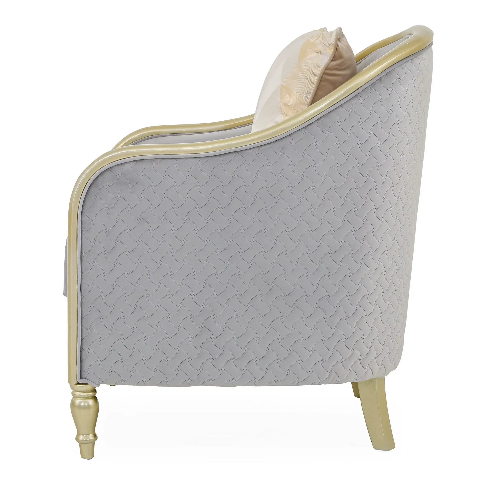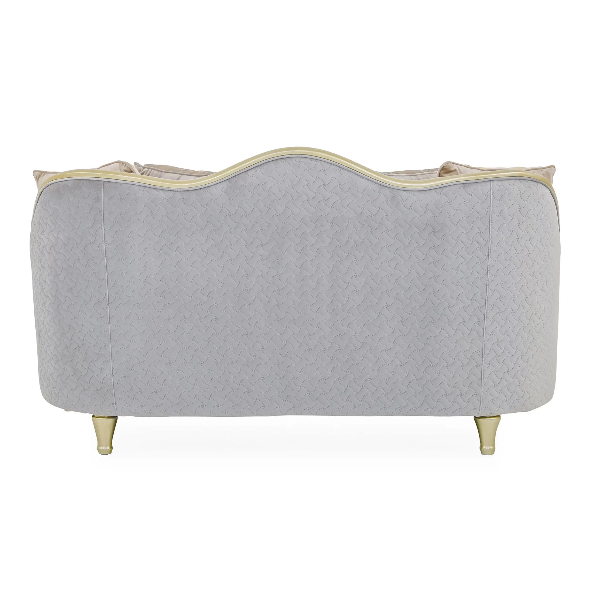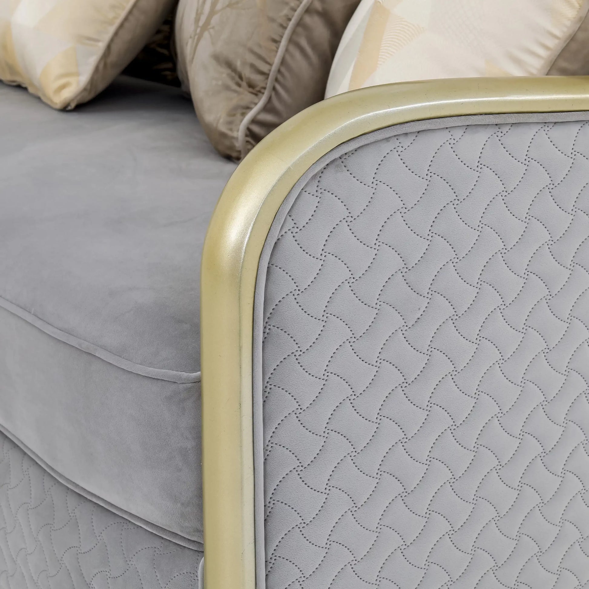 This Elsa wood sofa set is a masterpiece that can perfectly fit in the living room of every house and hotel. All the pieces of the Elsa collection are entirely hand-made by master craftsmen and are characterized by the use of high-quality wood solid materials and the meticulous care of all the slightest details and 100% hand-carved also handcrafted.Set includes a wooden sofa a loveseat and two lounge chairs with antique gold finish. Upholstery: pastel quilted blue velvet on external areas. A carved wooden coffee table and two side tables with an antique gold finish are also included in this master set.