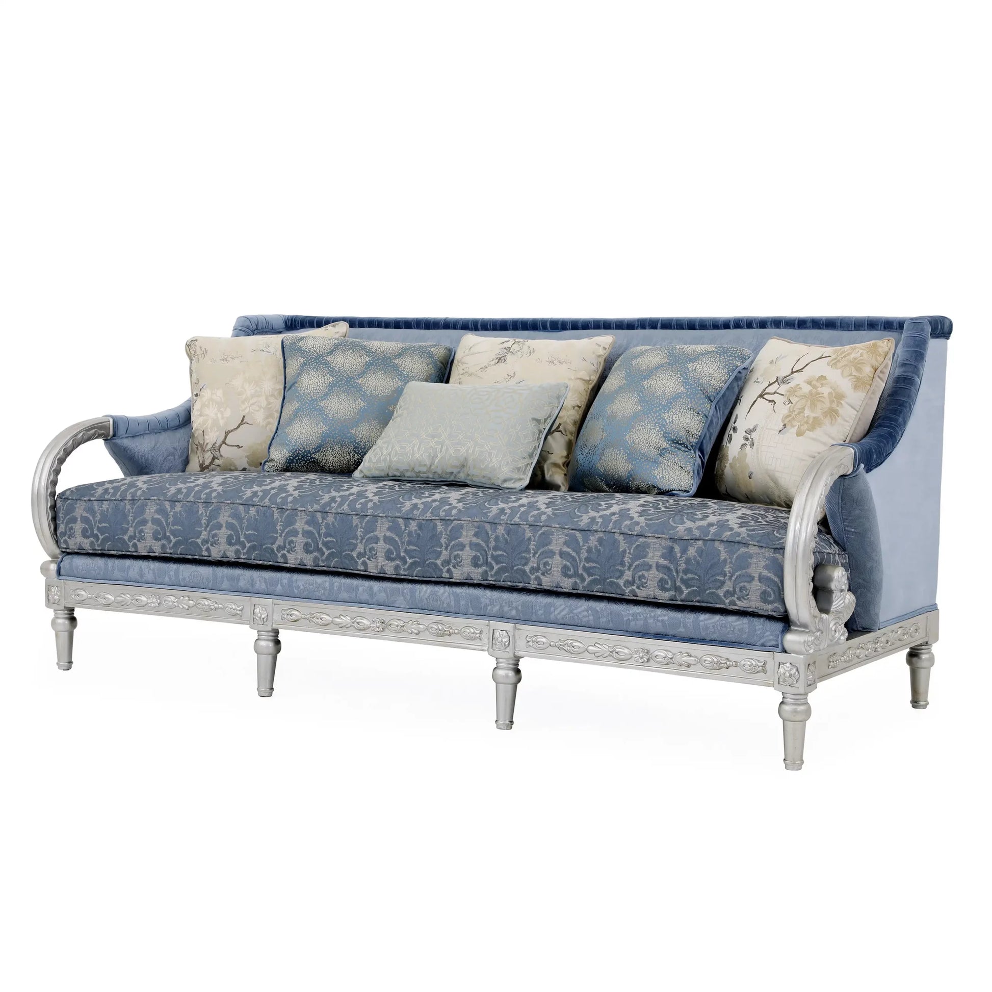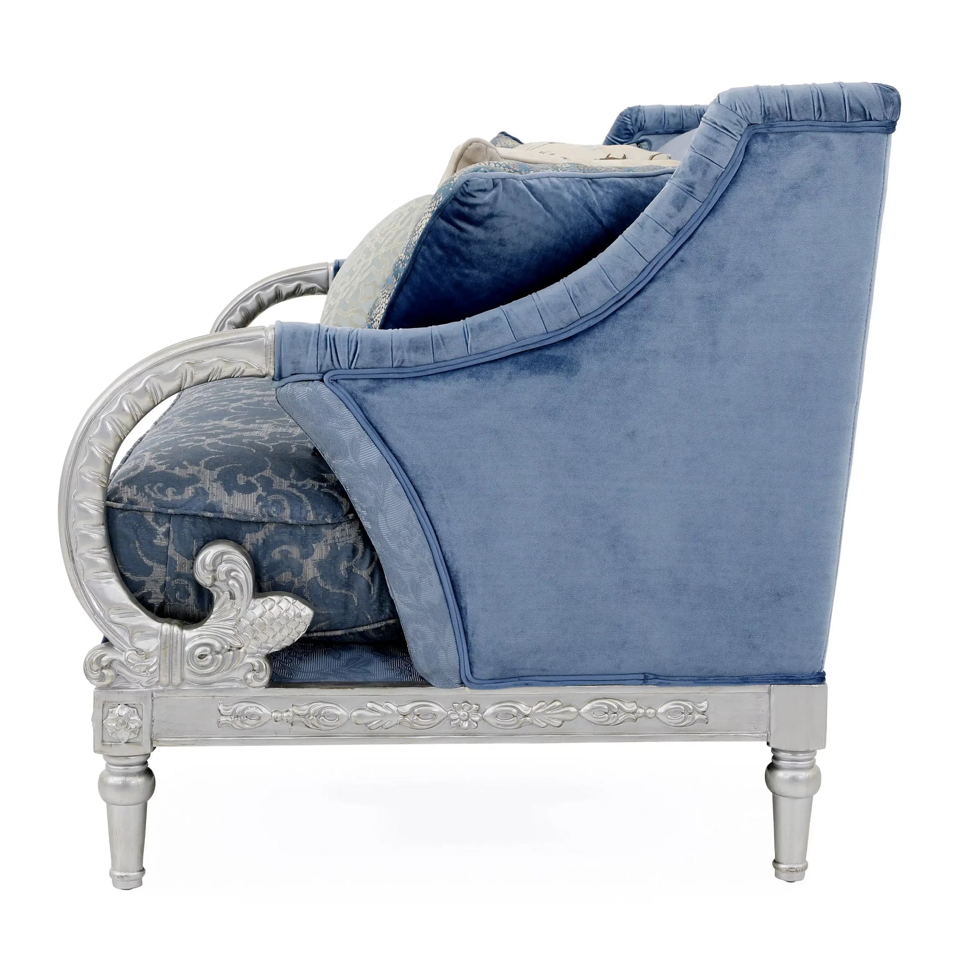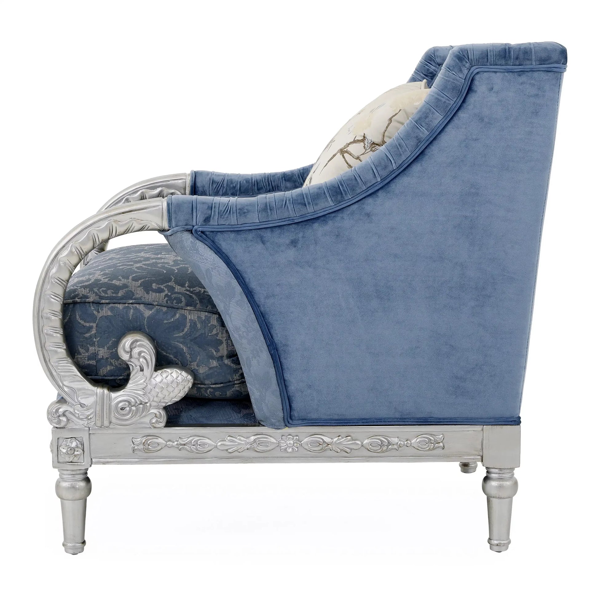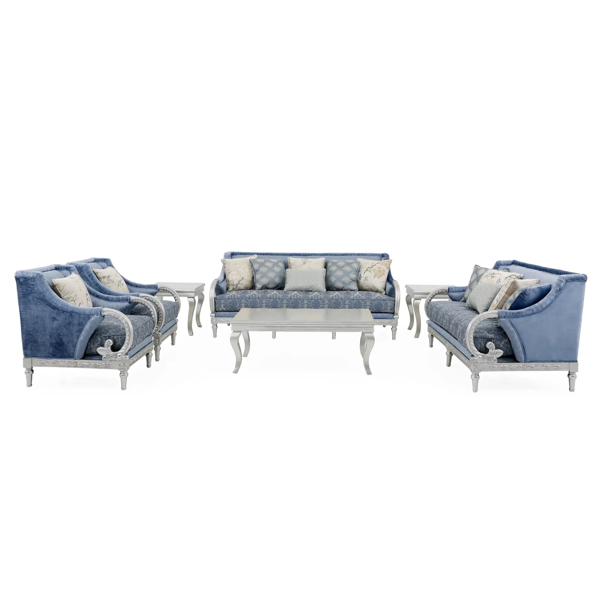 This Fluer de lis wood sofa set is a masterpiece that can perfectly fit in the living room of every house and hotel. All the pieces of the fluer de lis collection are entirely hand-made by master craftsmen and are characterized by the use of high-quality wood solid materials and the meticulous care of all the slightest details and 100% hand-carved also handcrafted.Set includes a wooden sofa, a loveseat, and two lounge chairs with an antique silver finish. Fluer de lis carving on curved arms. Upholstery blue floral velvet on the seat and plain blue velvet on the rest of the area. A carved wooden coffee table and two side tables with an antique silver finish are also included in this master set.