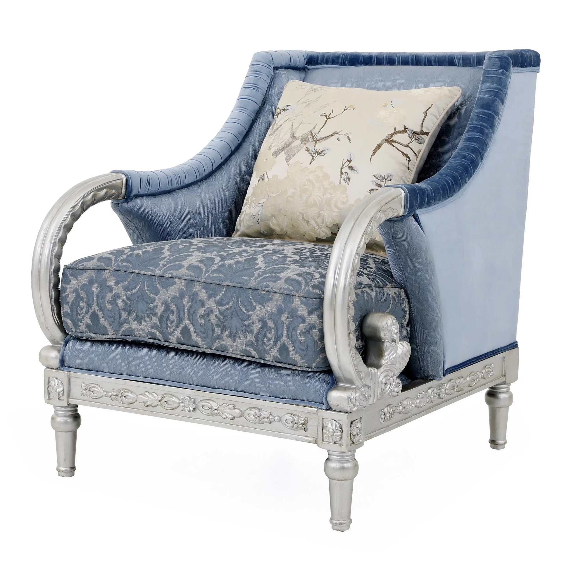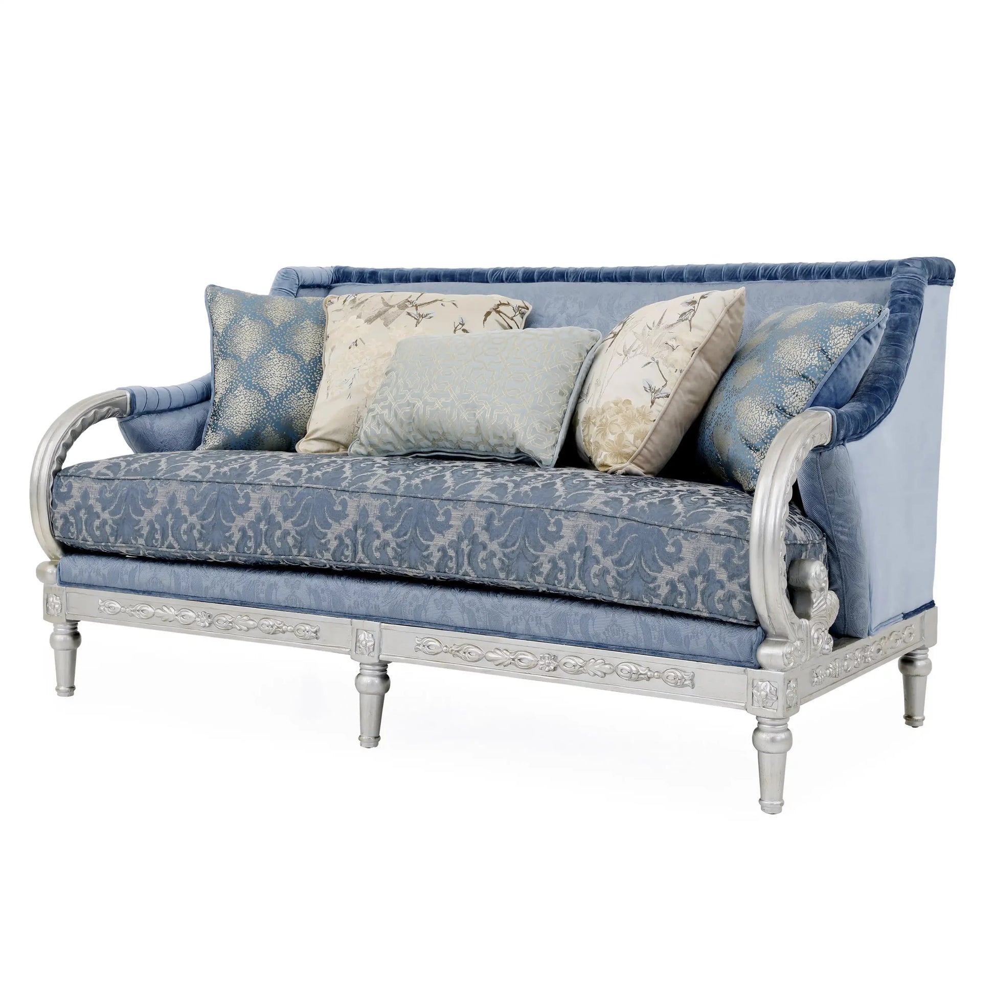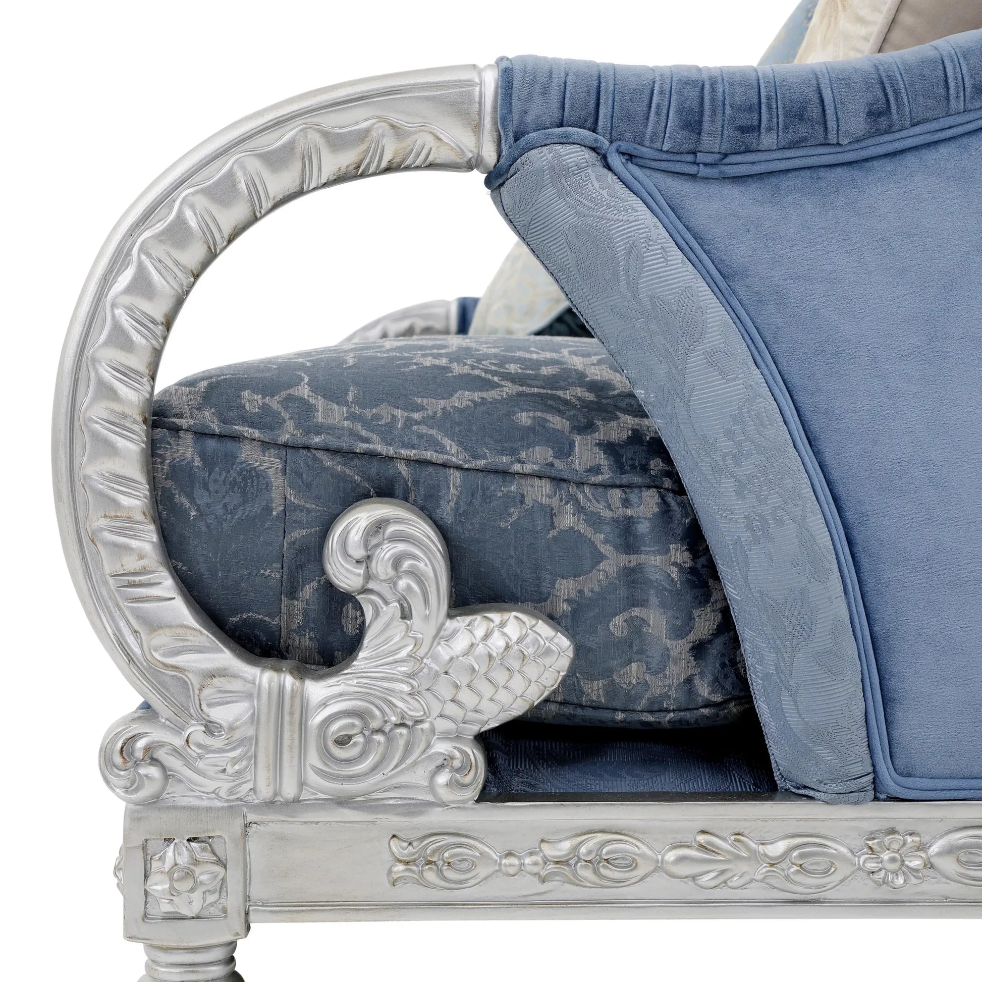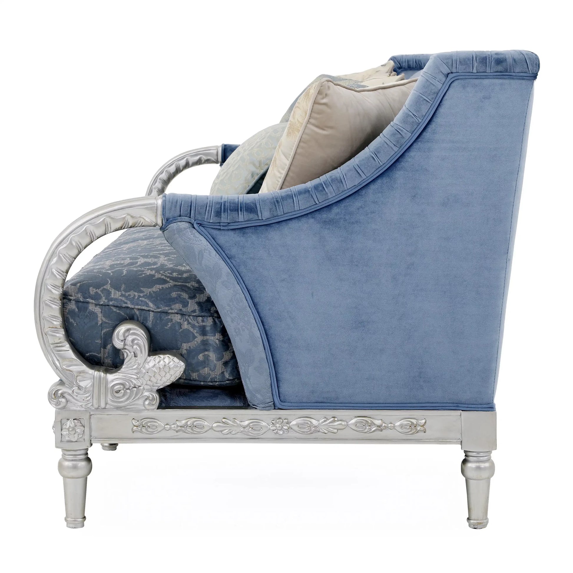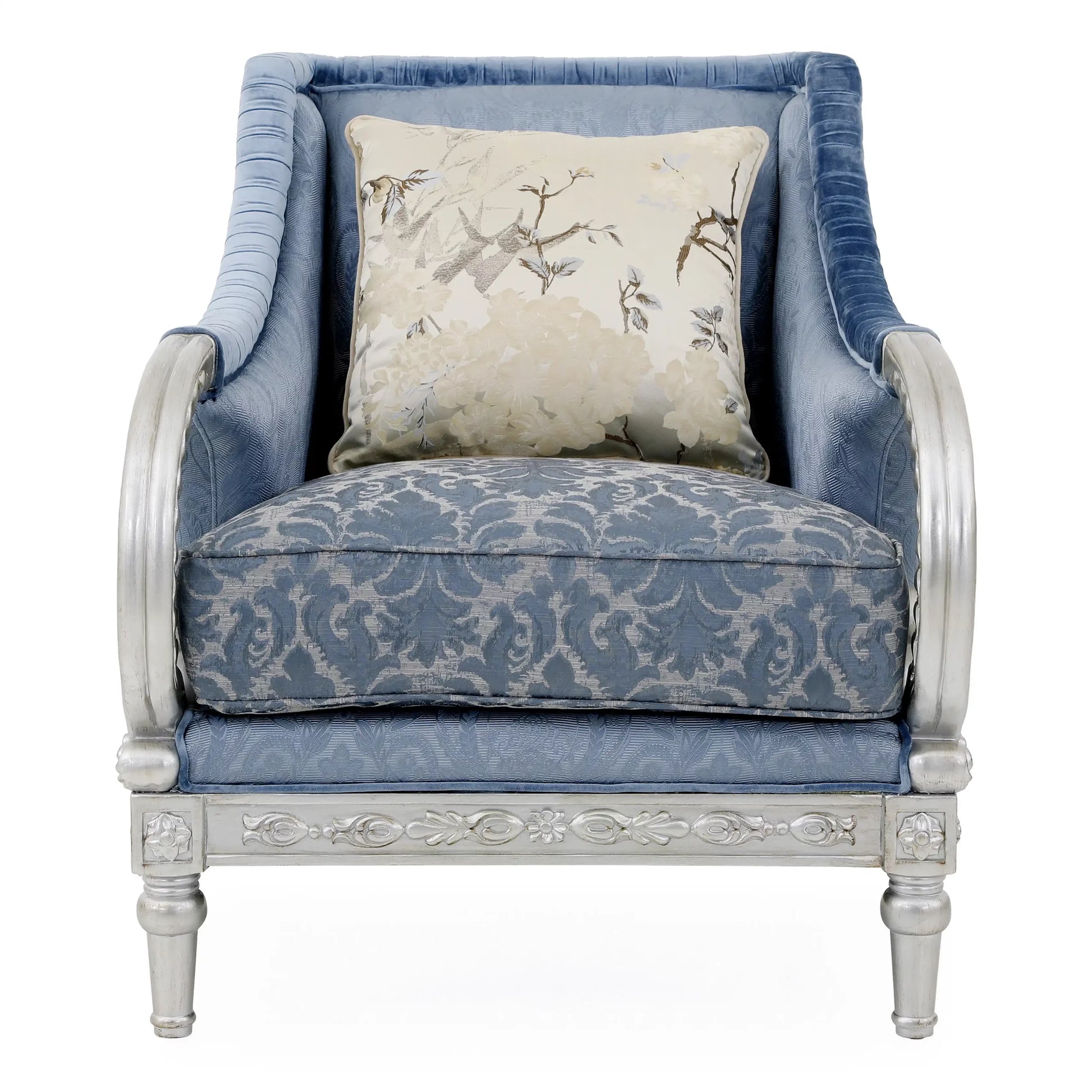 This Fluer de lis wood sofa set is a masterpiece that can perfectly fit in the living room of every house and hotel. All the pieces of the fluer de lis collection are entirely hand-made by master craftsmen and are characterized by the use of high-quality wood solid materials and the meticulous care of all the slightest details and 100% hand-carved also handcrafted.Set includes a wooden sofa, a loveseat, and two lounge chairs with an antique silver finish. Fluer de lis carving on curved arms. Upholstery blue floral velvet on the seat and plain blue velvet on the rest of the area. A carved wooden coffee table and two side tables with an antique silver finish are also included in this master set.