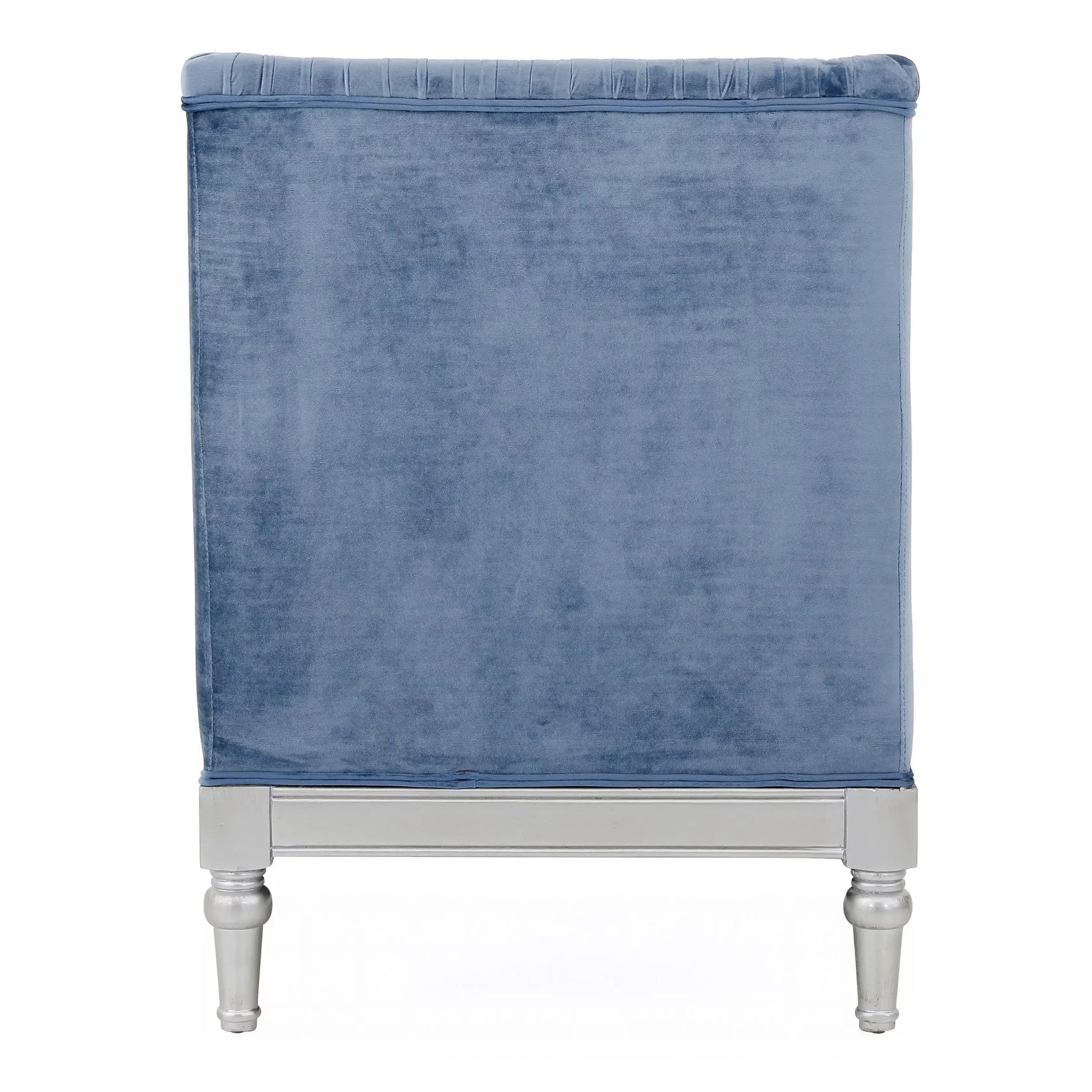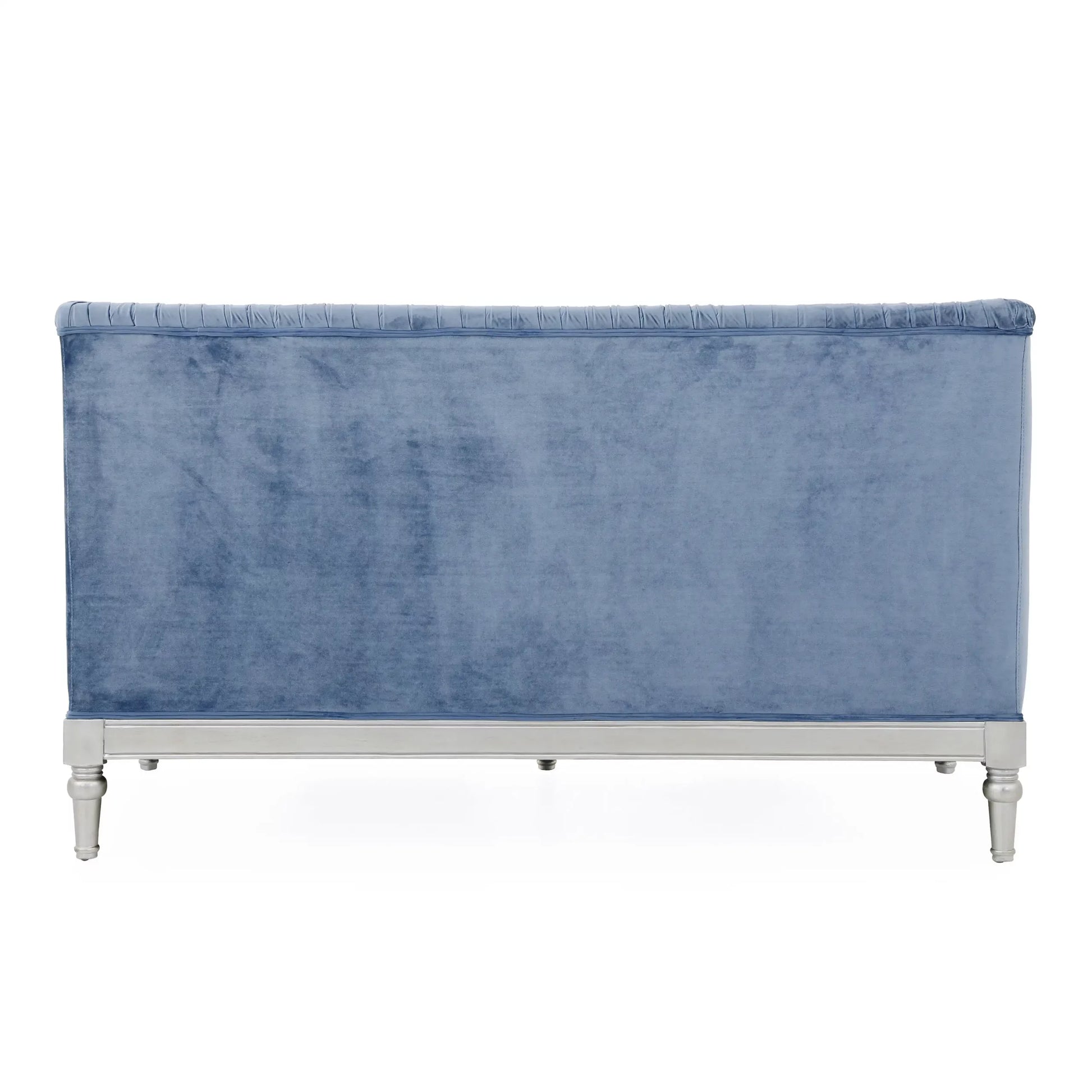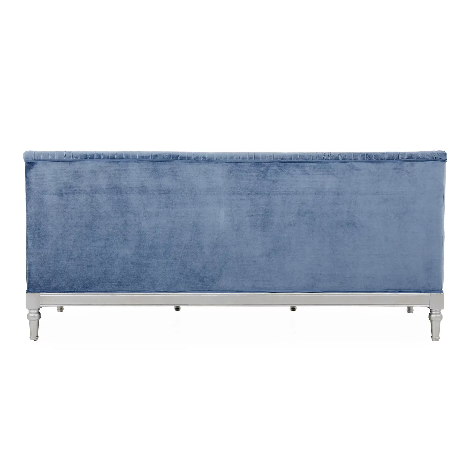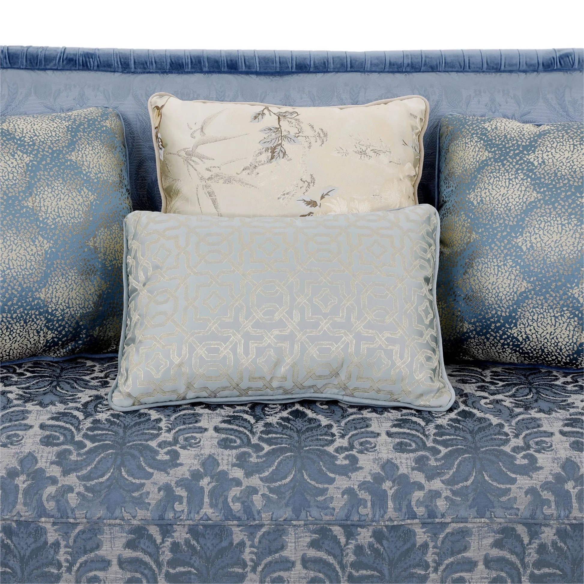This Fluer de lis wood sofa set is a masterpiece that can perfectly fit in the living room of every house and hotel. All the pieces of the fluer de lis collection are entirely hand-made by master craftsmen and are characterized by the use of high-quality wood solid materials and the meticulous care of all the slightest details and 100% hand-carved also handcrafted.Set includes a wooden sofa, a loveseat, and two lounge chairs with an antique silver finish. Fluer de lis carving on curved arms. Upholstery blue floral velvet on the seat and plain blue velvet on the rest of the area. A carved wooden coffee table and two side tables with an antique silver finish are also included in this master set.