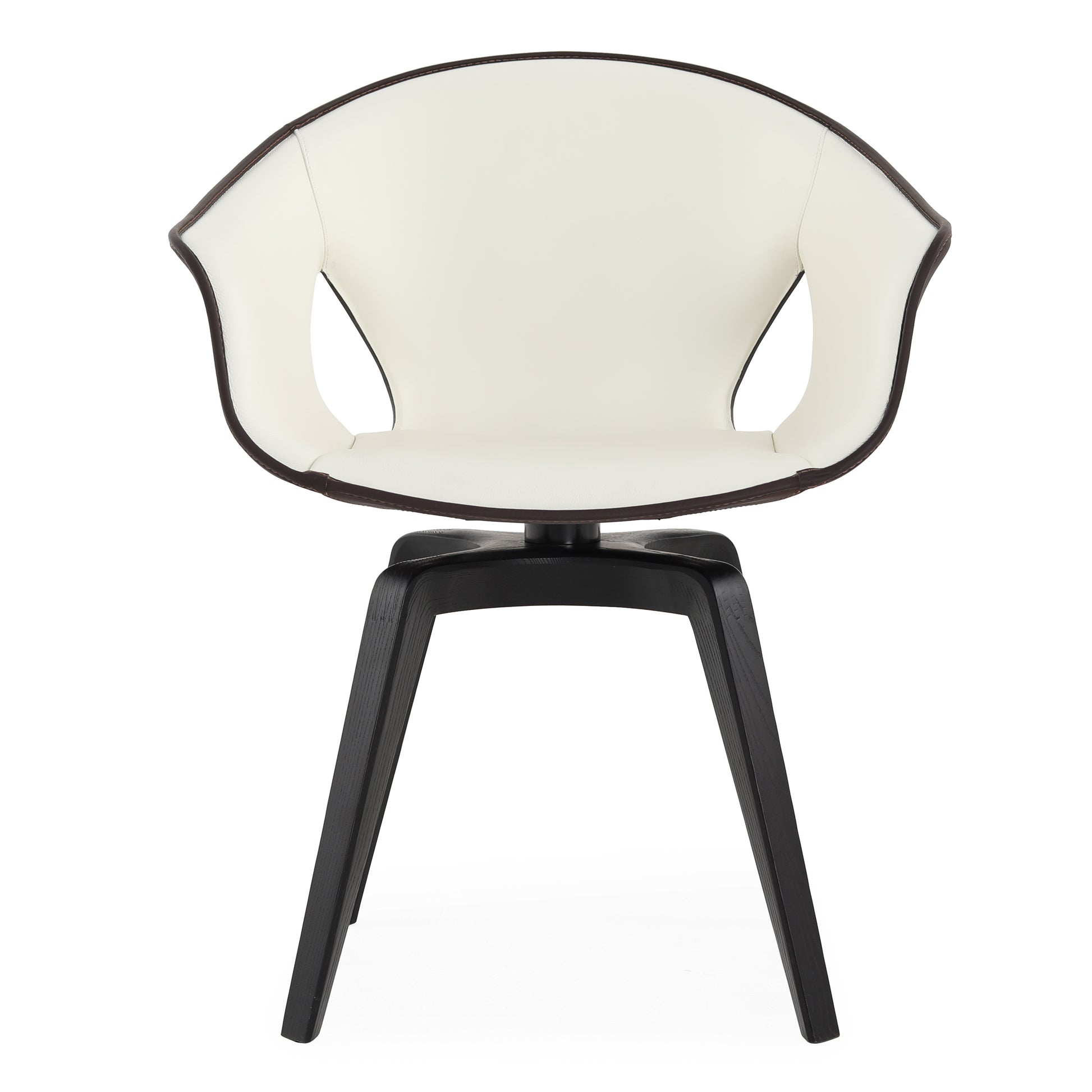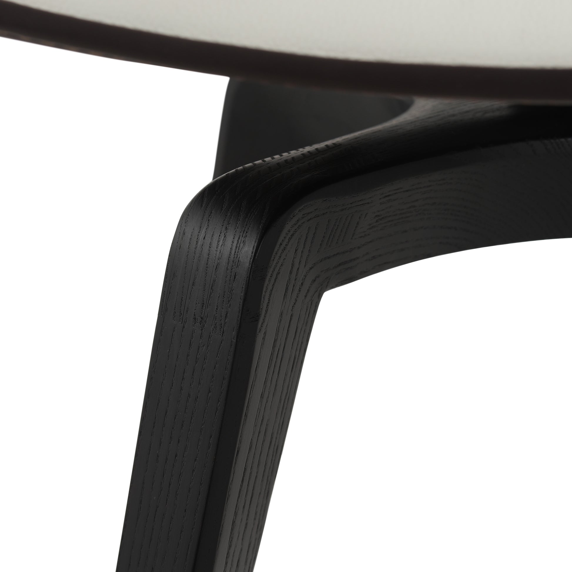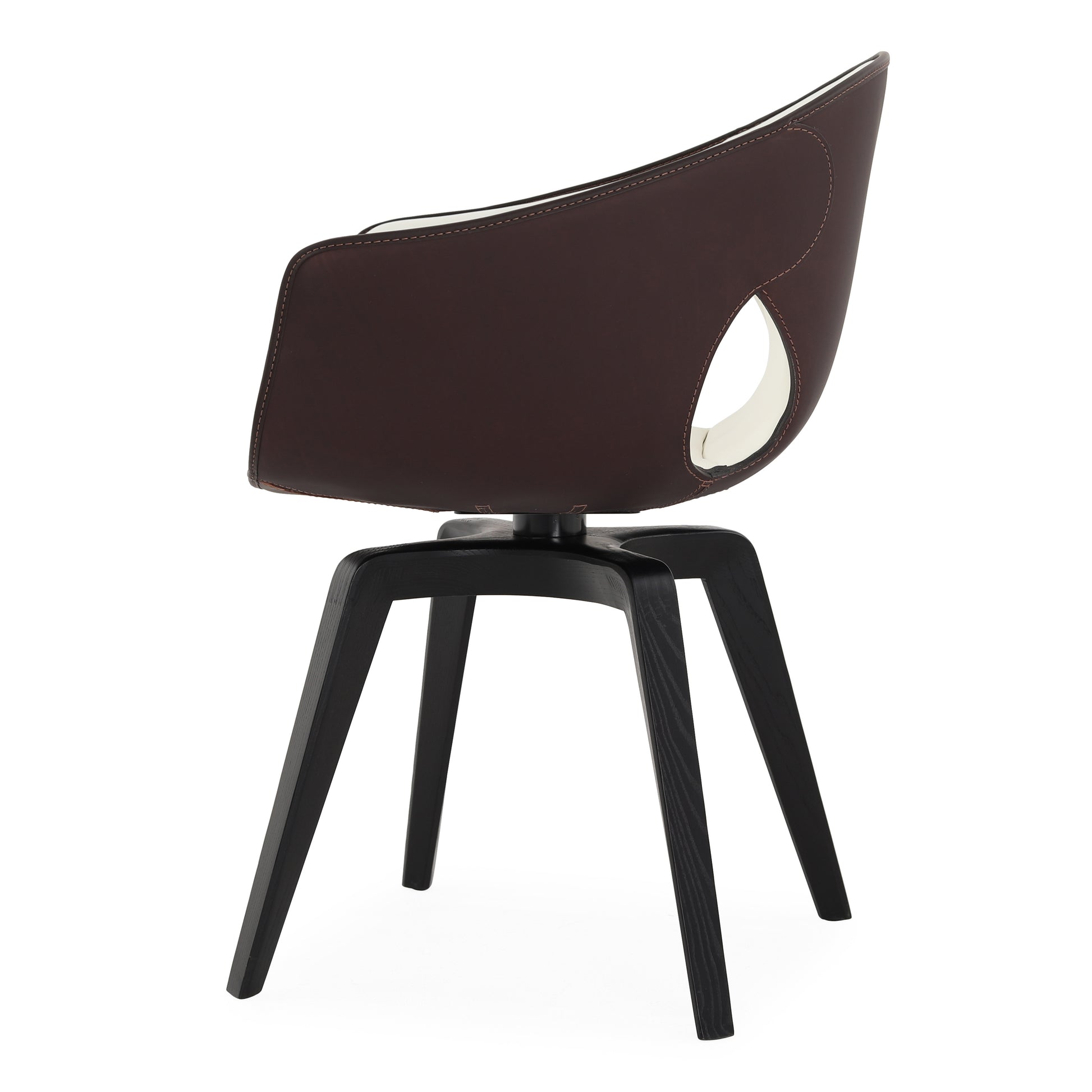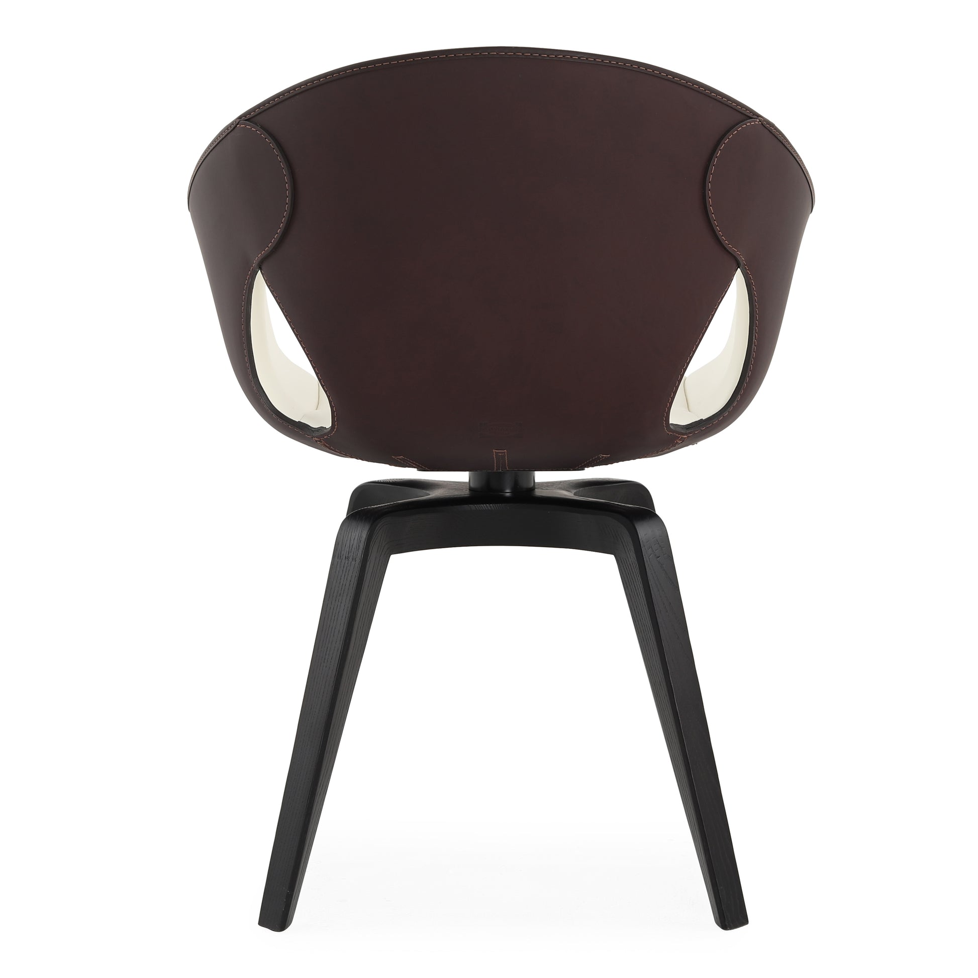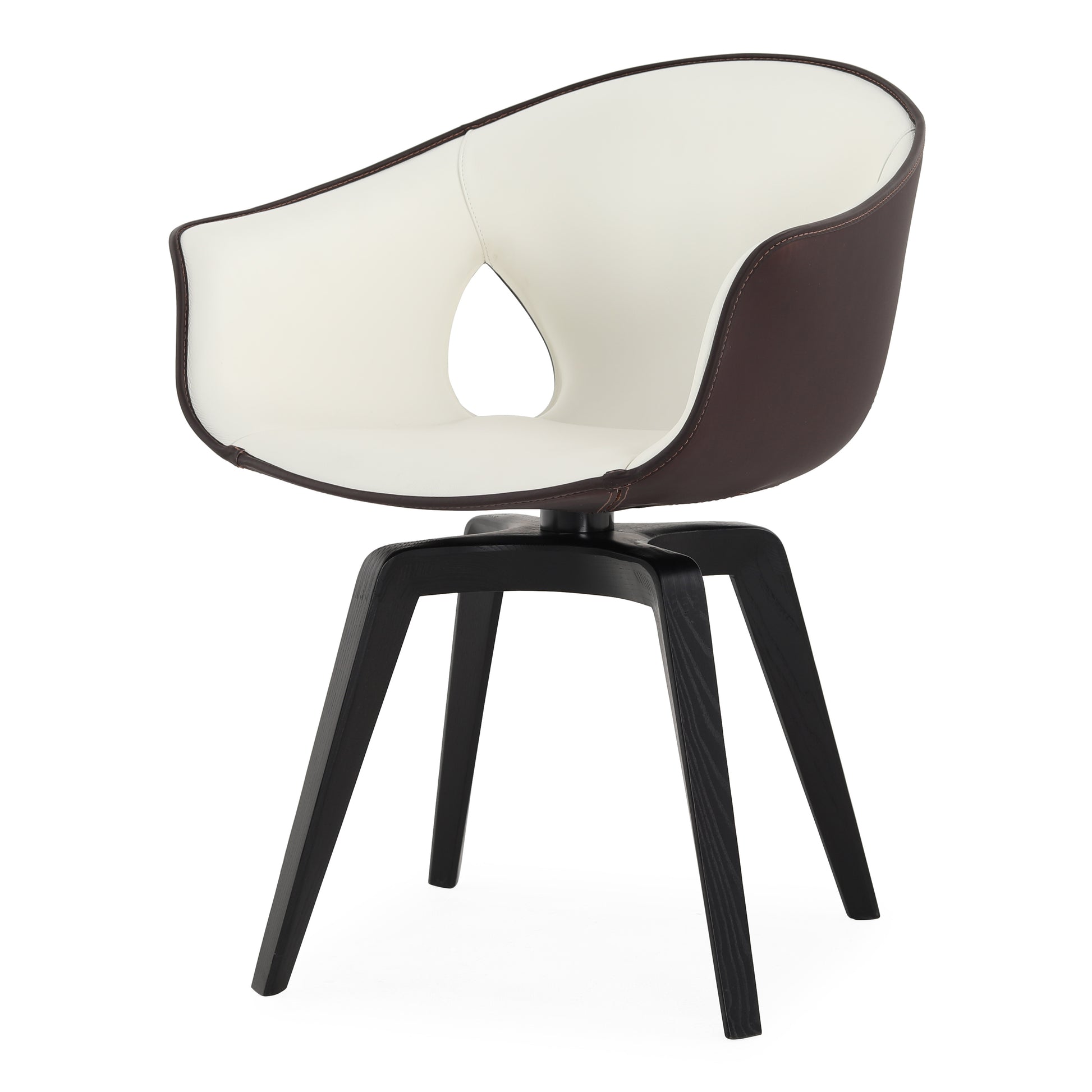 The structure of the Ginger armchair is made from moulded thermoplastic composite polymer. The seat is padded with polyurethane foam. - inside chair upholstered in Pelle Frau® leather The base of the Ginger armchair is made from solid ash with hook support in black painted steel. It is available in the Fixed or Swivel versions with “return” mechanism which enables the armchair to rotate 360° and return to its starting position. The base is wenge stained ash