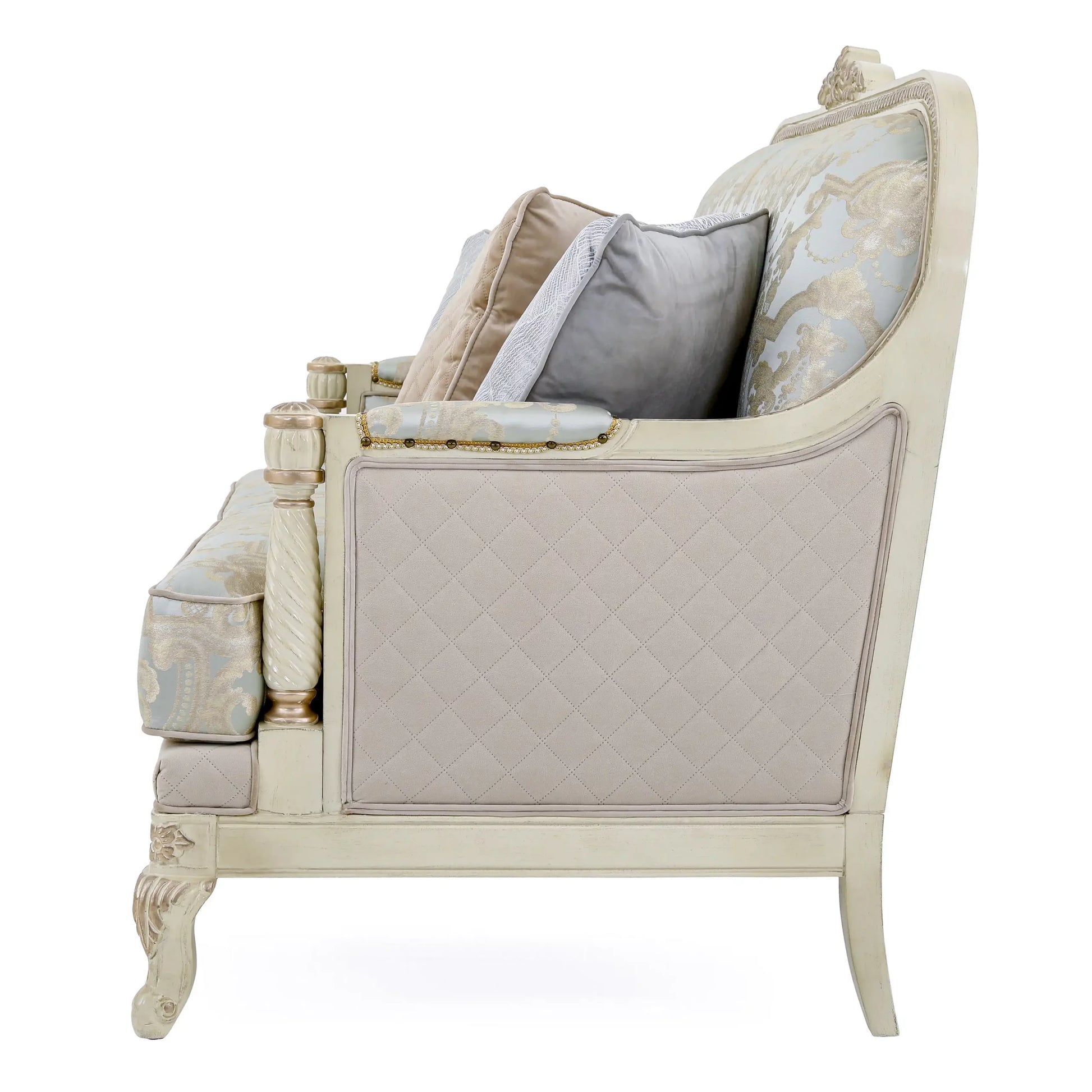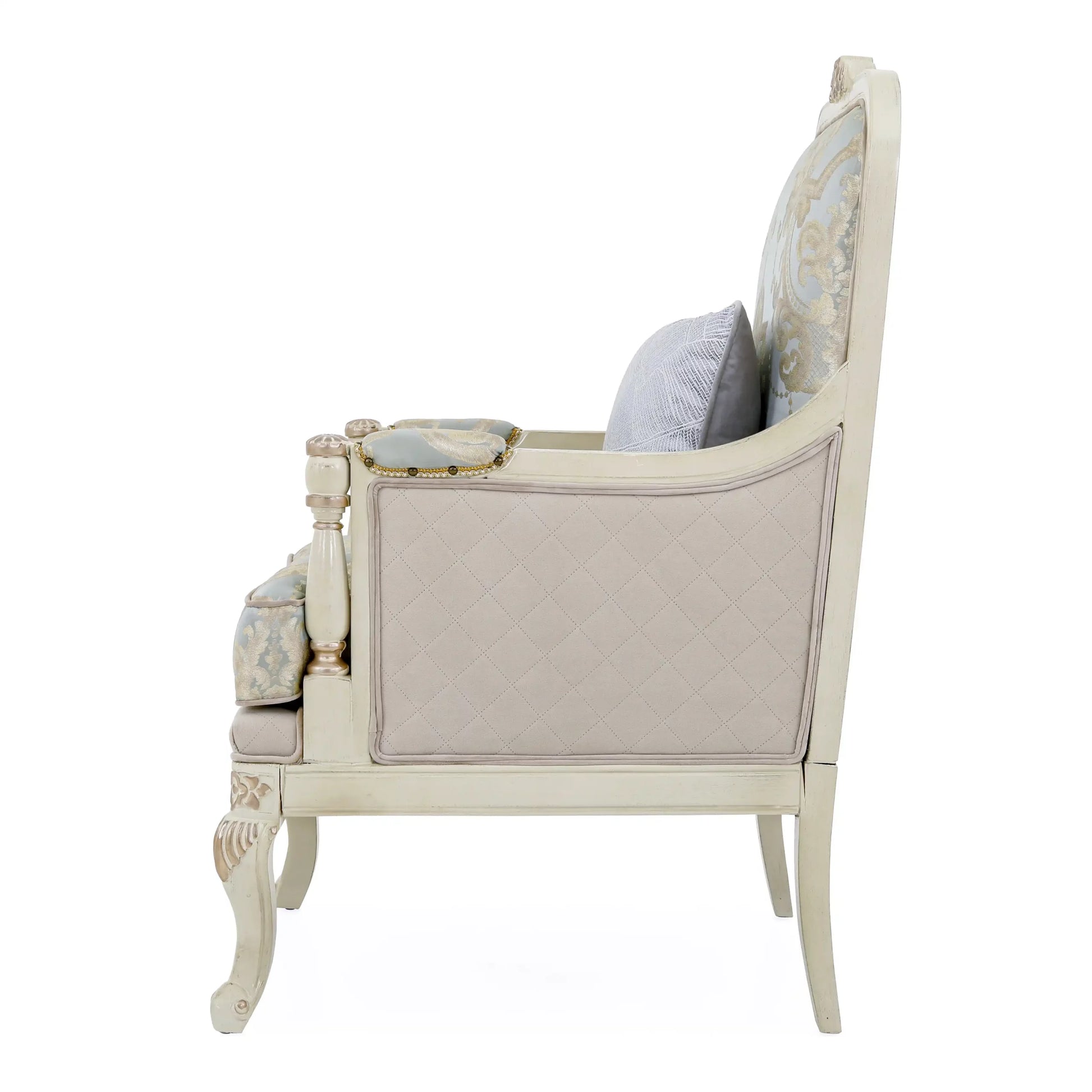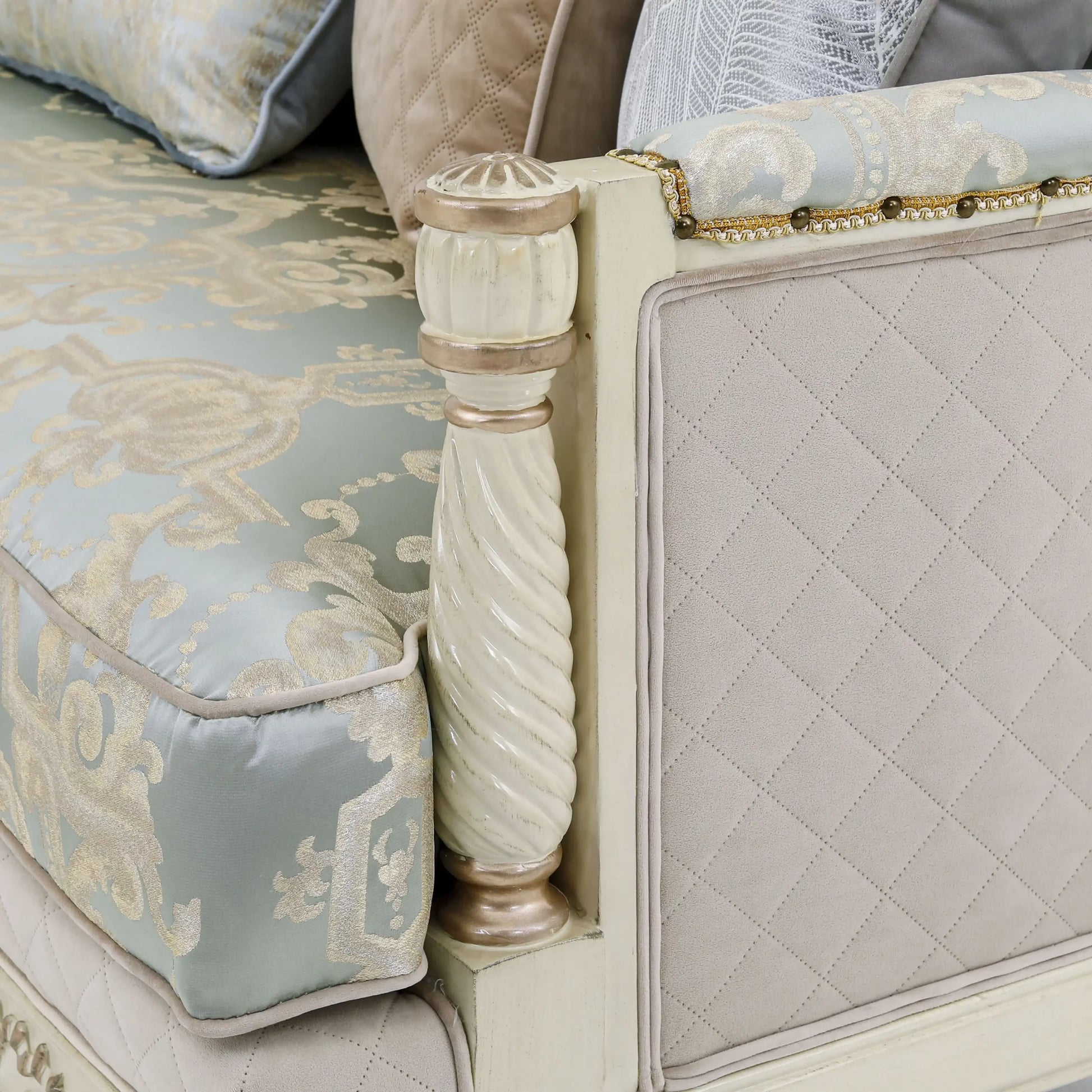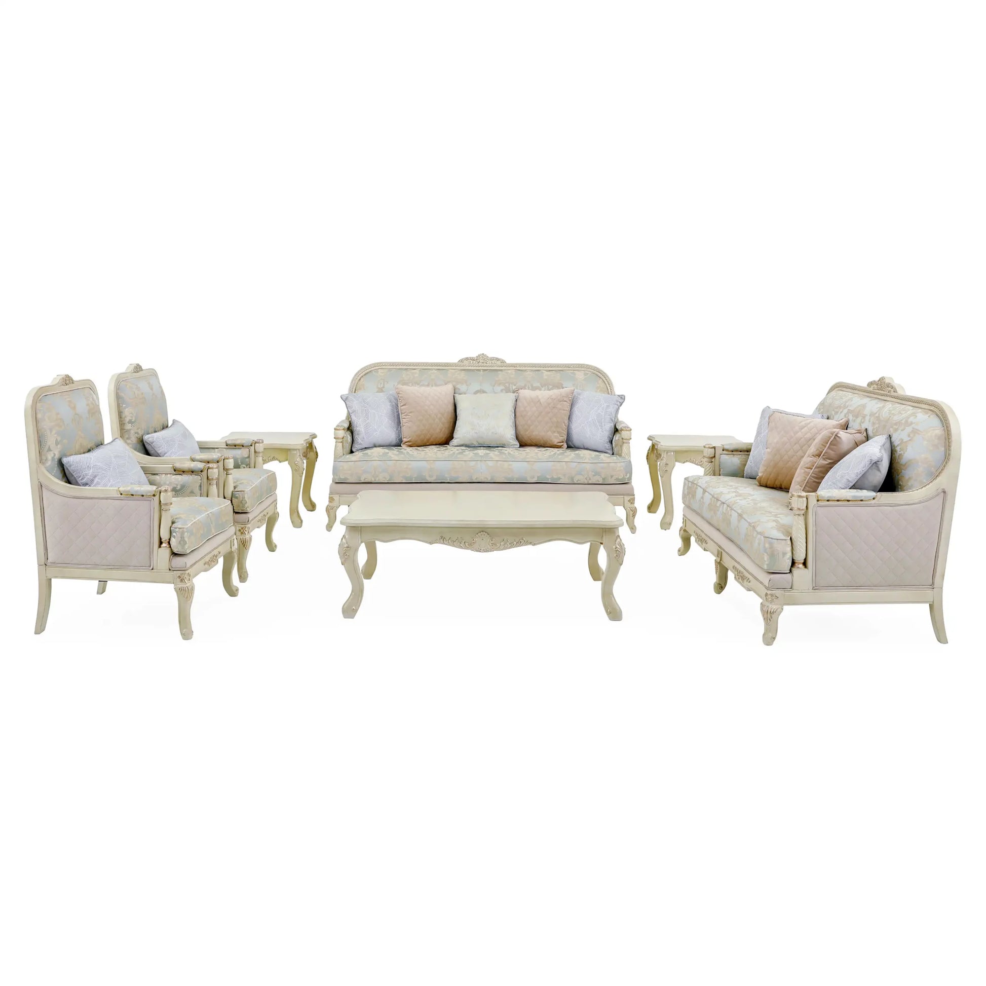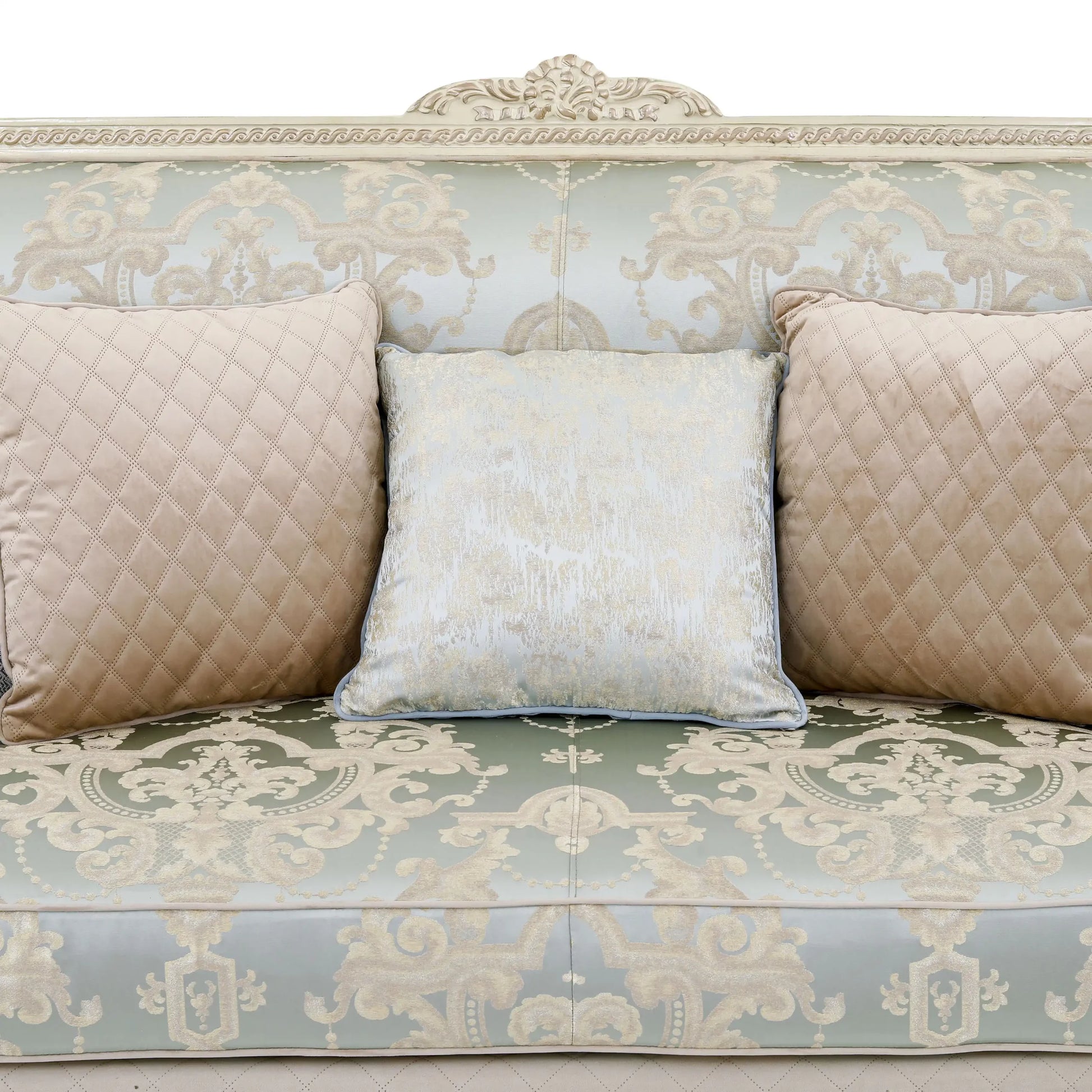 This Haven wood sofa set is a masterpiece that can perfectly fit in the living room of every house and hotel. All the pieces of the Haven collection are entirely hand-made by master craftsmen and are characterized by the use of high-quality wood solid materials and the meticulous care of all the slightest details and 100% hand-carved also handcrafted.Set includes a wooden sofa a loveseat and two lounge chairs with pastel green finish antique silver on carvings. Upholstery: Woven damask inside and matching plain diamond-stitched on external area and deck. A carved wooden coffee table and two side tables with a pastel green finish are also included in this master set.