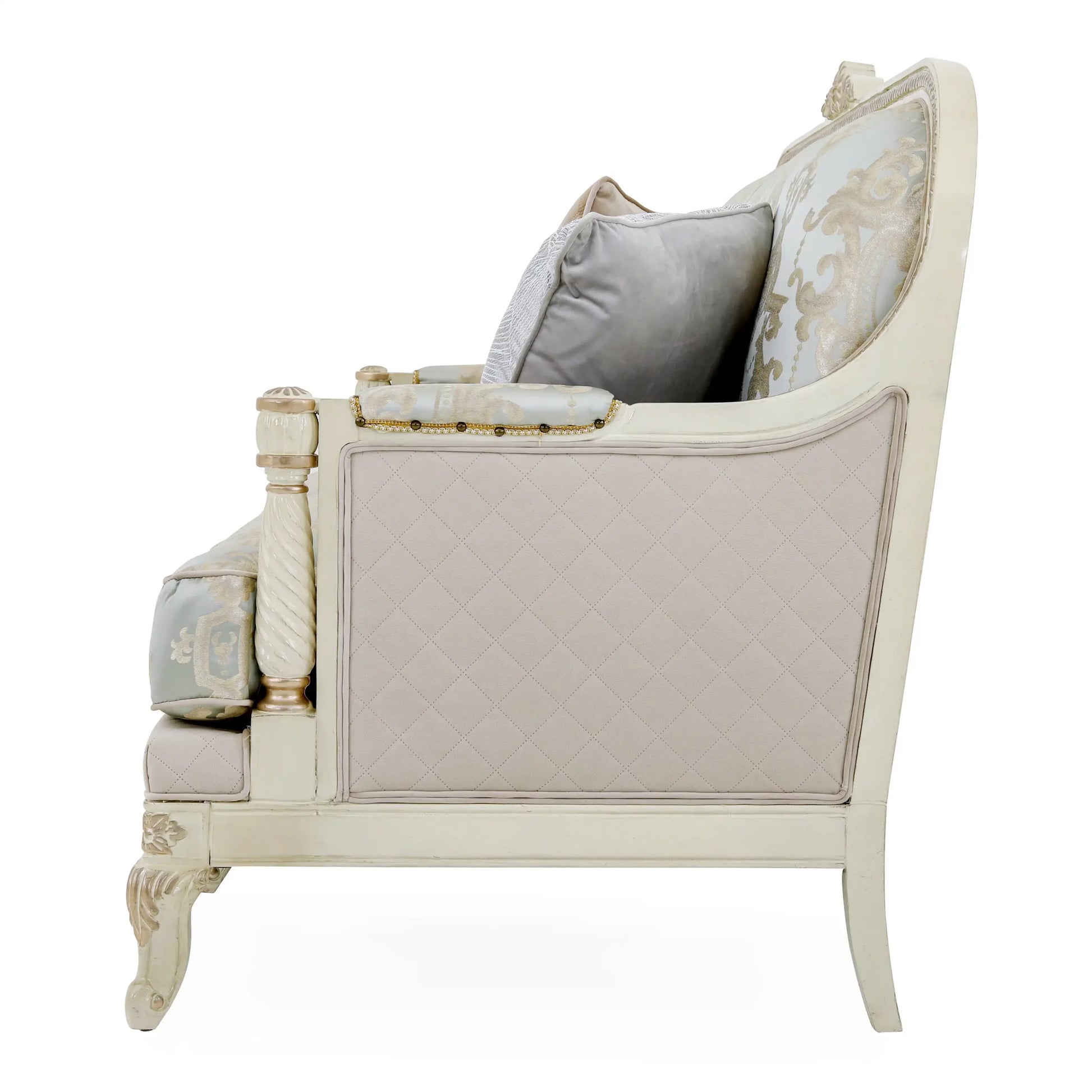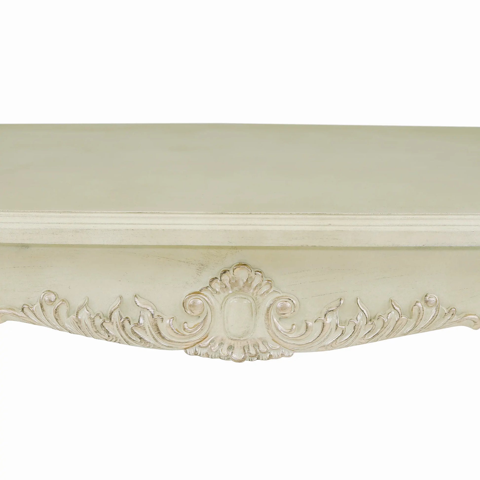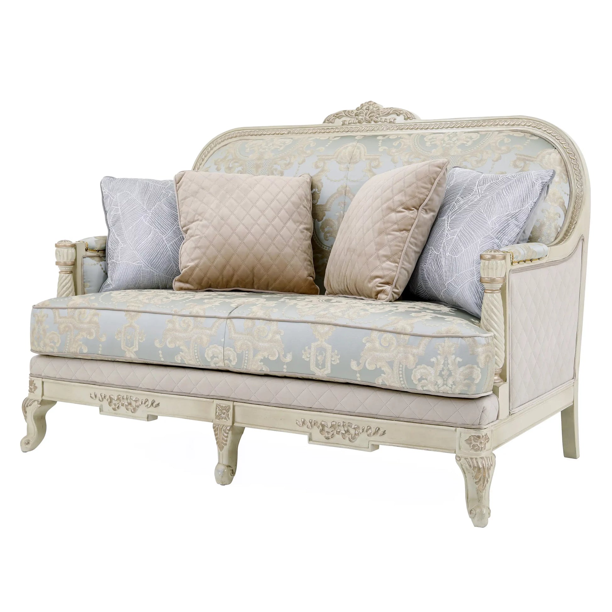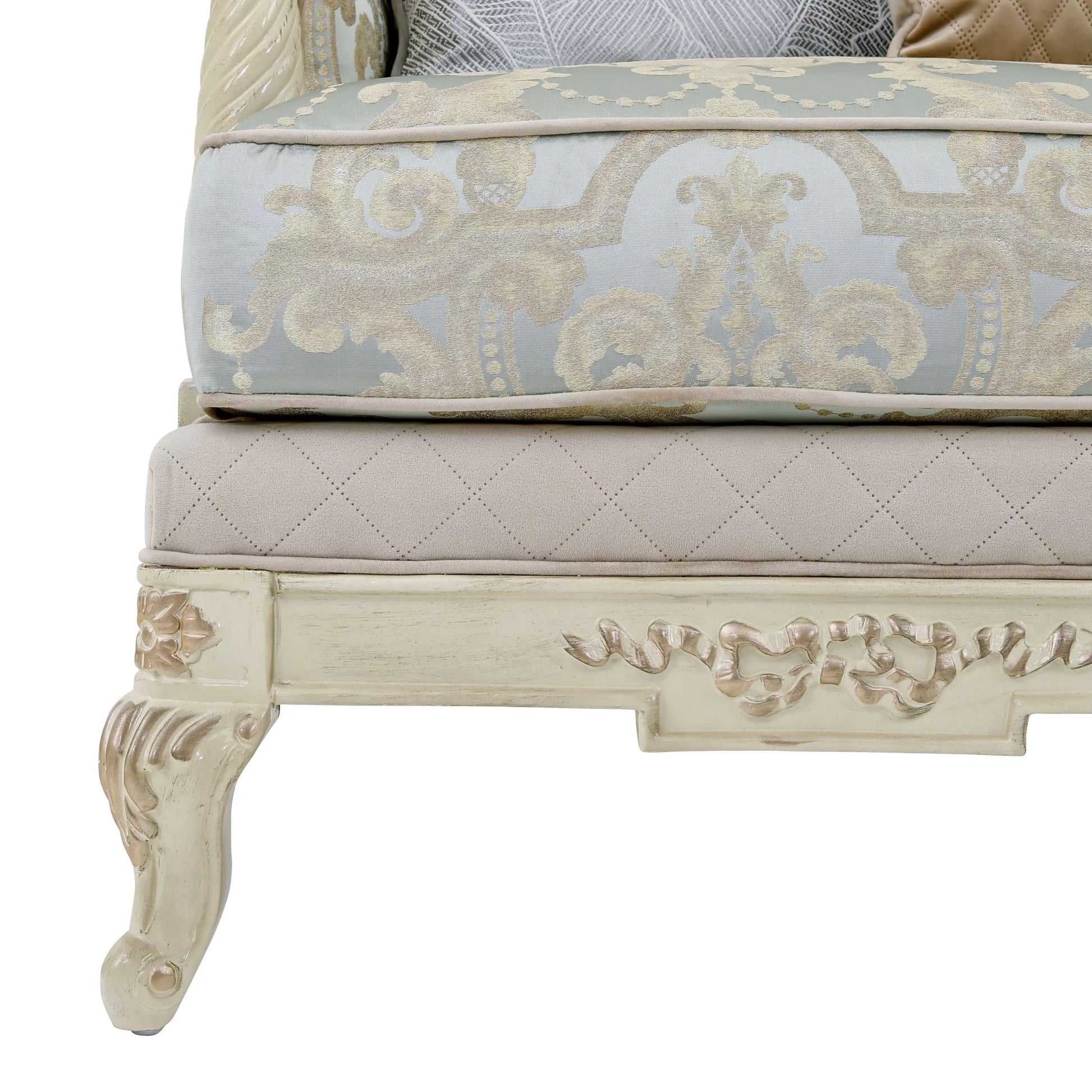 This Haven wood sofa set is a masterpiece that can perfectly fit in the living room of every house and hotel. All the pieces of the Haven collection are entirely hand-made by master craftsmen and are characterized by the use of high-quality wood solid materials and the meticulous care of all the slightest details and 100% hand-carved also handcrafted.Set includes a wooden sofa a loveseat and two lounge chairs with pastel green finish antique silver on carvings. Upholstery: Woven damask inside and matching plain diamond-stitched on external area and deck. A carved wooden coffee table and two side tables with a pastel green finish are also included in this master set.