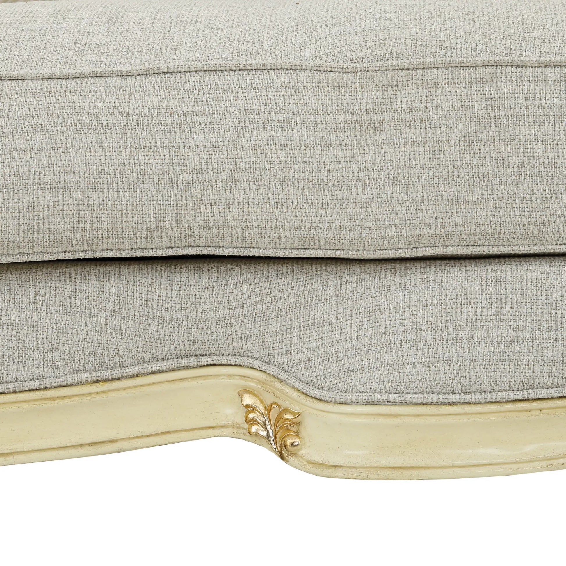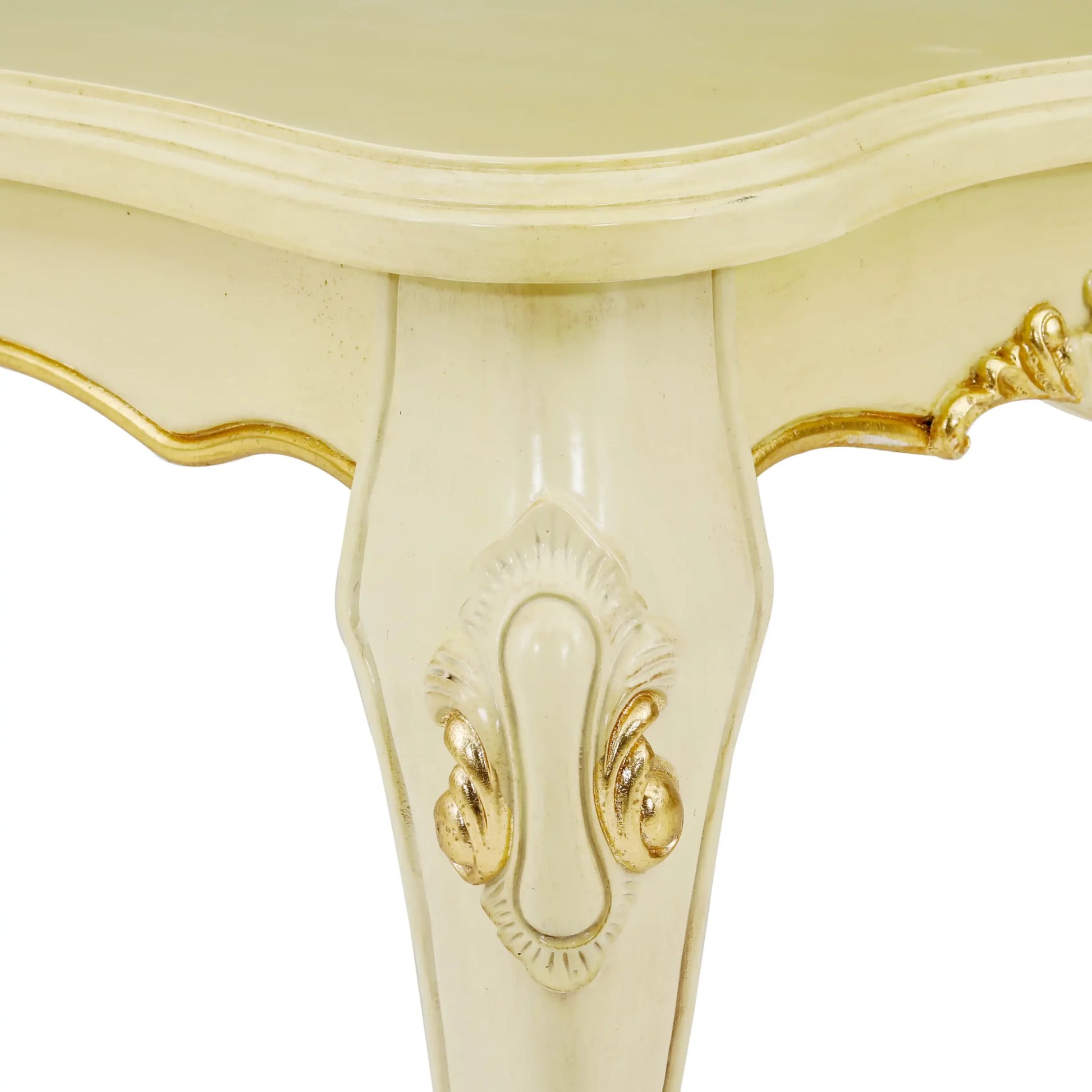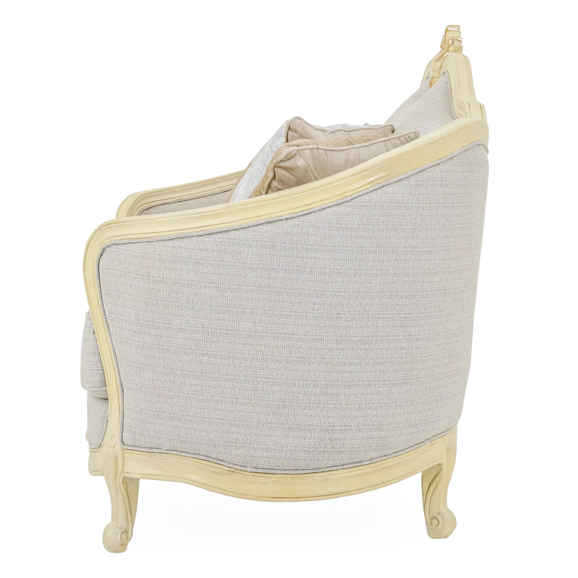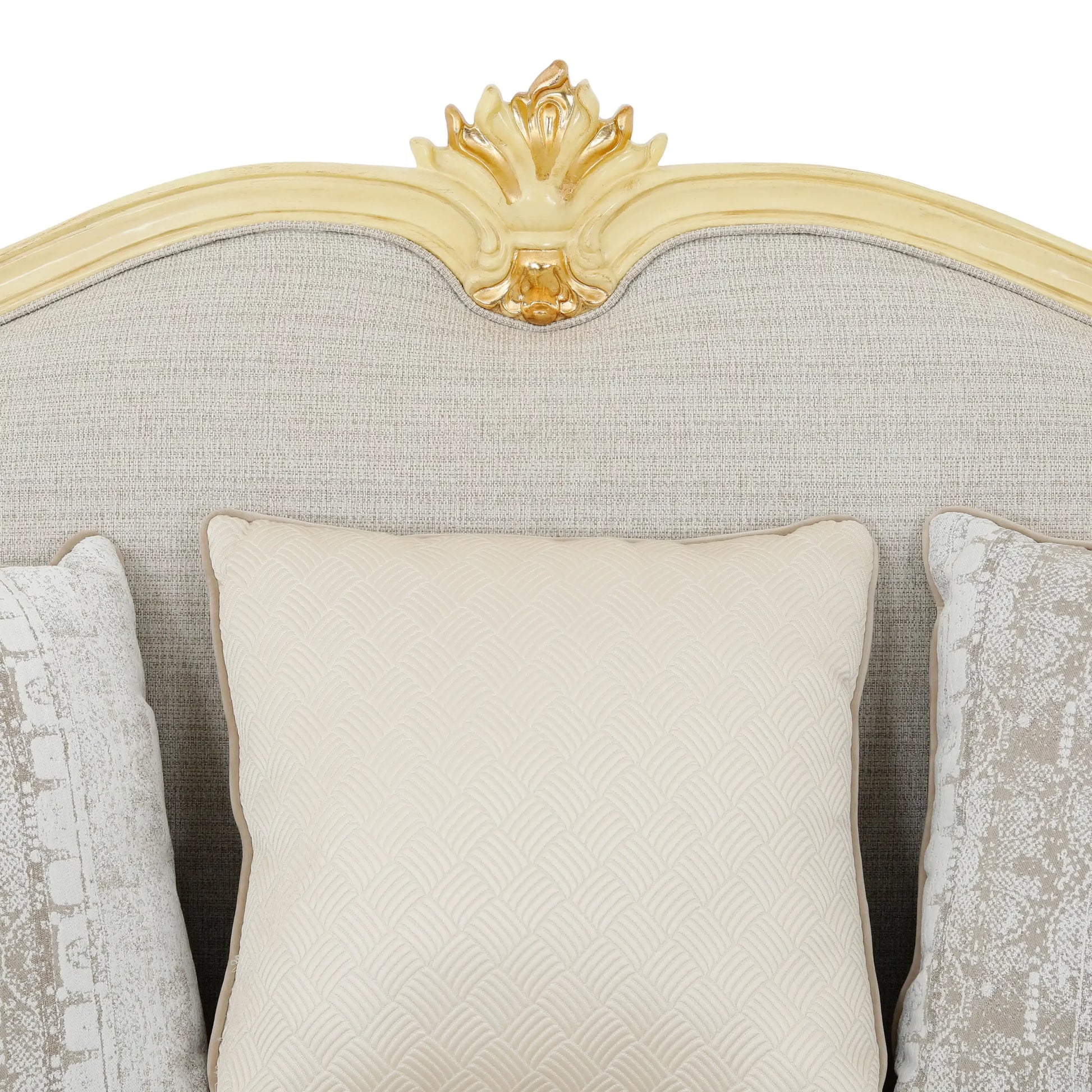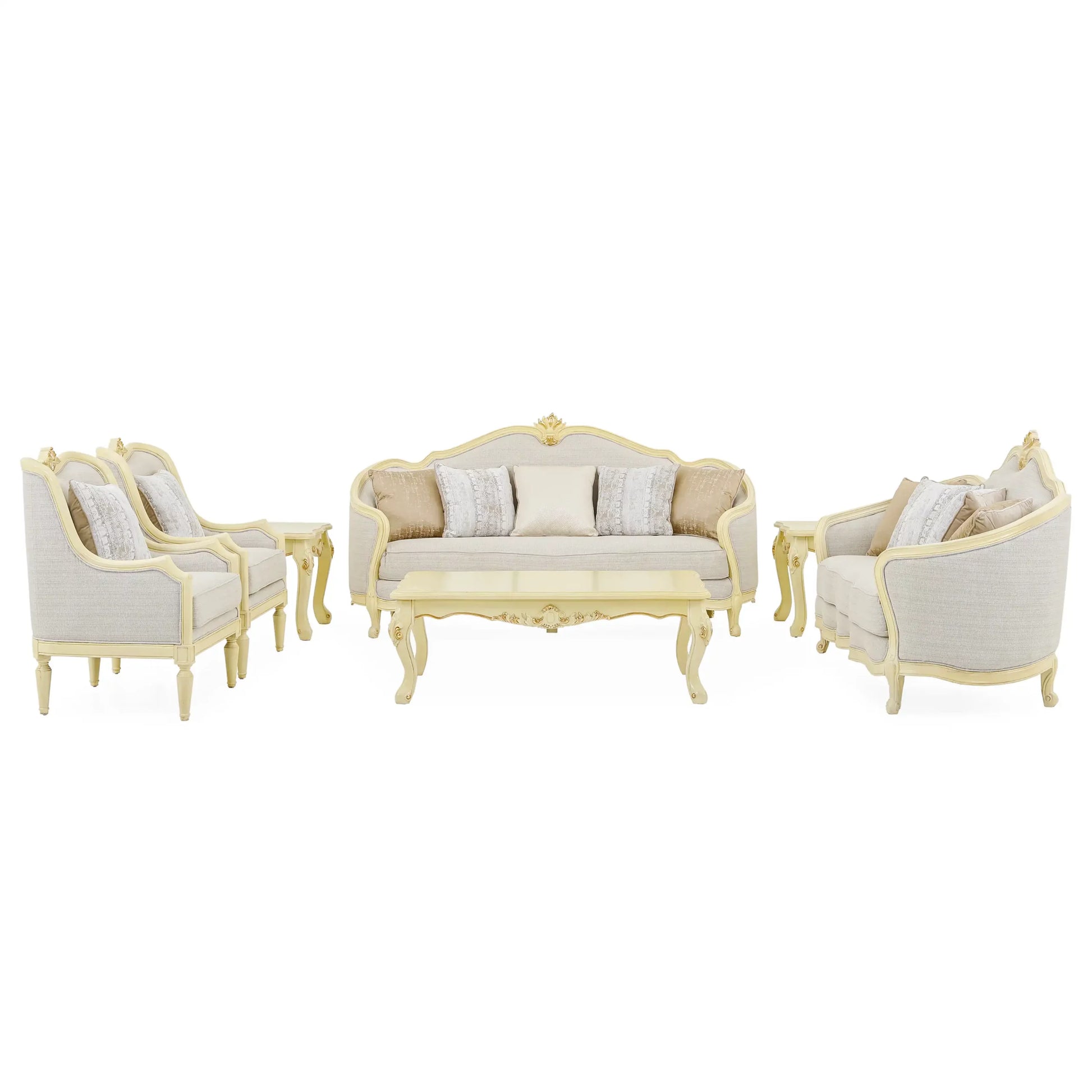 This Isabelle wood sofa set is a masterpiece that can perfectly fit in the living room of every house and hotel. All the pieces of the Isabella collection are entirely hand-made by master craftsmen and are characterized by the use of high quilty wood solid materials and the meticulous care of all the slightest details and 100% hand-carved also handcrafted. Set includes a wooden sofa, a loveseat, and two lounge chairs with an antique beige finish. Gold on carvings, linen upholstery.A carved wooden coffee table and two side tables with an antique beige finish are also included in this master set.