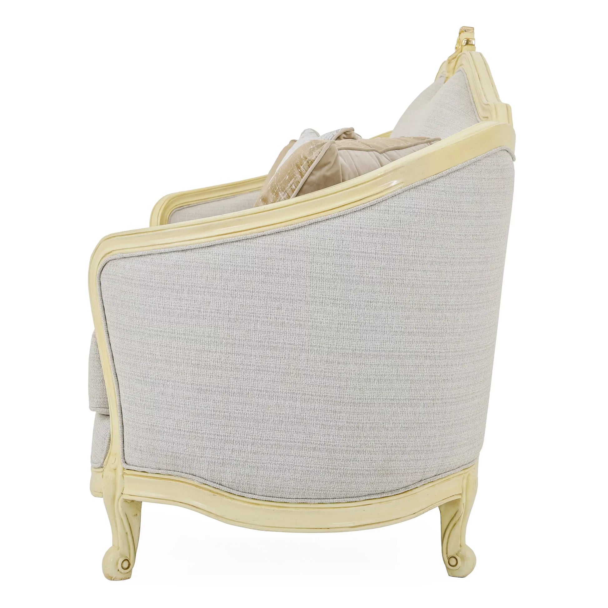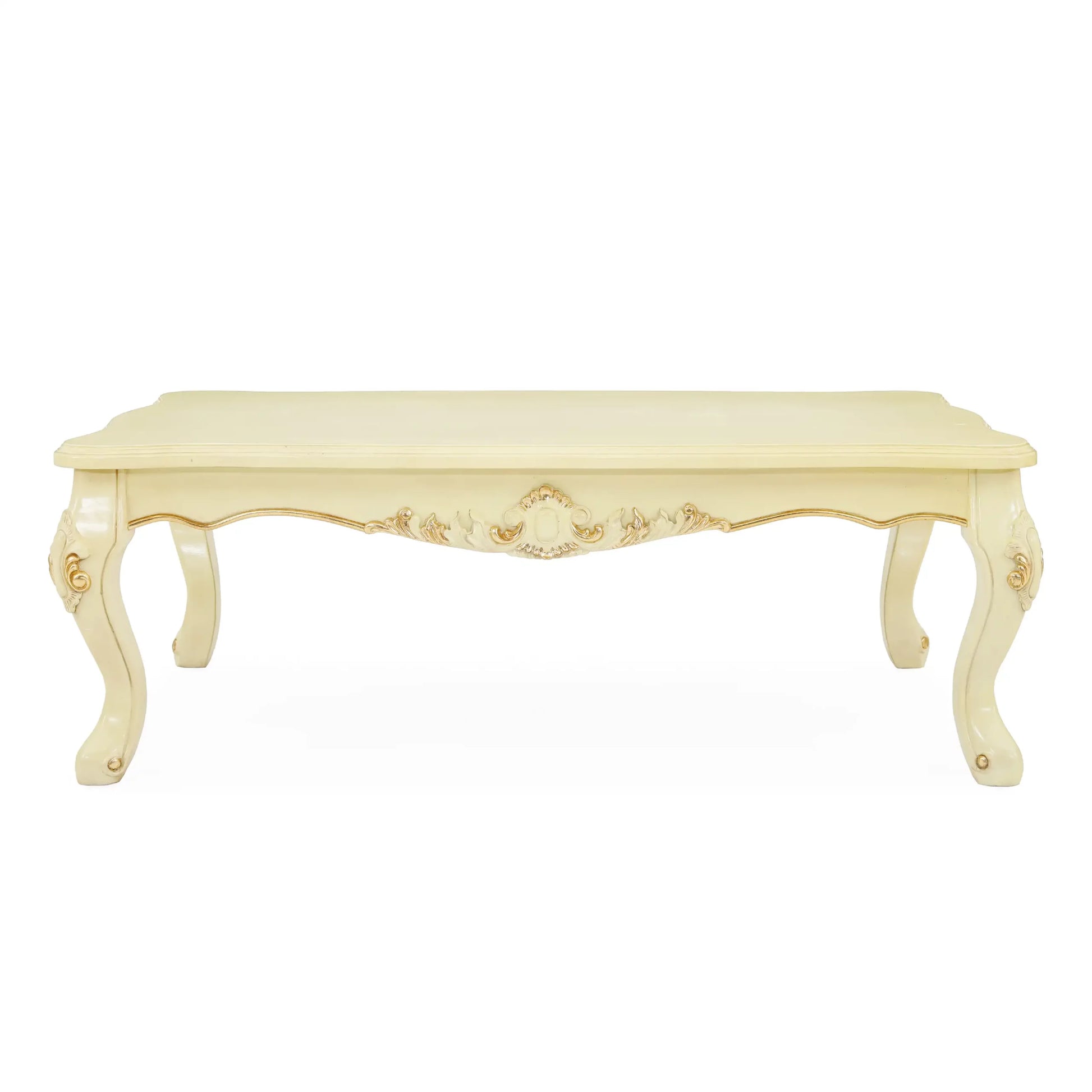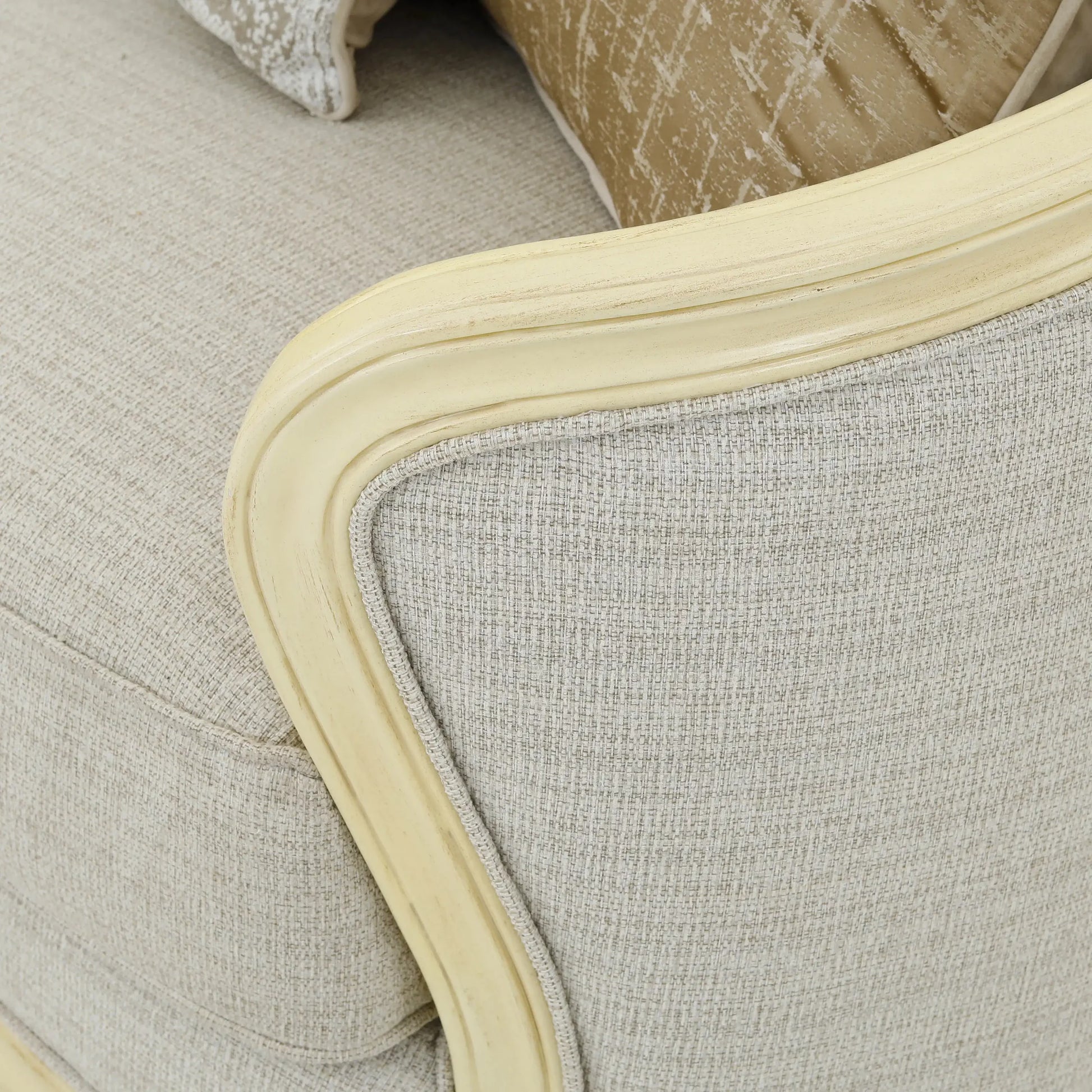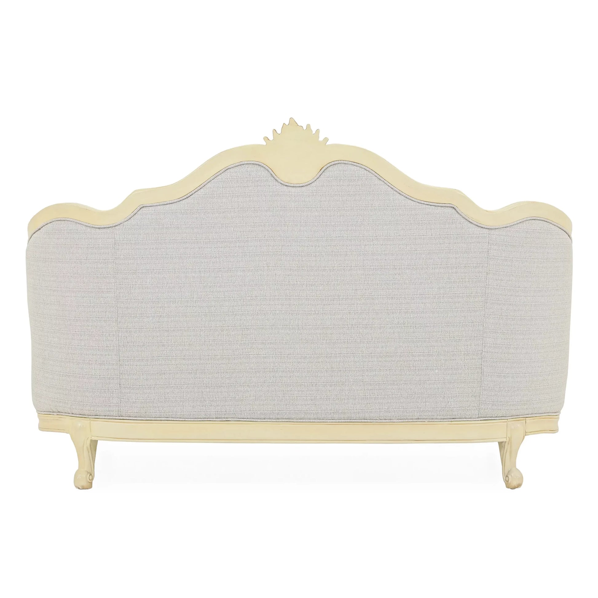 This Isabelle wood sofa set is a masterpiece that can perfectly fit in the living room of every house and hotel. All the pieces of the Isabella collection are entirely hand-made by master craftsmen and are characterized by the use of high quilty wood solid materials and the meticulous care of all the slightest details and 100% hand-carved also handcrafted. Set includes a wooden sofa, a loveseat, and two lounge chairs with an antique beige finish. Gold on carvings, linen upholstery.A carved wooden coffee table and two side tables with an antique beige finish are also included in this master set.