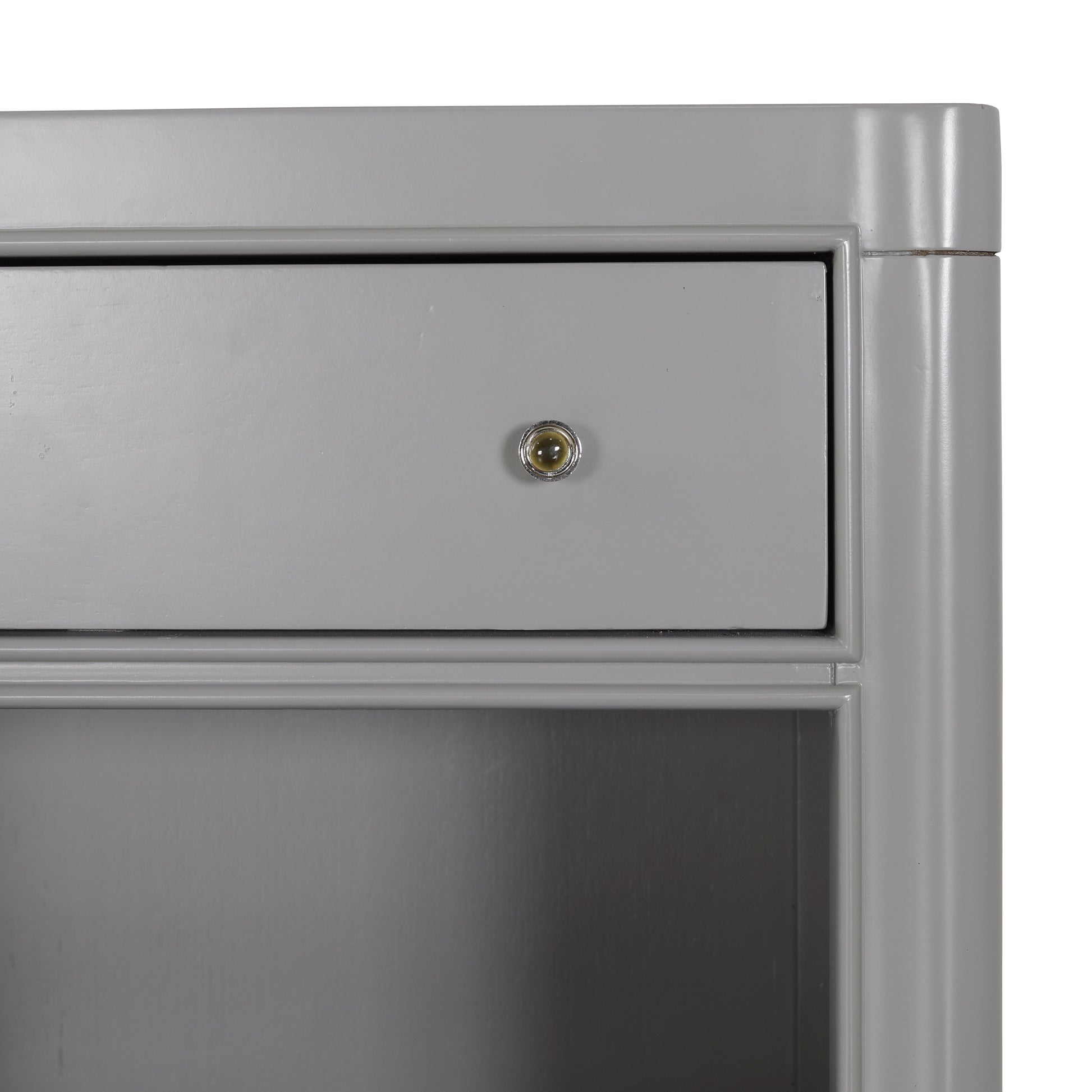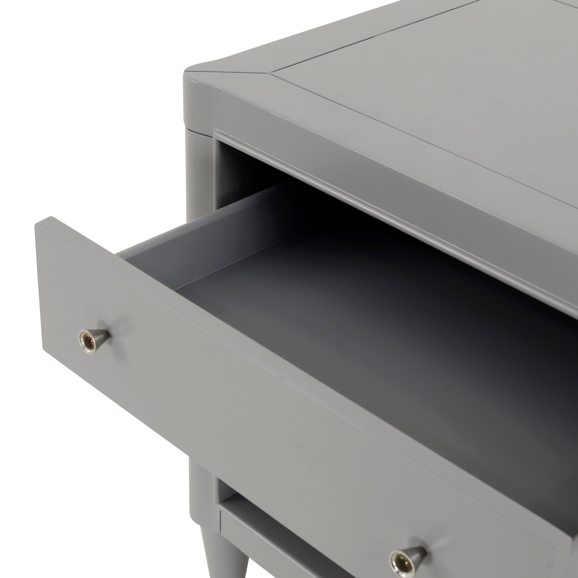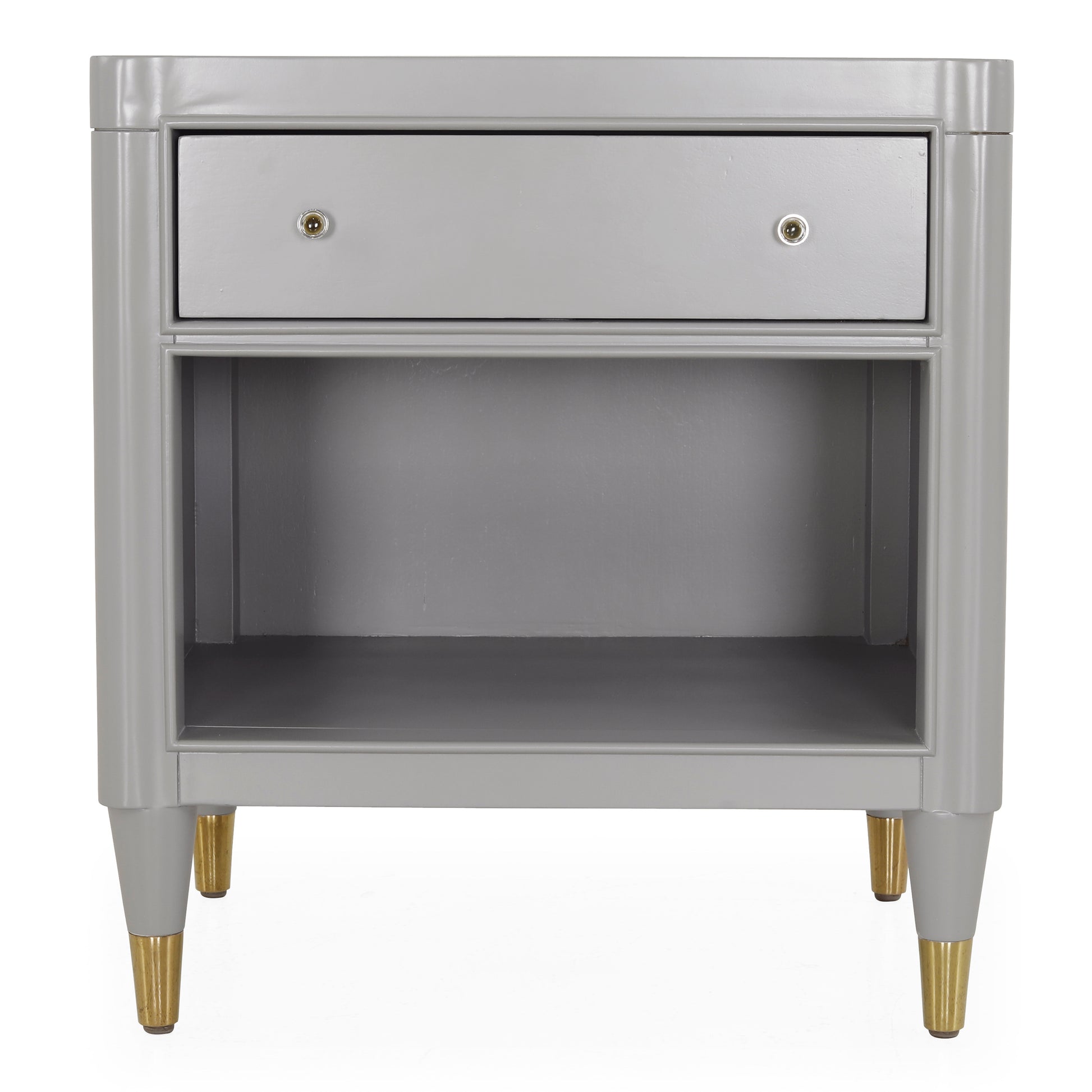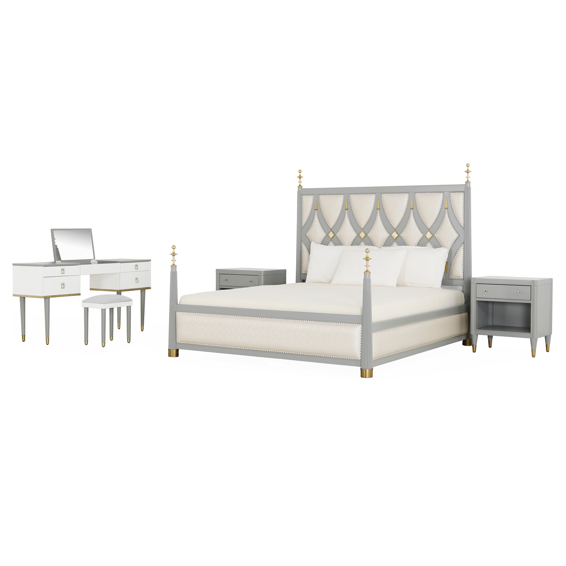 An elegant nightstand that combines modern simplicity with sophisticated classic touches. It features a durable beech wood frame in a light gray color that adds calmness and elegance to the design. The table includes a top drawer with metal handles plus an open bottom shelf providing practical storage space. The table rests on a base of four slender legs ending in golden accents that add a luxurious look. This nightstand is a perfect piece that combines modern aesthetics with refined classicism. The luxury bedroom set includes a king-size bed, two nightstands, and a vanity with a mirror.