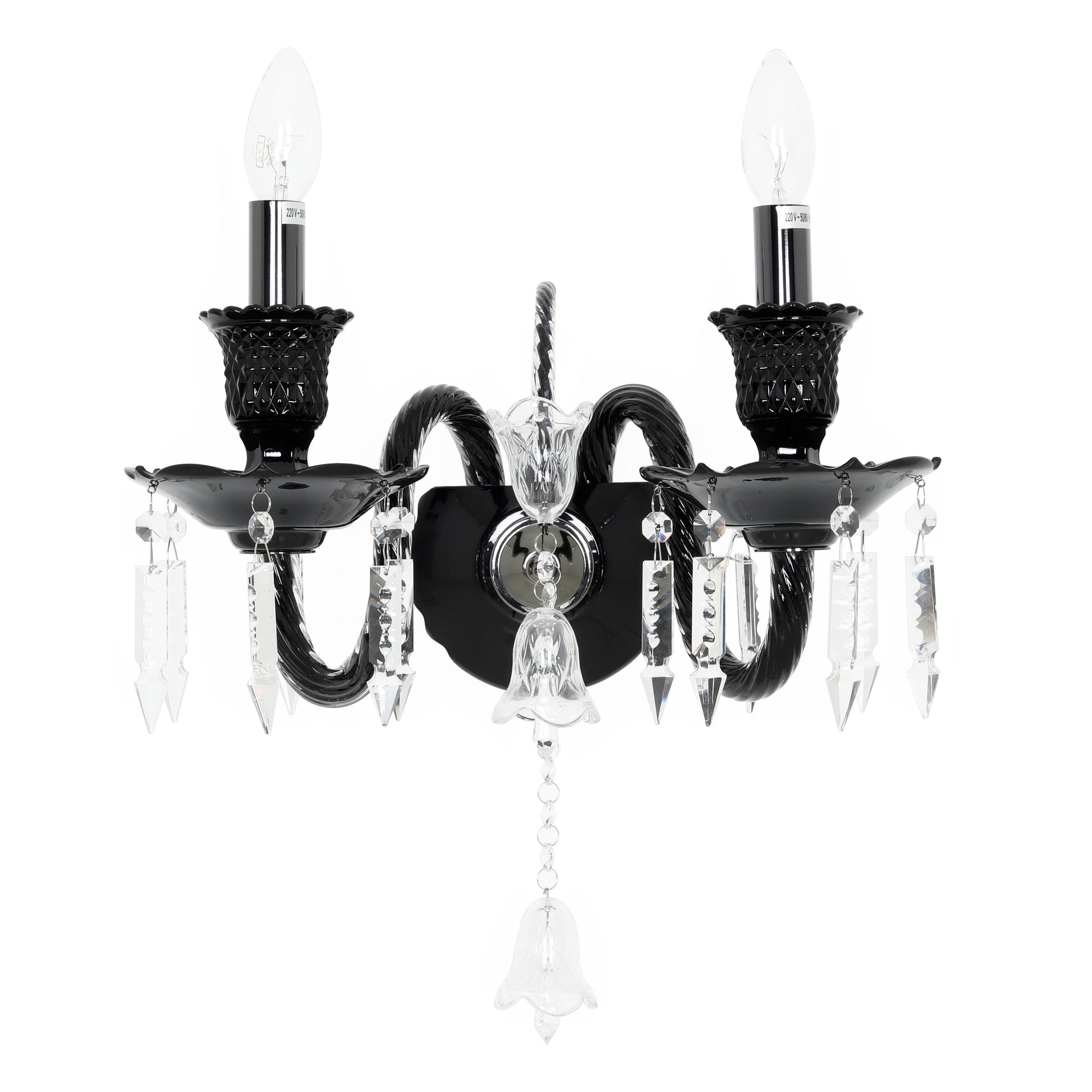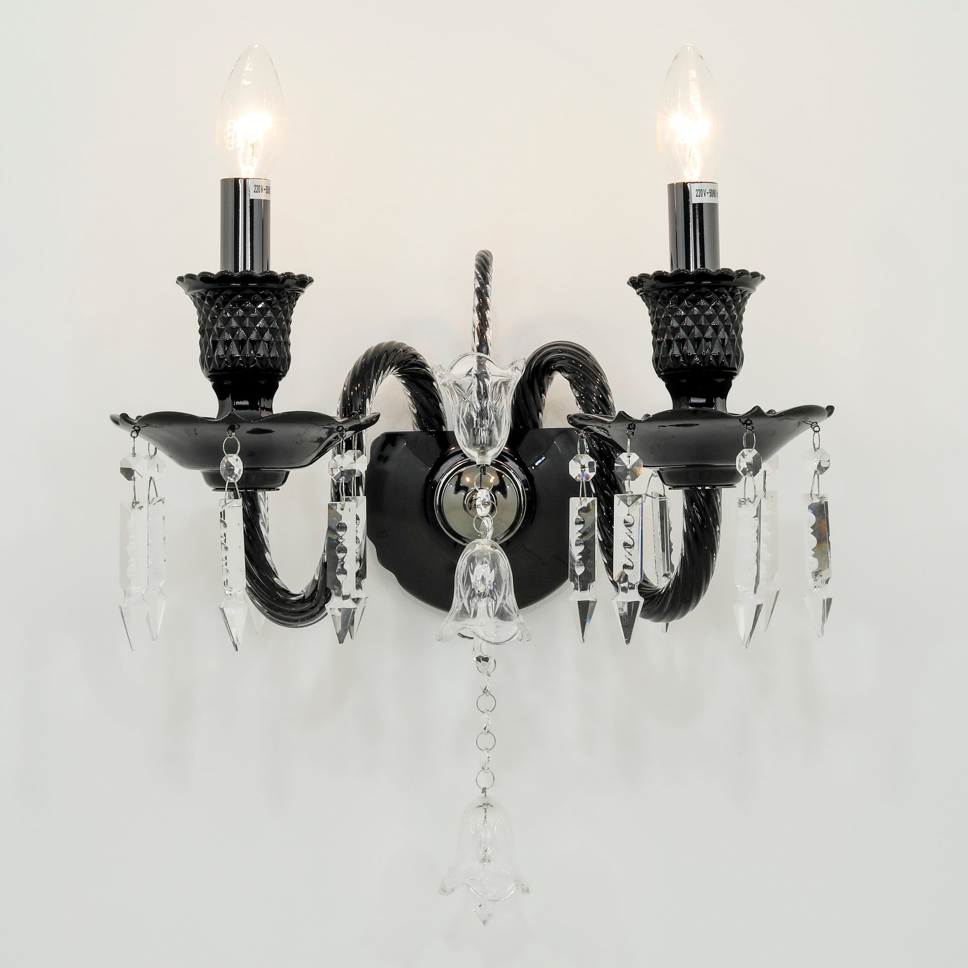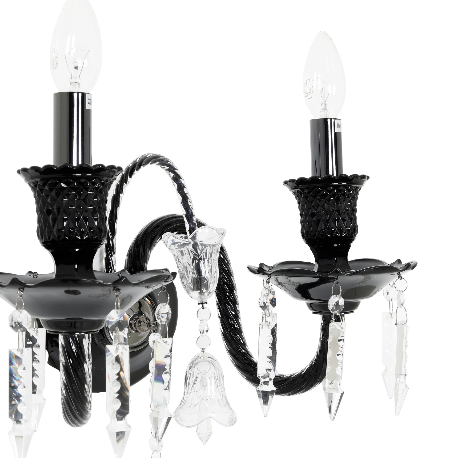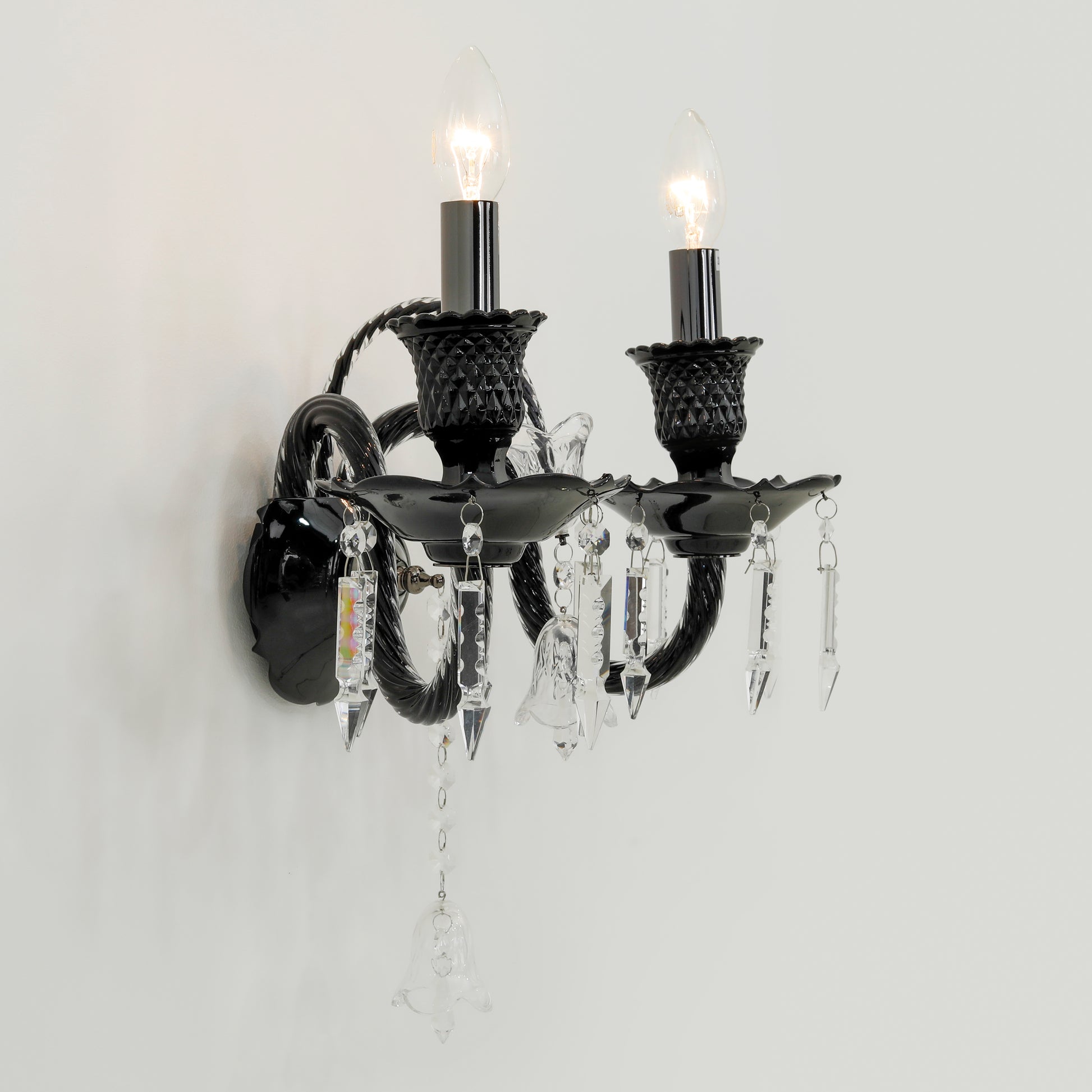 A wall lamp with an elegant classic design, featuring a body of deep black glass. Hanging clear crystals add a touch of subtle luxury, making it a distinctive piece that enhances the wall's elegance and gives the decor a sophisticated and attractive character.