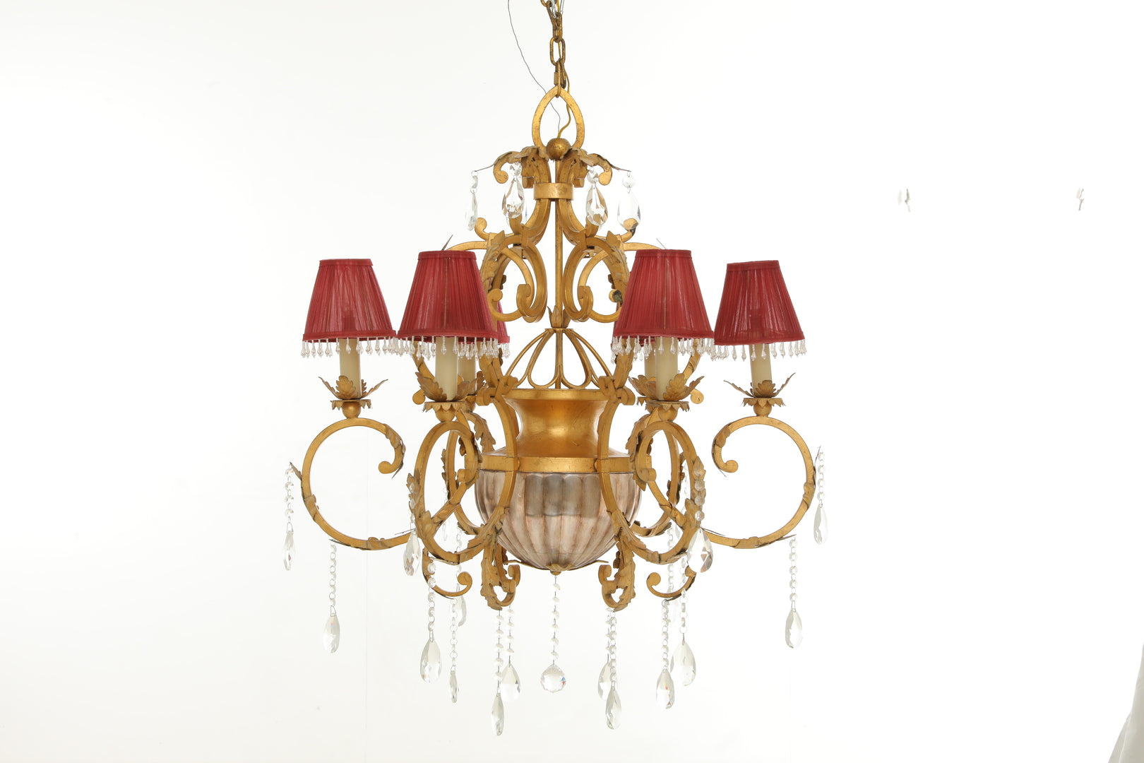 A luxurious crystal and iron chandelier with an elegant classic design overflowing with luxury and sophistication. The chandelier features a gilded iron frame adorned with curved motifs that bestow a regal character. It is fitted with luxurious silk lampshades in a captivating burgundy color, embellished with elegant beads that enhance the beauty of the details. Clear crystal drops hang from it, reflecting light with charming brilliance, while a smooth glass bowl in the center softens the light and elevates the grandeur of the design. This chandelier is a perfect centerpiece for adding a luxurious touch to living rooms, reception halls, and high-end spaces.